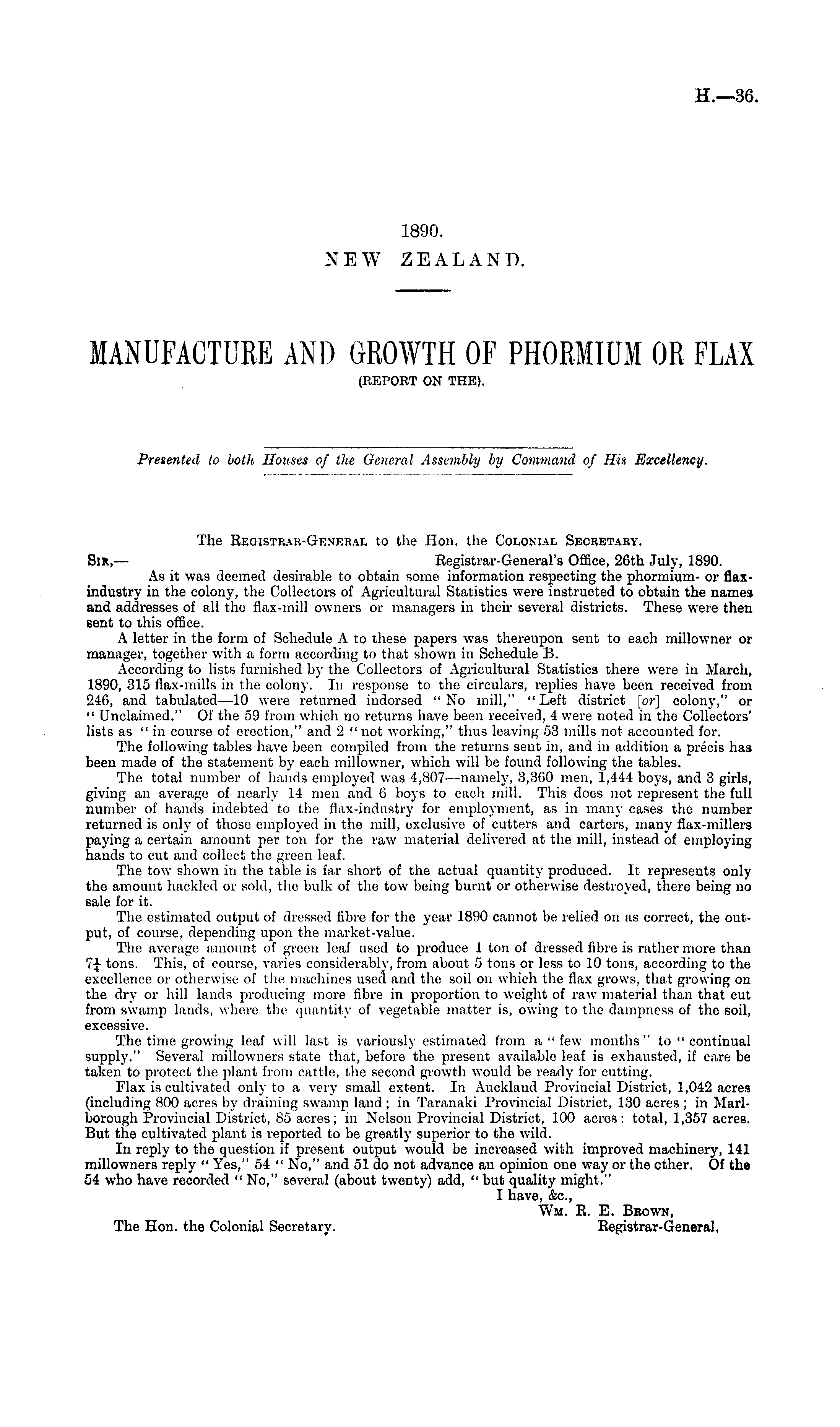 The Registrar-General to the Hon. the Colonial Secretary. Sir,— Registrar-General's Office, 26th July, 1890. As it was deemed desirable to obtain some information respecting the phormium- or flaxindustry in the colony, the Collectors of Agricultural Statistics were instructed to obtain the names and addresses of all the flax-mill owners or managers in their several districts. These were then Bent to this office. A letter in the form of Schedule A to these papers was thereupon sent to each millowner or manager, together with a form according to that shown in Schedule B. According to lists furnished by the Collectors of Agricultural Statistics there were iv March, 1890, 315 flax-mills in the colony. In response to the circulars, replies have been received from 246, and tabulated—lo were returned indorsed "No mill," " Left district [or] colony," or " Unclaimed." Of the 59 from which no returns have been received, 4 were noted in the Collectors' lists as " in course of erection," and 2 " not working," thus leaving 53 mills not accounted for. The following tables have been compiled from the returns sent in, and in addition a precis has been made of the statement by each millowner, which will be found following the tables. The total number of hands employed was 4,807 —namely, 3,360 men, 1,444 boys, and 3 girls, giving an average of nearly 14 men and 6 boys to each mill. This does not represent the full number of hands indebted to the flax-industry for employment, as in many cases the number returned is only of those employed in the mill, exclusive of cutters and carters, many flax-millers paying a certain amount per ton for the raw material delivered at the mill, instead of employing hands to cut and collect the green leaf. The tow shown in the table is far short of the actual quantity produced. It represents only the amount hackled or sold, the bulk of the tow being burnt or otherwise destroyed, there being no sale for it. The estimated output of dressed fibre for the year 1890 cannot be relied on as correct, the output, of course, depending upon the market-value. The average amount of green leaf used to produce 1 ton of dressed fibre is rather more than 7} tons. This, of course, varies considerably, from about 5 tons or less to 10 tons, according to the excellence or otherwise of the machines used and the soil on which the flax grows, that growing on the dry or hill lands producing more fibre in proportion to weight of raw material than that cut from swamp lands, where the quantity of vegetable matter is, owing to the dampness of the soil, excessive. The time growing leaf will last is variously estimated from a " few months" to "continual supply." Several millowners state that, before the present available leaf is exhausted, if care be taken to protect the plant from cattle, the second growth would be ready for cutting. Flax is cultivated only to a very small extent. In Auckland Provincial District, 1,042 acres (including 800 acres by draining swamp land ; in Taranaki Provincial District, 130 acres ; in Marlborough Provincial District, 85 acres; in Nelson Provincial District, 100 acres: total, 1,357 acres. But the cultivated plant is reported to be greatly superior to the wild. In reply to the question if present output would be increased with improved machinery, 141 millowners reply " Yes," 54 " No," and 51 do not advance an opinion one way or the ether. Of the 54 who have recorded " No," several (about twenty) add, " but quality might." I have, &c, Wm. R. E. Brown, The Hon. the Colonial Secretary. Registrar-General,