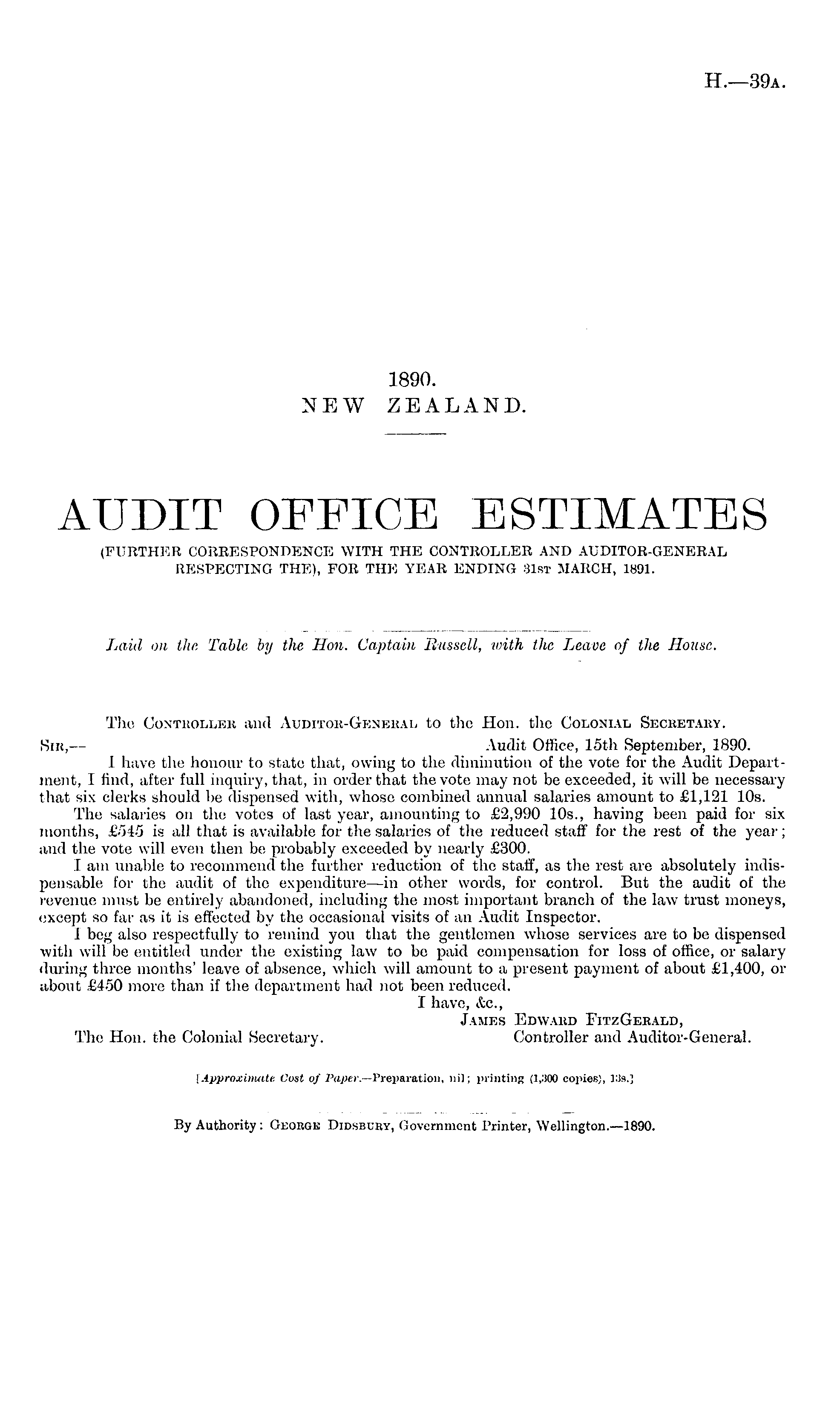 The Con'tkollek and Auditok-Genebal to the Hon. the Colonial Secretary. Sib,— Audit Office, 15th September, 1890. I have the honour to state that, owing to the diminution of the vote for the Audit Department, I find, after full inquiry, that, in order that the vote may not be exceeded, it will be necessary that six clerks should be dispensed with, whose combined annual salaries amount to £1,121 10s. The salaries on the votes of last year, amounting to £2,990 10s., having been paid for six months, £545 is all that is available for the salaries of the reduced staff for the rest of the year; and the vote will even then be probably exceeded by nearly £300. I am unable to recommend the further reduction of the staff", as the rest are absolutely indispensable for the audit of the expenditure—in other words, for control. But the audit of the revenue must be entirely abandoned, including the most important branch of the law trust moneys, except so far as it is effected by the occasional visits of an Audit Inspector. I beg also respectfully to remind you that the gentlemen whose services are to be dispensed with will be entitled under the existing law to be paid compensation for loss of office, or salary iluiing three months' leave of absence, which will amount to a present payment of about £1,400, or about £450 more than if the department had not been reduced. I have, &c., James Edward FitzGebald, The Hon. the Colonial Secretary. Controller and Auditor-General. [Approximate Cost of Paper.— Preparation, nil; printing (l,.') 00 copies;, 13s.]