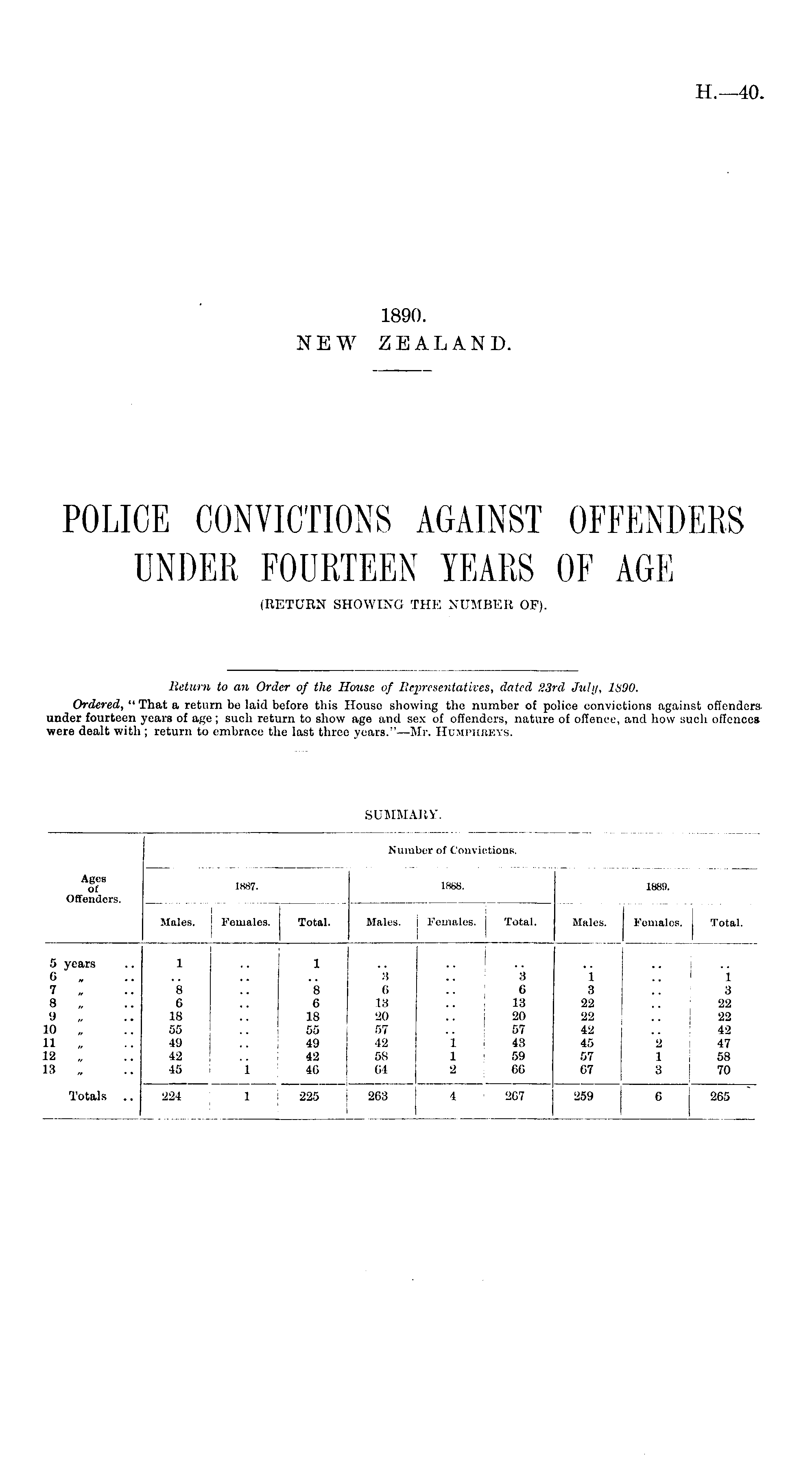 Return to an Order of the House of Representatives, dated 23rd July, lti'JO. Ordered, "That a return he laid before this House showing the number of police convictions against offenders. under fourteen years of age ; such return to show age and sex of offenders, nature of offence, and how such offences were dealt with ; return to embrace the last three years."—Mr. HuMPHBEYS.