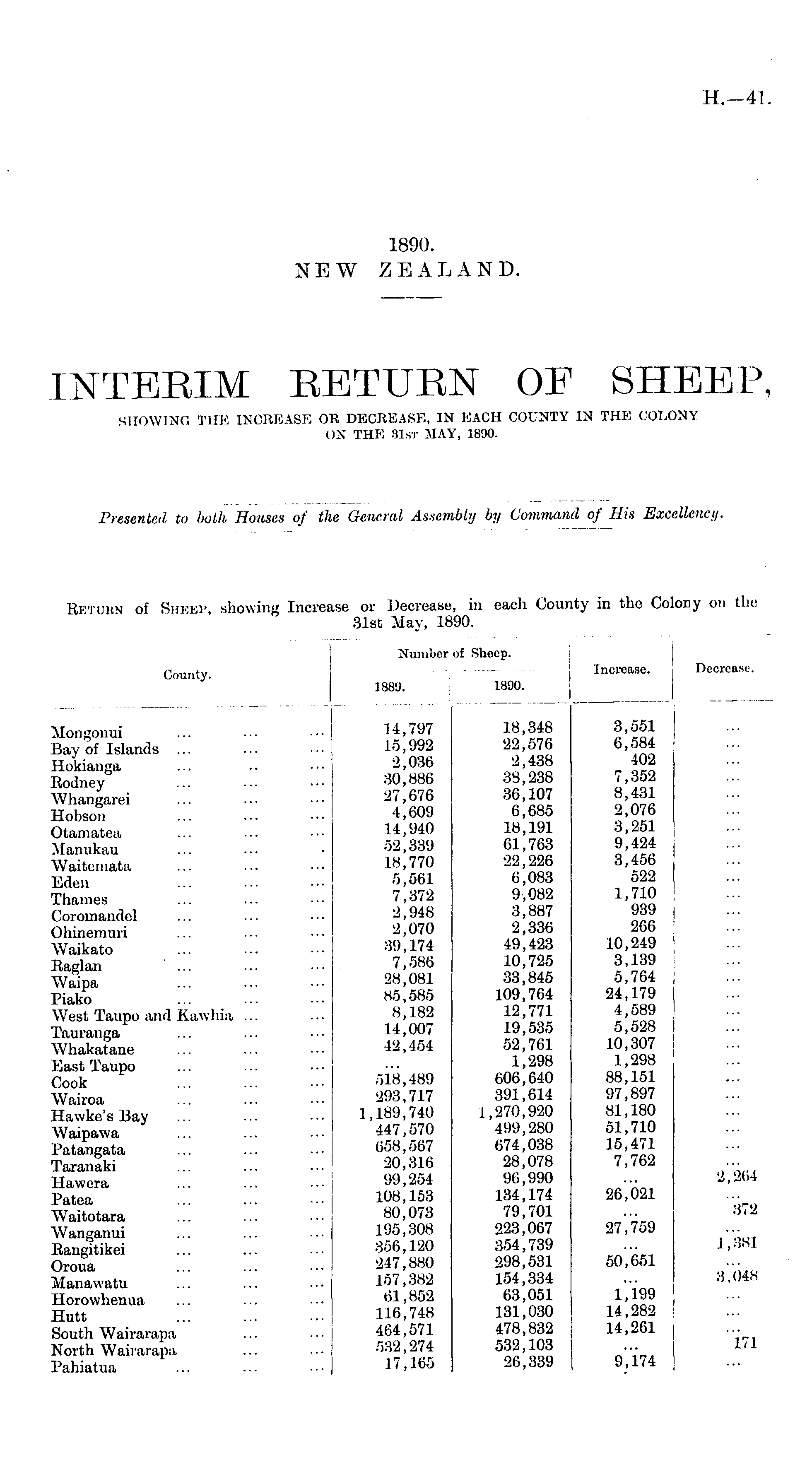 INTERIM RETURN OF SHEEP, SHOWING THE INCREASE OR DECREASE, IN EACH COUNTY IN THE COLONY ON THE 31st MAY, 1890.