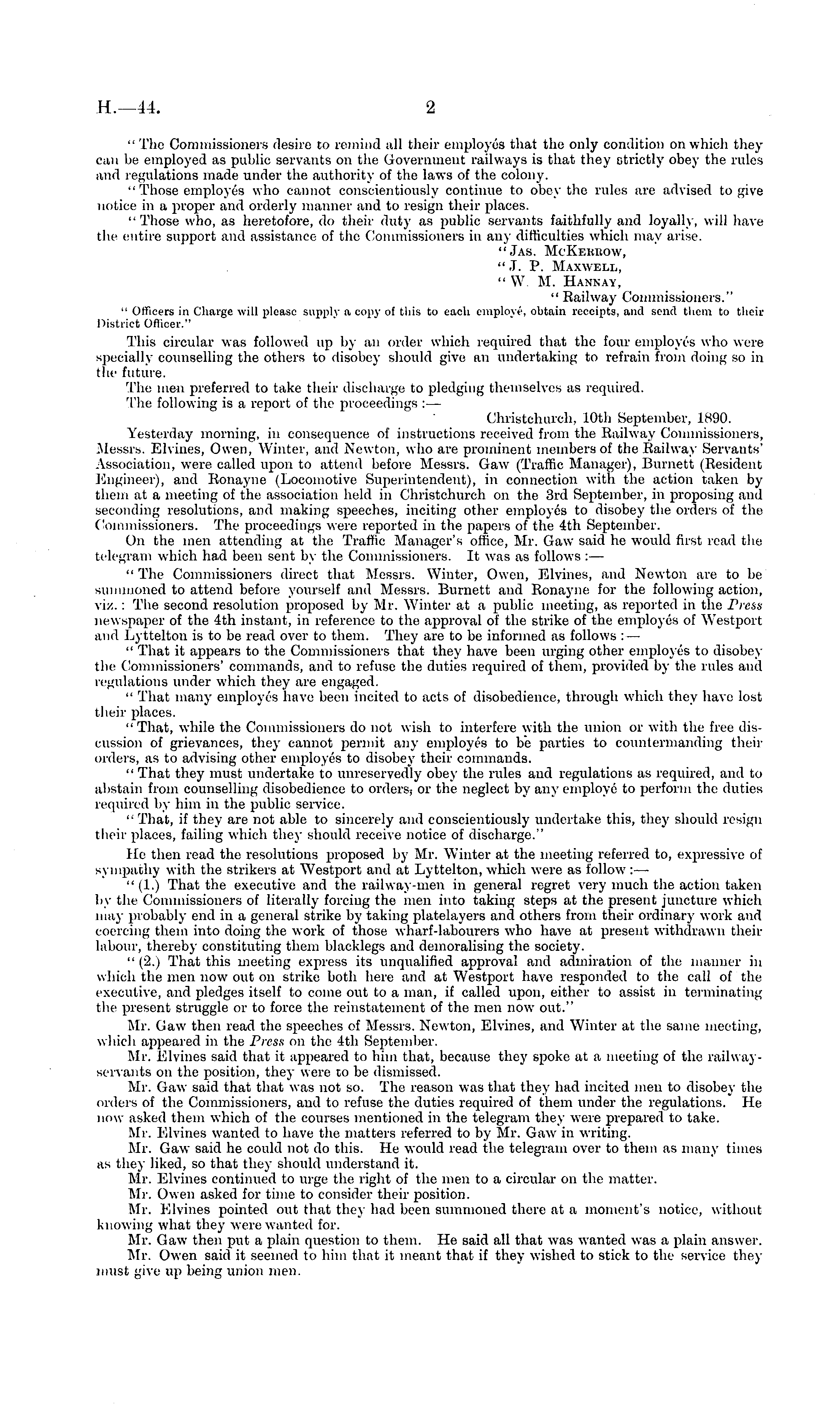 '• The Commissioners desire to remind all their employes that the only condition on which they can l>e employed as public servants on the Government railways is that they strictly obey the rules and regulations made under the authority of the laws of the colony. '• Those employes who cannot conscientiously continue to obey the rules are advised to give notice in a proper and orderly manner and to resign their places. "Those who, as heretofore, do their duty as public servants faithfully and loyally, will have the entire support and assistance of the Commissioners in any difficulties which may arise. "Jas. McKerrow, " J. P. Maxwell, " W M. Kaxnay, " Railway Commissioners." " Officers in Charge will please supply a copy of this to each employe, obtain receipts, and send them to their District Officer." This circular was followed up by an order which required that the four employes who were specially counselling the others to disobey should give an undertaking to refrain from doing so in the future. The men preferred to take their discharge to pledging themselves as required. The following is a report of the proceedings : — Christchurch, 10th September, 1890. Yesterday morning, in consequence of instructions received from the Railway Commissioners, Messrs. Elvines, Owen, Winter, and Newton, who are prominent members of the Railway Servants' Association, were called upon to attend before Messrs. Gaw (Traffic Manager), Burnett (Resident Engineer), and Ronayne (Locomotive Superintendent), in connection with the action taken by them tit a meeting of the association held in Christchurch on the 3rd September, in proposing and seconding resolutions, and making speeches, inciting other employes to disobey the orders of the Commissioners. The proceedings were reported in the papers of the 4th September. On the men attending at the Traffic Manager's office, Mr. Gaw said he would first read the telegram which had been sent by the Commissioners. It was as follows : — "The Commissioners direct that Messrs. Winter, Owen, Elvines, and Newton are to be summoned to attend before yourself and Messrs. Burnett and Ronayne for the following action, viz.: The second resolution proposed by Mr. Winter at a public meeting, as reported in the Press newspaper of the 4th instant, in reference to the approval of the strike of the employes of Westport and Lyttelton is to be read over to them. They are to be informed as follows : — " That it appears to the Commissioners that they have been urging other employes to disobey the Commissioners' commands, and to refuse the duties required of them, provided by the rules and regulations under which they are engaged. •• That many employes have been incited to acts of disobedience, through which they have lost their places. "That, while the, Commissioners do not wish to interfere with the union or with the free discussion of grievances, they cannot permit any employes to be parties to countermanding their orders, as to advising other employes to disobey their commands. " That they must undertake to unreservedly obey the rules and regulations as required, and to abstain from counselling disobedience to orders; or the neglect by any employe to perform the duties required by him in the public service. " That, if they are not able to sincerely and conscientiously undertake this, they should resign their places, failing which they should receive notice of discharge." He then read the resolutions proposed by Mr. Winter at the meeting referred to, expressive of sympathy with the strikers at Westport and at Lyttelton, which were as follow : — "(1.) That the executive and the railway-men in general regret very much the action taken by the Commissioners of literally forcing the men into taking steps at the present juncture which may probably end in a general strike by taking platelayers and others from their ordinary work and coercing them into doing the work of those wharf-labourers who have at present withdrawn thenlabour, thereby constituting them blacklegs and demoralising the society. " (2.) That this meeting express its unqualified approval and admiration of the maimer in which the men now out on strike both here and at Westport have responded to the call of the executive, and pledges itself to come out to a man, if called upon, either to assist in terminating the present struggle or to force the reinstatement of the men now out." Mr. Gaw then read the speeches of Messrs. Newton, Elvines, and Winter at the same meeting, which appeared in the Press on the 4th September. Ah-. Elvines said that it appeared to him that, because they spoke at a meeting of the railwayservants on the position, they were to be dismissed. Mr. Gaw said that that was not so. The reason was that they had incited men to disobey the orders of the Commissioners, and to refuse the duties required of them under the regulations. He now asked them which of the courses mentioned in the telegram they were prepared to take. Mr. Elvines wanted to have the matters referred to by Mr. Gaw- in writing. Mr. Gaw said he could not do this. He would read the telegram over to them as many times as they liked, so that they should understand it. Mr. Elvines continued to urge the right of the men to a circular on the matter. Mr. Owen asked for time to consider their position. Mr. Elvines pointed out that they had been summoned there at a moment's notice, without knowing what they were wanted for. Mi-. Gaw then put a plain question to them. He said all that was wanted was a plain answer. Mr. Owen said it seemed to him that it meant that if they wished to stick to the service the) must give up being union men.