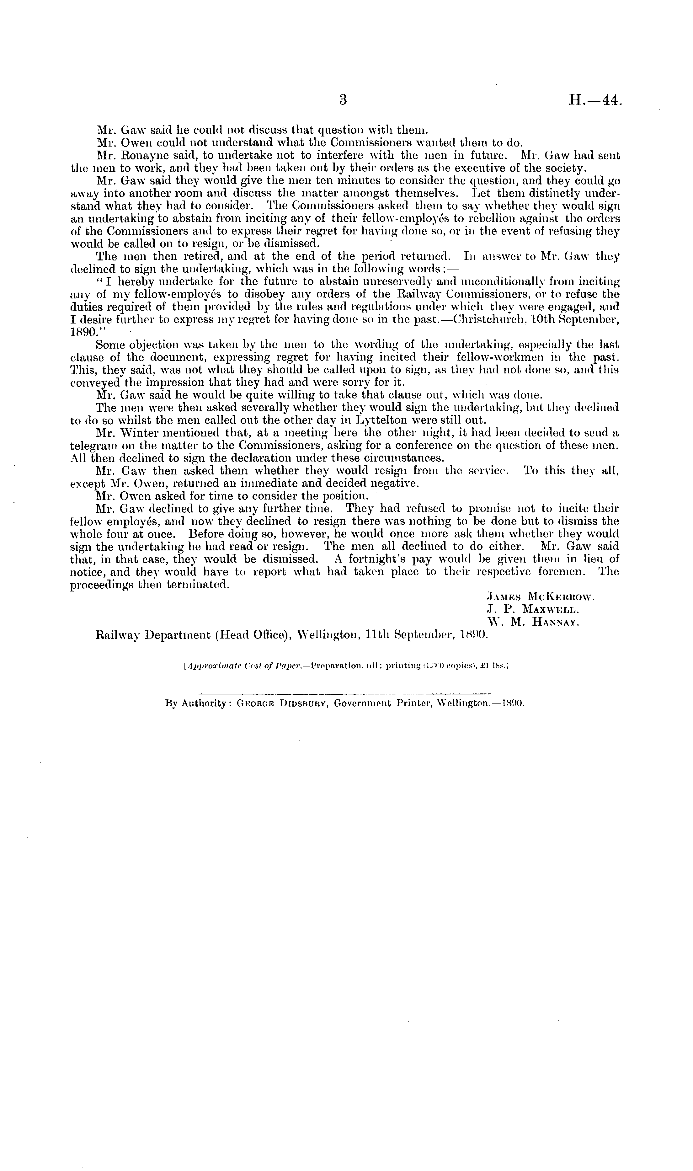 Mr. Gaw said he could not discuss that question with them. Mr. Owen could not understand what the Commissioners wanted them to do. Mr. Ronayne said, to undertake not to interfere with the men in future. Mr. Gaw had sent the men to work, and they had been taken out by their orders as the executive of the society. Mr. Gaw said they would give the men ten minutes to consider the question, and they could go away into another room and discuss the matter amongst themselves. Let them distinctly understand what they had to consider. The Commissioners asked them to say whether they would sign an undertaking to abstain from inciting any of their fellow-employes to rebellion against the orders of the Commissioners and to express their regret for having done so, or in the event of refusing they would be called on to resign, or be dismissed. The men then retired, and at the end of the period returned, in answer to Mr. Gaw they declined to sign the undertaking, which was in the following words: — "I hereby undertake for the future to abstain unreservedly and unconditionally from inciting any of my fellow-employes to disobey any orders of the Railway Commissioners, or to refuse the duties required of them provided by the rules and regulations under which they wire engaged, and I desire further to express my regret for having done so in the past.- Christchurch, 10th September, 1590." Some objection was taken by the men to the wording of the undertaking, especially the last clause of the document, expressing regret for having incited their fellow-workmen in the past. This, they said, was not what they should be called upon to as they had not done so, and this conveyed the impression that they had and were sorry for it. Mr. Gaw said he would be quite willing to take that clause out, which was done. The men were then asked severally whether they would sign the undertaking, but they declined to do so whilst the men called out the other day in Lyttelton were still out. Mr. Winter mentioned that, at a meeting here the other night, it had been decided to send a telegram on the matter to the Commissioners, asking for a conference on the question of these men. All then declined to sign the declaration under these circumstances. Mr. Gaw then asked them whether they would resign from the service. To this they all, except Mr. Owen, returned an immediate and decided negative. Mr. Owen asked for time to consider the position. Mr. Gaw declined to give any further time. They had refused to promise not to incite their fellow employes, and now they declined to resign there was nothing to be done but to dismiss tin; whole four at once. Before doing so, however, he would once more ask them whether they would si<,ni the undertaking he had read or resign. The men all declined to do either. Mr. Gaw said that, in that case, they would be dismissed. A fortnight's pay would be given them in lieu of notice, and they would have to report what had taken place to their respective foremen. The proceedings then terminated. James McKerrow. J. P. Maxwell. W. M. H ANN:AY. Railway Department (Head Office), Wellington, 11th September, 1890. [Approximate (oBi of Paper. — Preparation, nil: printing I l.'i 1 0 copies), I'l LSb. ,
