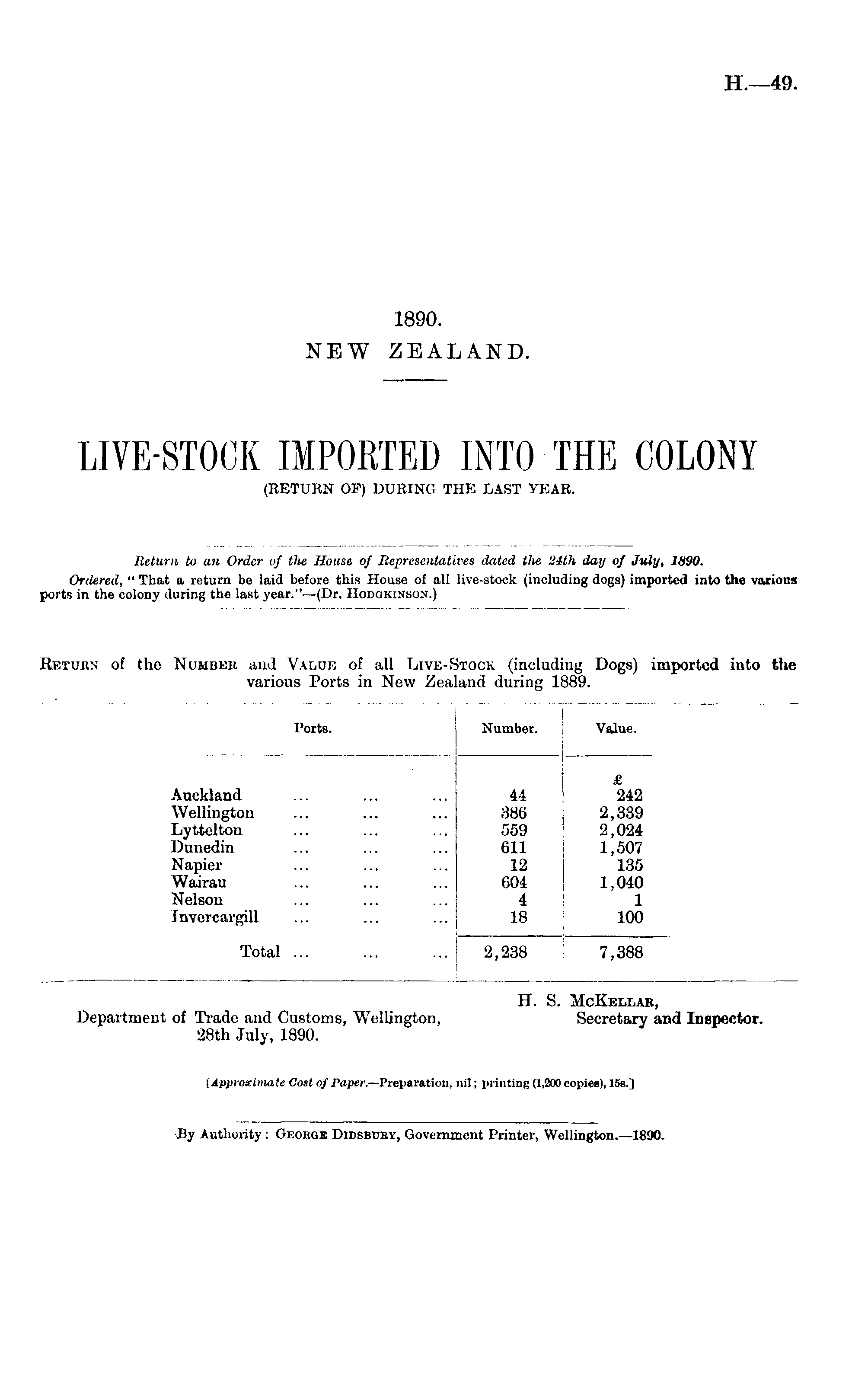 H. S. McKellak, Department of Trade and Customs, Wellington, Secretary and Inspector. 28th July, 1890. [Approximate Cost of Paper.— Preparation, nil; printing (1,200 copies), 158.]