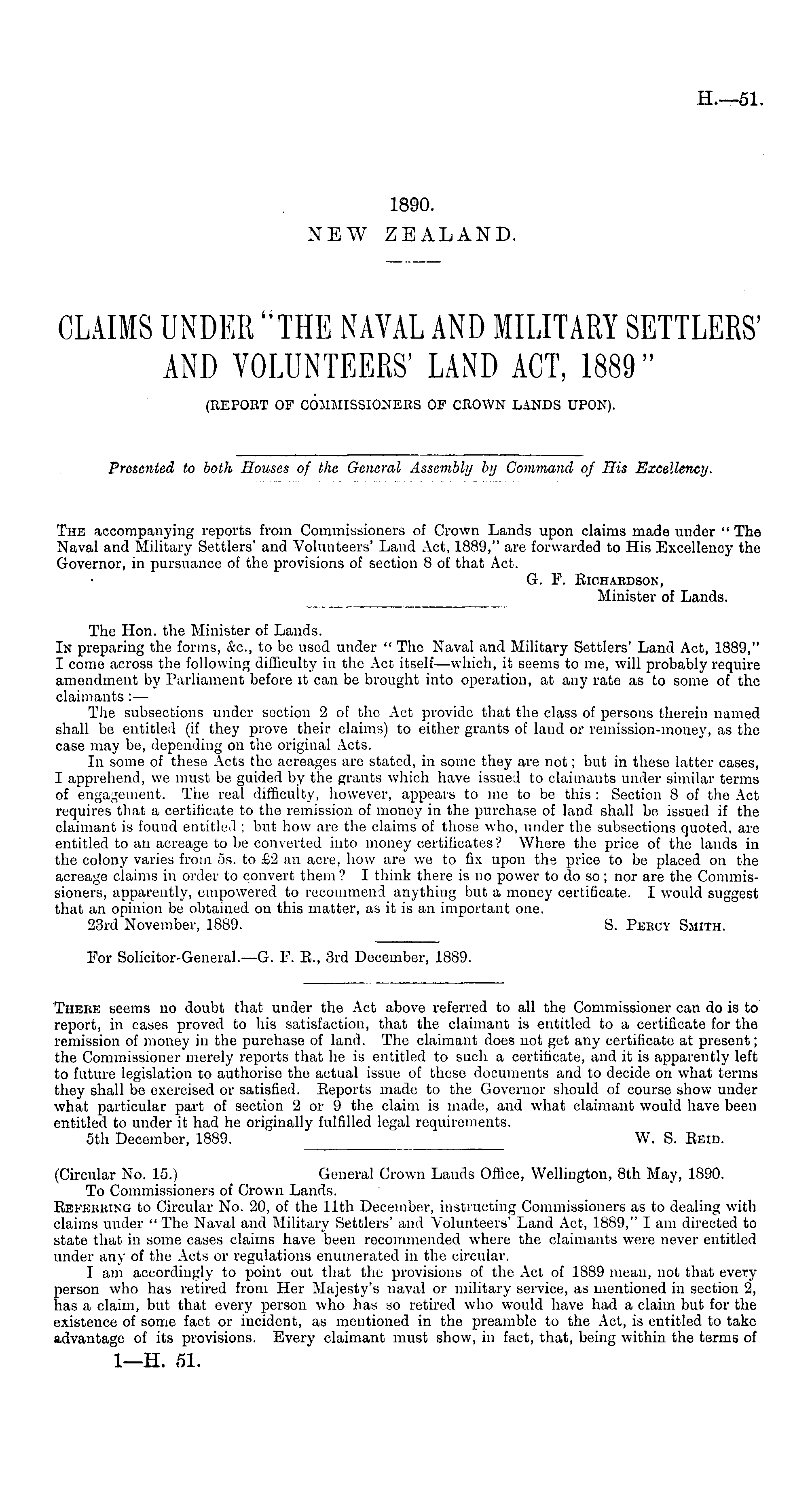The Hon. the Minister of Lands. In preparing the forms, &c, to be used under " The Naval and Military Settlers' Land Act, 1889," I come across the following difficulty in the Act. itself—which, it seems to me, will probably require amendment by Parliament before it can be brought into operation, at any rate as to some of the claimants :— The subsections under section 2 of the Act provide that the class of persons therein named shall be entitled (if they prove their claims) to either grants of land or remission-money, as the case may be, depending on the original Acts. In some of these Acts the acreages are stated, in some they are not; but in these latter cases, I apprehend, we must be guided by the grants which have issued to claimants under similar terms of engagement. The real difficulty, however, appears to me to be this : Section 8 of the Act requires that a certificate to the remission of money in the purchase of land shall be issued if the claimant is found entitled ; but how are the claims of those who, under the subsections quoted, are entitled to an acreage to be converted into money certificates'? Where the price of the lands in the colony varies from ss. to £2 an acre, how are we to fix upon the price to be placed on the acreage claims in order to convert them ? I think there is no power to do so; nor are the Commissioners, apparently, empowered to recommend anything but a money certificate. I would suggest that an opinion be obtained on this matter, as it is an important one. 23rd November, 1889. S. Percy Smith.
