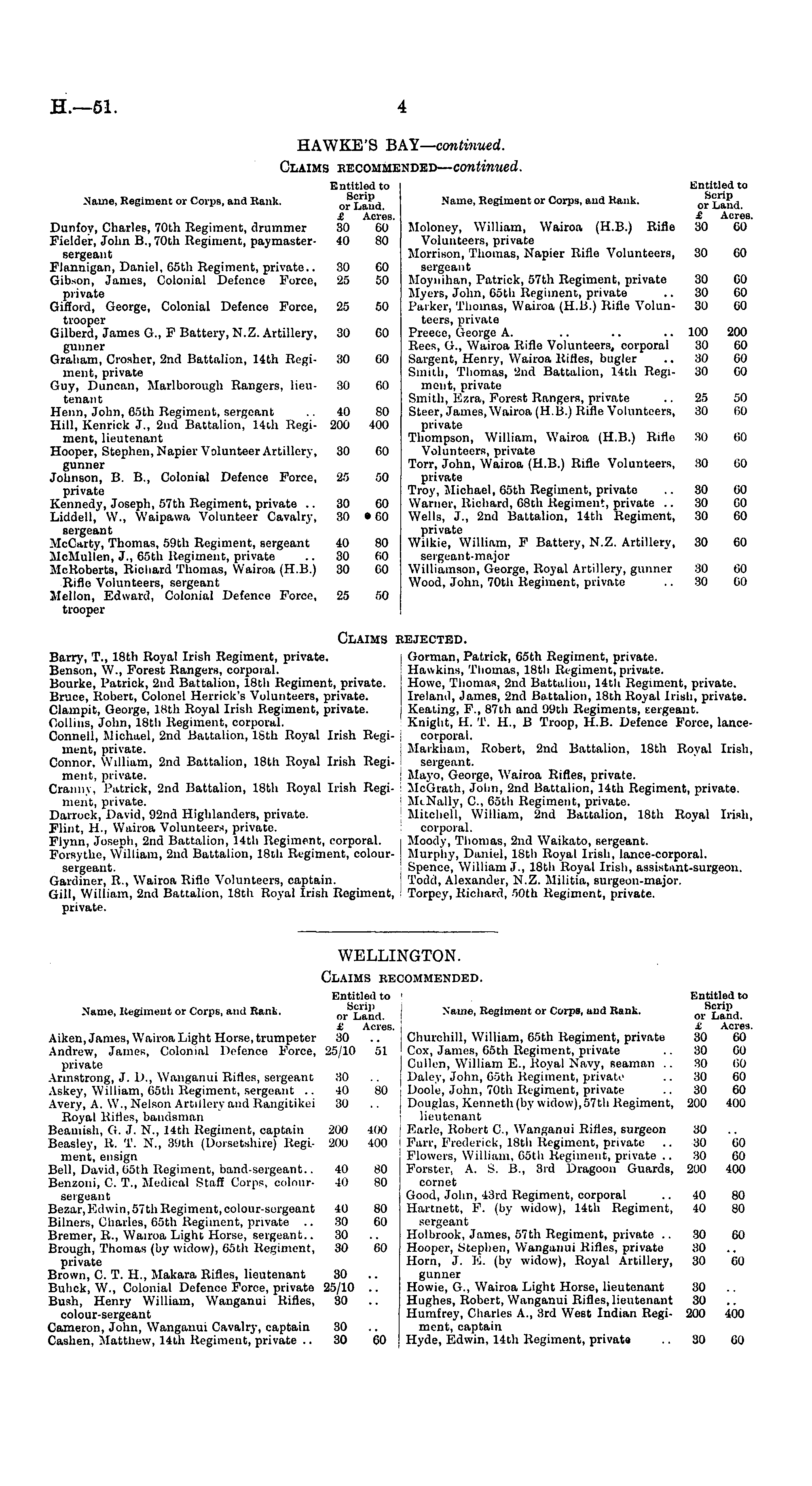 WELLINGTON. Claims recommended. Entitled to I Entitled to Name, Regiment or Corps, and Rank. Name, Regiment or Corps, and Rank. or Land £ Acres. ] £ Acres. Aiken, James, Wairoa Light Horse, trumpeter 30 .. Churchill, William, 65th Regiment, private 30 00 Andrew, James, Colonial Defence Force, 25/10 51 ■ Cox, James, 65th Regiment, private .. 30 60 private I Cullen, William E., Royal Navy, seaman .. 30 60 Armstrong, J. I)., Wanganui Rifles, sergeant 30 .. j Daley, John, 65th Regiment, private .. 30 60 Askey, William, 65th Regiment, sergeant .. 40 80 i Doole, John, 70th Regiment, private .. 30 60 Avery, A. W., Nelson Artillery and Rangitikei 30 .. Douglas, Kenneth (by widow), 57th Regiment, 200 400 Royal Rifles, bandsman lieutenant Beamish, G. J. N., 14th Regiment, captain 300 100 Earle, Robert C, Wanganui Rifles, surgeon 30 Beasley, R. T. N., 39th (Dorsetshire) Regi- 200 400 Fair, Frederick, 18th Regiment, private .. 30 60 ment, ensign Flowers, William, 65th Regiment, private .. 30 60 Bell, David, 65th Regiment, band-sergeant.. 40 80 Forster, A. S. 8., 3rd Dragoon Guards, 200 400 Benzoiii, C. T., Medical Staff Corps, colour- 10 80 cornet sergeant Good, John, 43rd Regiment, corporal .. 40 80 Bezar,Edwin,s7thßegiment,colour-sergeant 40 80 Hartnett, F. (by widow), 14th Regiment, 40 80 Bilners, Charles, 65th Regiment, private .. 30 60 sergeant Bremer, R., Wairoa Light Horse, sergeant.. 30 .. Holbrook, James, 57th Regiment, private .. 30 60 Brough, Thomas (by widow), 65th Regiment, 30 60 Hooper, Stephen, Wanganui Rifles, private 30 private Horn, J. E. (by widow), Royal Artillery, 30 60 Brown, C. T. H., Makara Rifles, lieutenant 30 .. gunner Buhck, W., Colonial Defence Force, privato 25/10 .. Howie, G., Wairoa Light Horse, lieutenant 30 Bush, Henry William, Wanganui Rifles, 30 .. Hughes, Robert, Wanganui Rifles, lieutenant 30 colour-sergeant Humfrey, Charles A., 3rd West Indian Regi- 200 400 Cameron, John, Wanganui Cavalry, captain 30 .. ment, captain Cashen, Matthew, 14th Regiment, private .. 30 60 Hyde, Edwin, 14th Regiment, private 30 00