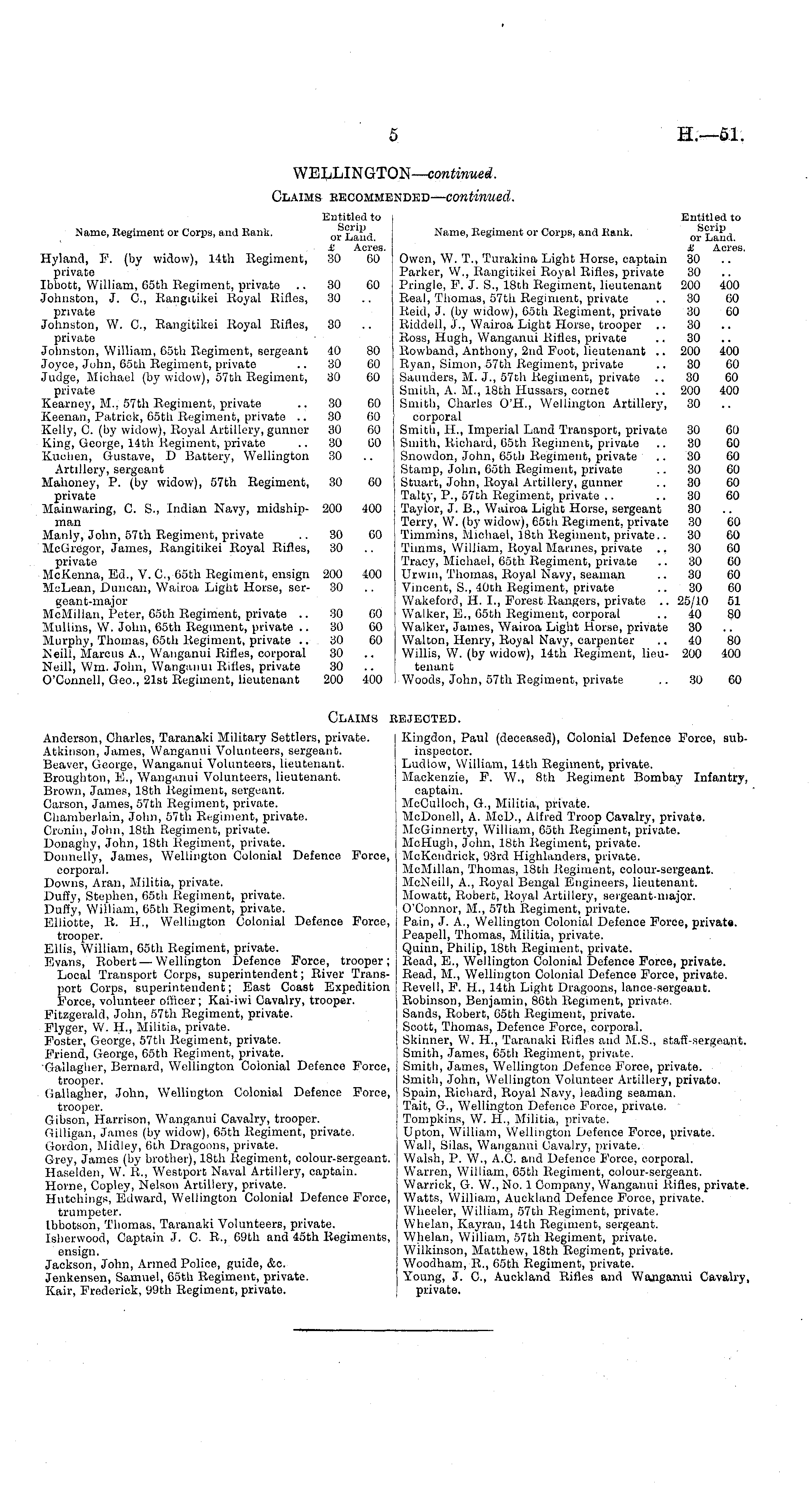 WELLlNGTON— continued. Claims recommended — continued. Entitled to Entitled to Name, Regiment or Corps, and Rank. or Land Name, Regiment or Corps, and Rank. or Land £ Acres. £ Acres. Hyland, F. (by widow), 14th Regiment, 30 60 Owen, W. T., Turakina Light Horse, captain 30 private Parker, W., Rangitikei Royal Rifles, private 30 Ibbott, William, 05th Regiment, private .. 30 60 Pringle, F. J. S., 18th Regiment, lieutenant 200 400 Johnston, J. C, Rangitikei Royal Rifles, 30 .. Real, Thomas, 57th Regiment, private .. 30 60 private Reid, J. (by widow), 65th Regiment, private 30 60 Johnston, W. C, Rangitikei Royal Rifles, 30 .. Riddell, J., Wairoa Light Horse, trooper .. 30 private Ross, Hugh, Wanganui Rifles, private .. 30 Johnston, William, 65th Regiment, sergeant 40 80 Rowband, Anthony, 2nd Foot, lieutenant .. 200 400 Joyce, John, 65th Regiment, private .. 30 60 Ryan, Simon, 57th Regiment, private .. 30 60 Judge, Michael (by widow), 57th Regiment, 30 60 Saunders, M. J., 57ch Regiment, private .. 30 60 private Smith, A. M., 18th Hussars, cornet .. 200 400 Kearney, M., 57th Regiment, private .. 30 60 Smith, Cliarles OH., Wellington Artillery, 30 Keenan, Patrick, 65th Regiment, private .. 30 60 corporal Kelly, C. (by widow), Royal Artillery, gunner 30 60 Smith, H., Imperial Land Transport, privato 30 60 King, George, 14th Regiment, private .. 30 60 Smith, Richard, 65th Regiment, private .. 30 60 Kuchen, Gustave, D Battery, Wellington 30 .. Snowdon, John, 65th Regiment, private .. 30 60 Artillery, sergeant Stamp, John, 65th Regiment, private .. 30 60 Mahoney, P. (by widow), 57th Regiment, 30 60 Stuart, John, Royal Artillery, gunner .. 30 60 private Talty, P., 57th Regiment, private .. 30 60 Mainwaring, C. S., Indian Navy, midship- 200 400 Taylor, J. 8., Wairoa Light Horse, sergeant 80 man Terry, W. (by widow), 65th Regiment, private 30 60 Manly, John, 57th Regiment, private .. 30 60 Timmins, Michael, 18th Regiment, private.. 30 60 McGregor, James, Rangitikei Royal Rifles, 30 .. Tiinms, William, Royal Marines, private .. 30 60 private Tracy, Michael, 65th Regiment, private .. 30 60 McKenna, Ed., V. C, 65th Regiment, ensign 200 400 Urwin, Thomas, Royal Navy, seaman .. 30 60 McLean, Duncan, Wairoa Light Horse, ser- 30 .. Vincent, S., 40th Regiment, private .. 30 60 geant-major Wakeford, H, 1., Forest Rangers, private. .. 25/10 51 McMillan, Peter, 65th Regiment, private .. 30 60 Walker, E., 65th Regiment, corporal .. 40 80 Mullins, W. John, 65th Regiment, private .. 30 60 Walker, James, Wairoa Light Horse, private 30 Murphy, Thomas, 65th Regiment, private .. 30 60 Walton, Henry, Royal Navy, carpenter .. 40 80 Neill, Marcus A., Wanganui Rifles, corporal 30 .. Willis, W. (by widow), 14th Regiment, lieu- 200 400 Neill, Wm. John, Wanganui Rifles, private 30 .. tenant O'Connell, Geo., 21st Regiment, lieutenant 200 400 Woods, John, 57th Regiment, private .. 30 60 Claims rejected. Anderson, Charles, Taranaki Military Settlers, private. Kingdon, Paul (deceased), Colonial Defence Force, subAtkinson, James, Wanganui Volunteers, sergeant. inspector. Beaver, George, Wanganui Volunteers, lieutenant. Ludlow, William, 14th Regiment, private. Broughton, E., Wanganui Volunteers, lieutenant. Mackenzie, F. W., Bth Regiment Bombay Infantry, Brown, James, 18th Regiment, sergeant. captain. Carson, James, 57th Regiment, private. McCulloch, G., Militia, private. Chamberlain, John, 57th Regiment, private. McDonell, A. McD., Alfred Troop Cavalry, private. Cronin, John, 18th Regiment, private. McGinnorty, William, 65th Regiment, private. Donagiiy, John, 18th Regiment, private. McHugh, John, 18th Regiment, private. Donnelly, James, Wellington Colonial Defence Force, McKondrick, 93rd Highlanders, private. corporal. McMillan, Thomas, 18th Regiment, colour-sergeant. Downs, Aran, Militia, private. McNeill, A., Royal Bengal Engineers, lieutenant. Duffy, Stephen, 65th Regiment, private. Mowatt, Robert, Royal Artillery, sergeant-major. Duffy, William, 65th Regiment, private. O'Connor, M., 57th Regiment, private. Elliotte, R. H., Wellington Colonial Defence Force, Pain, J. A., Wellington Colonial Defence Force, private. trooper. Peapell, Thomas, Militia, private. Ellis, William, 65th Regiment, private. Quinn, Philip, 18th Regiment, private. Evans, Robert — Wellington Defence Force, trooper; Read, E., Wellington Colonial Defence Force, private. Local Transport Corps, superintendent; River Trans- Read, M., Wellington Colonial Defence Force, private. port Corps, superintendent; East Coast Expedition Revell, F. H., 14th Light Dragoons, lance-sergeant. Force, volunteer officer; Kai-iwi Cavalry, trooper. Robinson, Benjamin, 86th Regiment, private. Fitzgerald, John, 57th Regiment, private. Sands, Robert, 65th Regiment, private. Flyger, W. H., Militia, private. Scott, Thomas, Defence Force, corporal. Foster, George, 57th Regiment, private. Skinner, W. H., Taranaki Rifles and M.S., staff-sergeant. Friend, George, 65th Regiment, private. Smith, James, 65th Regiment, private. Gallagher, Bernard, Wellington Colonial Defence Force, Smith, James, Wellington Defence Force, private. trooper. Smith, John, Wellington Volunteer Artillery, private. Gallagher, John, Wellington Colonial Defence Force, Spain, Richard, Royal Navy, leading seaman. trooper. Tait, G., Wellington Defence Force, private. Gibson, Harrison, Wanganui Cavalry, trooper. Tompkins, W. H., Militia, private. Gilligan, James (by widow), 65th Regiment, private. Upton, William, Wellington Defence Force, private. Gordon, Midley, 6th Dragoons, private. Wall, Silas, Wanganui Cavalry, private. Grey, James (by brother), 18th Regiment, colour-sergeant. Walsh, P. W, A.C. and Defence Force, corporal. Haselden, W. R., Westport Naval Artillery, captain. Warren, William, 65th Regiment, colour-sergeant. Home, Copley, Nelson Artillery, private. Warrick, G. W., No. 1 Company, Wanganui Rifles, private. Hutchings, Edward, Wellington Colonial Defence Force, Watts, William, Auckland Defence Force, pri