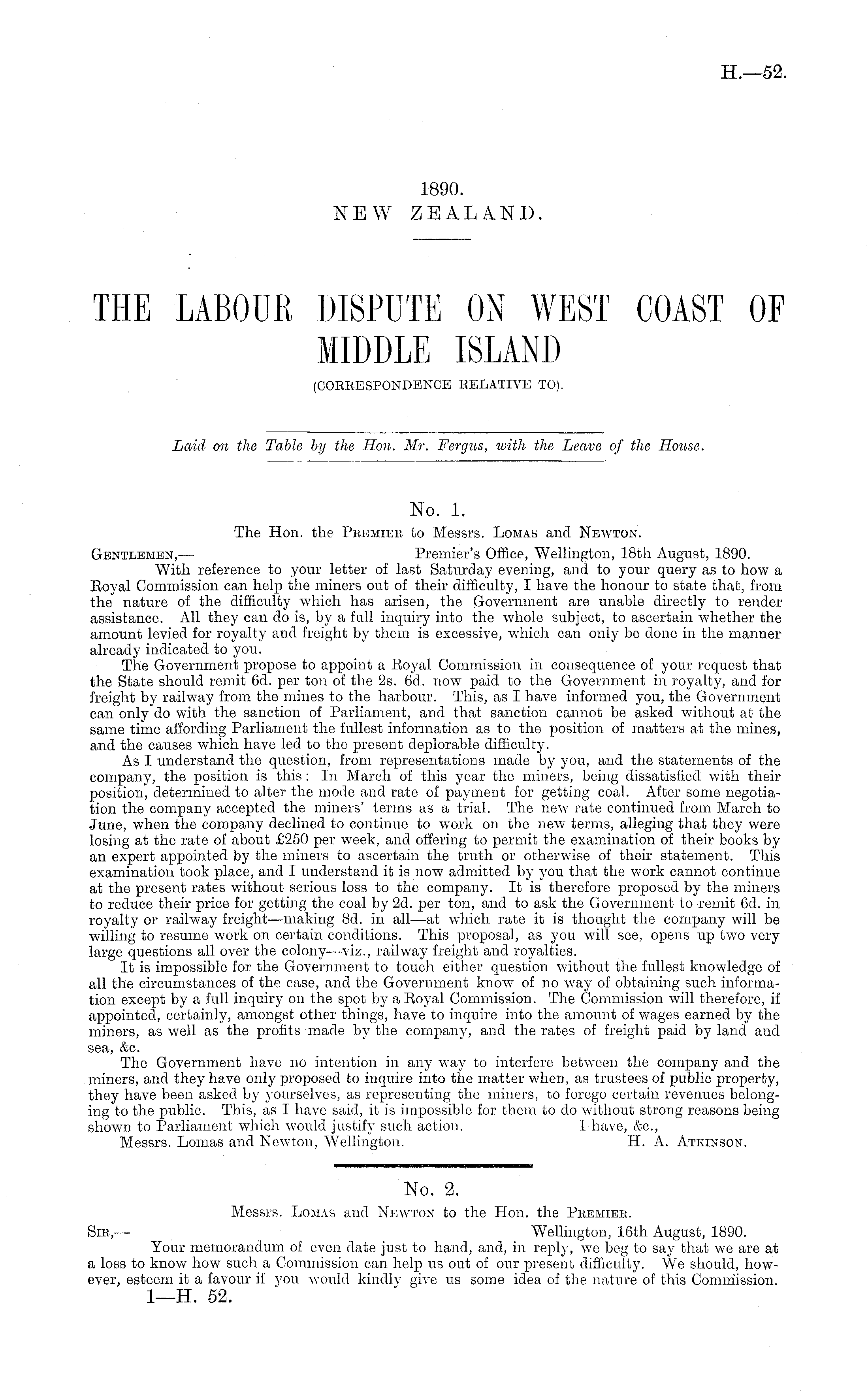 No. 1. The Hon. the Premier to Messrs. Lomas and Newton. Gentlemen, — Premier's Office, Wellington, 18th August, 1890. With reference to your letter of last Saturday evening, and to your query as to how a Royal Commission can help the miners out of their difficulty, I have the honour to state that, from the nature of the difficulty which has arisen, the Government are unable directly to render assistance. All they can do is, by a full inquiry into the whole subject, to ascertain whether the amount levied for royalty and freight by them is excessive, w T hich can only be done in the manner already indicated to you. The Government propose to appoint a Royal Commission in consequence of your request that the State should remit 6d. per ton of the 2s. 6d. now paid to the Government in royalty, and for freight by railway from the mines to the harbour. This, as I have informed you, the Government can only do with the sanction of Parliament, and that sanction cannot be asked without at the same time affording Parliament the fullest information as to the position of matters at the mines, and the causes which have led to the present deplorable difficulty. As I understand the question, from representations made by you, and the statements of the company, the position is this : In March of this year the miners, being dissatisfied with their position, determined to alter the mode and rate of payment for getting coal. After some negotiation the company accepted the miners' terms as a trial. The new rate continued from March to June, when the company declined to continue to work on the new terms, alleging that they were losing at the rate of about £250 per week, and offering to permit the examination of their books by an expert appointed by the miners to ascertain the truth or otherwise of their statement. This examination took place, and I understand it is now admitted by you that the work cannot continue at the present rates without serious loss to the company. It is therefore proposed by the miners to reduce their price for getting the coal by 2d. per ton, and to ask the Government to remit 6d. in royalty or railway freight—making Bd. in all—at which rate it is thought the company will be willing to resume work on certain conditions. This proposal, as you will see, opens up two very large questions all over the colony—viz., railway freight and royalties. It is impossible for the Government to touch either question without the fullest knowledge of all the circumstances of the case, and the Government know of no way of obtaining such information except by a full inquiry on the spot by a Royal Commission. The Commission will therefore, if appointed, certainly, amongst other things, have to inquire into the amount of wages earned by the miners, as well as the profits made by the company, and the rates of freight paid by land and sea, &c. The Government have no intention in an)- way to interfere between the company and the miners, and they have only proposed to inquire into the matter when, as trustees of public property, they have been asked by yourselves, as representing the miners, to forego certain revenues belonging to the public. This, as I have said, it is impossible for them to do without strong reasons being shown to Parliament which would justify such action. I have, &c, Messrs. Lomas and Newton, Wellington. H. A. Atkinson.