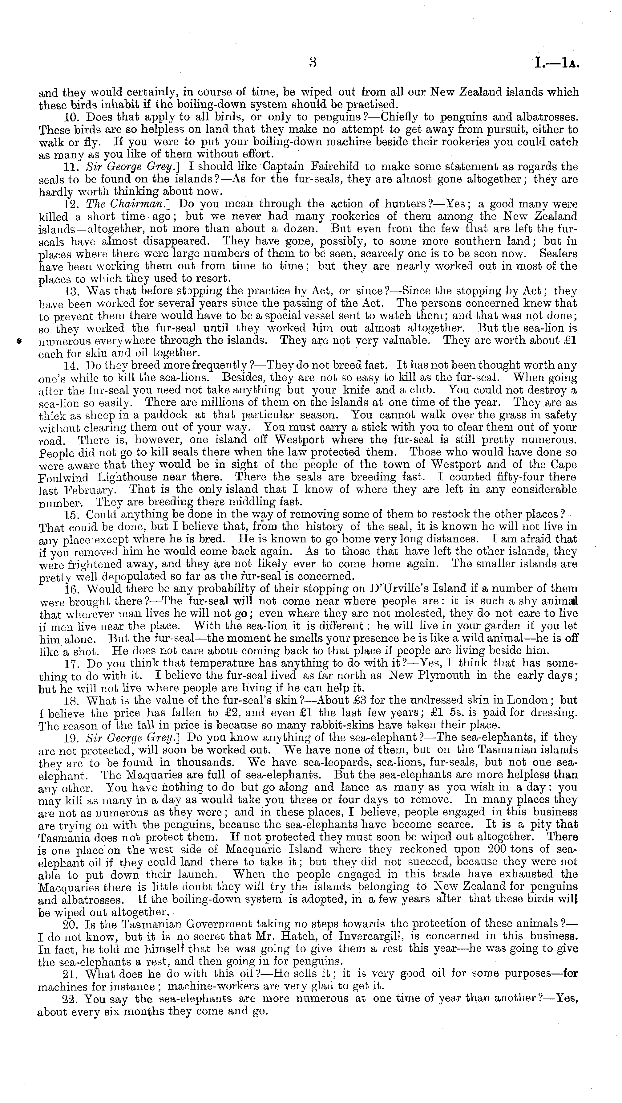 and they would certainly, in course of time, be wiped out from all our New Zealand islands which these birds inhabit if the boiling-down system should be practised. 10. Does that apply to all birds, or only to penguins ?—Chiefly to penguins and albatrosses. These birds are so helpless on land that they make no attempt to get away from pursuit, either to walk or fly. If you were to put your boiling-down machine beside their rookeries you could catch as many as you like of them without effort. 11. Sir George Grey.] I should like Captain Fairchild to make some statement as regards the seals to be found on the islands? —As for the fur-seals, they are almost gone altogether; they are hardly worth thinking about now. 12. The Chairman.] Do you mean through the action of hunters?— Yes; a good many were killed a short time ago; but w r e never had many rookeries of them among the New Zealand islands—altogether, not more than about a dozen. But even from the few that are left the furseals have almost disappeared. They have gone, possibly, to some more southern land; but in places where there were large numbers of them to be seen, scarcely one is to be seen now. Sealers have been working them out from time to time; but they are nearly worked out in most of the places to which they used to resort. 13. Was that before stopping the practice by Act, or since? —Since the stopping by Act; they have been worked for several years since the passing of the Act. The persons concerned knew that to prevent them there would have to be a special vessel sent to watch them; and that was not done; so they worked the fur-seal until they worked him out almost altogether. But the sea-lion is numerous everywhere through the islands. They are not very valuable. They are worth about £1 each for skin and oil together. 14. Do they breed more frequently ?—They do not breed fast. It has not been thought worth any one's while to kill the sea-lions. Besides, they are not so easy to kill as the fur-seal. When going after the fur-seal you need not take anything but your knife and a club. You could not destroy a sea-lion so easily. There are millions of them on the islands at one time of the year. They are as thick as sheep in a paddock at that particular season. You cannot walk over the grass in safety without clearing them out of your way. You must carry a stick with you to clear them out of your road. There is, however, one island, off Westport where the fur-seal is still pretty numerous. People did not go to kill seals there when the law protected them. Those who would have done so were aware that they would be in sight of the people of the town of Westport and of the Cape Foulwind Lighthouse near there. There the seals are breeding fast. I counted fifty-four there last February. That is the only island that I know of where they are left in any considerable number. They are breeding there middling fast. 15. Could anything be done in the way of removing some of them to restock the other places? — That could be done, but I believe that, from the history of the seal, it is known he will not live in any place except where he is bred. He is known to go home very long distances. lam afraid that if you removed him he would come back again. As to those that have left the other islands, they were frightened away, and they are not likely ever to come home again. The smaller islands are pretty well depopulated so far as the fur-seal is concerned. 16. Would there be any probability of their stopping on D'Urville's Island if a number of them were brought there ? —The fur-seal will not come near where people are : it is such a shy animaJl that wherever man lives he will not go; even where they are not molested, they do not care to live if men live near the place. With the sea-lion it is different :he will live in your garden if you let him alone. But the fur-seal—the moment he smells your presence he is like a wild animal—he is off like a shot. He does not care about coming back to that place if people are living beside him. 17. Do you think that temperature has anything to do with it? —Yes, I think that has something to do with it. I believe the fur-seal lived as far north as New Plymouth in the early days; but he will not live where people are living if he can help it. 18. What is the value of the fur-seal's skin?— About £3 for the undressed skin in London; but I believe the price has fallen to £2, and even £1 the last few years; £1 ss. is paid for dressing. The reason of the fall in price is because so many rabbit-skins have taken their place. 19. Sir George Grey.] Do you know anything of the sea-elephant ?—The sea-elephants, if they are not protected, will soon be worked out. We have none of them, but on the Tasmanian islands they are to be found in thousands. We have sea-leopards, sea-lions, fur-seals, but not one seaelephant. The Maquaries are full of sea-elephants. But the sea-elephants are more helpless than any other. You have nothing to do but go along and lance as many as you wish in a day : you may kill as many in a day as would take you three or four days to remove. In many places they are not as numerous as they were; and in these places, I believe, people engaged in this business are trying on with the penguins, because the sea-elephants have become scarce. It is a pity that Tasmania does not protect them. If not protected they must soon be wiped out altogether. There is one place on the west side of Macquarie Island where they reckoned upon 200 tons of seaelephant oil if they could land there to take it; but they did not succeed, because they were not able to put down their launch. When the people engaged in this trade have exhausted the Macquaries there is little doubt they will try the islands belonging to New Zealand for penguins and albatrosses. If the boiling-down system is adopted, in a few years after that these birds will be wiped out altogether. 20. Is the Tasmanian Government taking n