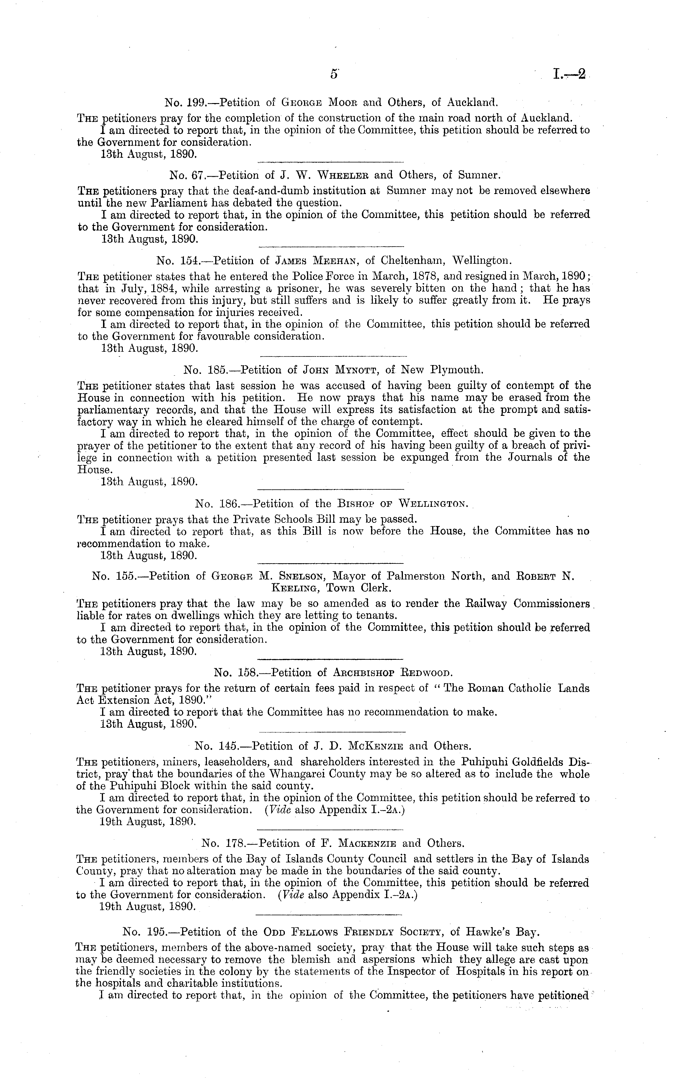 No. 199.—Petition of Geokge Moob and Others, of Auckland. The petitioners pray for the completion of the construction of the main road north of Auckland. I am directed to report that, in the opinion of the Committee, this petition should be referred to the Government for consideration. 13th August, 1890.