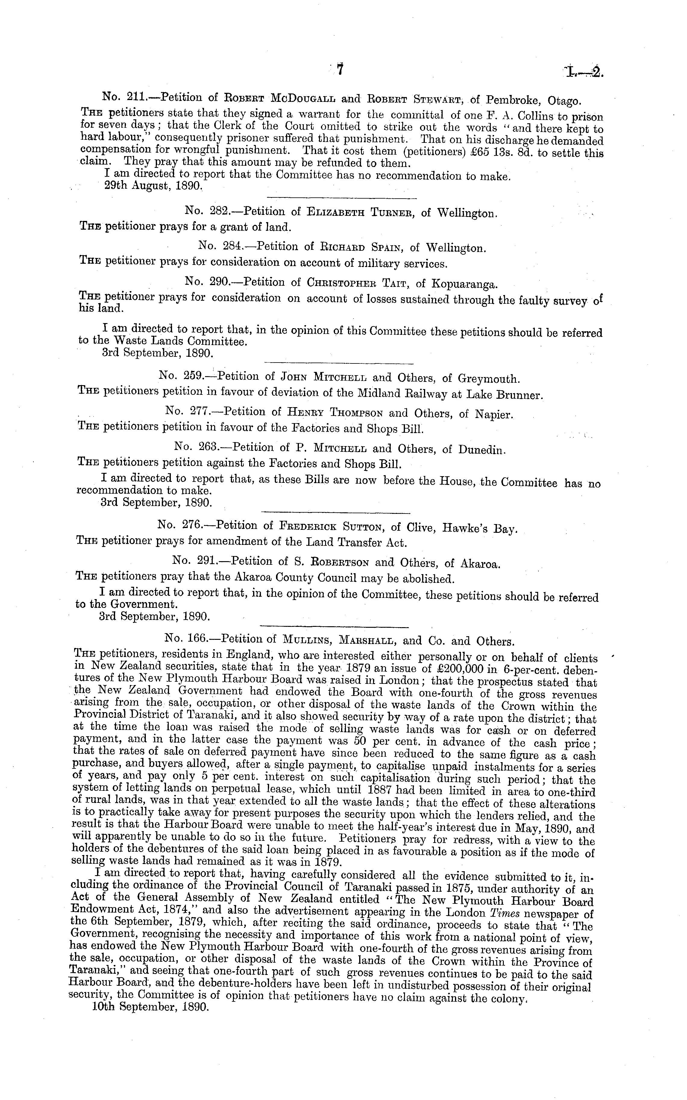No. 166.—Petition of Mullins, Maeshall, and Co. and Others. The petitioners, residents in England, who are interested either personally or on behalf of clients m New Zealand securities, state that in the year 1879 an issue of £200,000 in 6-per-cent. debentures of the New Plymouth Harbour Board was raised in London; that the prospectus stated that the New Zealand Government had endowed the Board with one-fourth of the gross revenues arising from the. sale, occupation, or other disposal of the waste lands of the Crown within the Provincial District of Taranaki, and it also showed security by way of a rate upon the district; that at the time the loan was raised the mode of selling waste lands was for cash or on deferred payment, and in the latter case the payment was 50 per cent, in advance of the cash price • that the rates of sale on deferred payment have since been reduced to the same figure as a cash purchase, and buyers allowed, after a single payment, to capitalise unpaid instalments for a series of years, and pay only 5 per cent, interest on such capitalisation during such period ■ that the system of letting lands on perpetual lease, which until 1887 had been limited in area to one-third of rural lands, was in that year extended to all the waste lands; that the effect of these alterations is to practically take away for present purposes the security upon which the lenders relied, and the result is that the Harbour Board were unable to meet the half-year's interest due in May 1890 and will apparently be unable to do so in the future. Petitioners pray for redress, with a view to the holders of the debentures of the said loan being placed in as favourable a position as if the mode of selling waste lands had remained as it was in 1879. I am directed to report that, having carefully considered all the evidence submitted to it including the ordinance of the Provincial Council of Taranaki passed in 1875, under authority of an Act of the General Assembly of New Zealand entitled "The New Plymouth Harbour Board Endowment Act, 1874," and also the advertisement appearing in the London Times newspaper of the 6th September, 1879, which, after reciting the said ordinance, proceeds to state that "The Government, recognising the necessity and importance of this work from a national point of view has endowed the New Plymouth Harbour Board with one-fourth of the gross revenues arising from the sale, occupation, or other disposal of the waste lands of the Crown within the Province of Taranaki," and seeing that one-fourth part of such gross revenues continues to be paid to the said Harbour Board, and the debenture-holders have been left in undisturbed possession of their original security, the Committee is of opinion that petitioners have no claim against the colony. 10th September, 1890. J