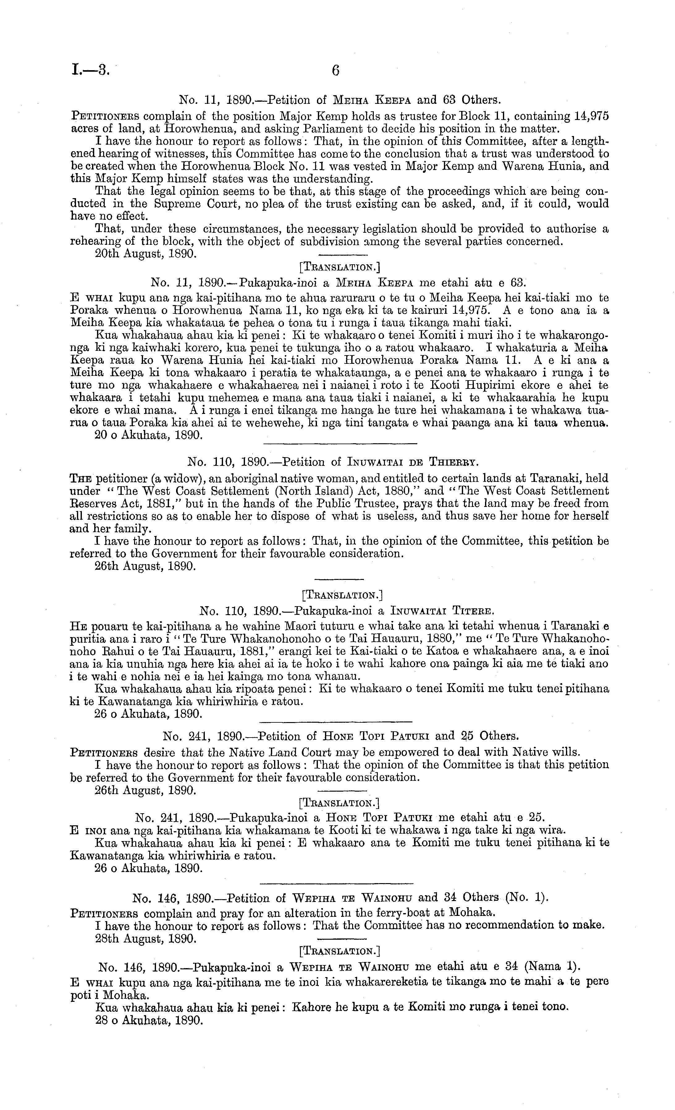 [Translation.] No. 110, 1890.—Pukapuka-inoi a Inuwaitai Titeee. He pouaru te kai-pitihana a he wahine Maori tuturu c whai take ana ki tetahi whenua i Taranaki c puritia ana i raro i "Te Ture Whakanohonoho o te Tai Hauauru, 1880," me " Te Ture Whakanohonoho Eahui o te Tai Hauauru, 1881," erangi kei te Kai-tiaki o te Katoa c whakahaere ana, a c inoi ana ia kia unuhia nga here kia ahei ai ia te hoko i te wahi kahore ona painga ki aia me te tiaki ano i te wahi c nohia nei c ia hei kainga mo tona whanau. Kua whakahaua ahau kia ripoata penei: Xi te whakaaro o tenei Komiti me tuku tenei pitihana kite Kawanatanga kia whiriwhiria c ratou. 26 o Akuhata, 1890.