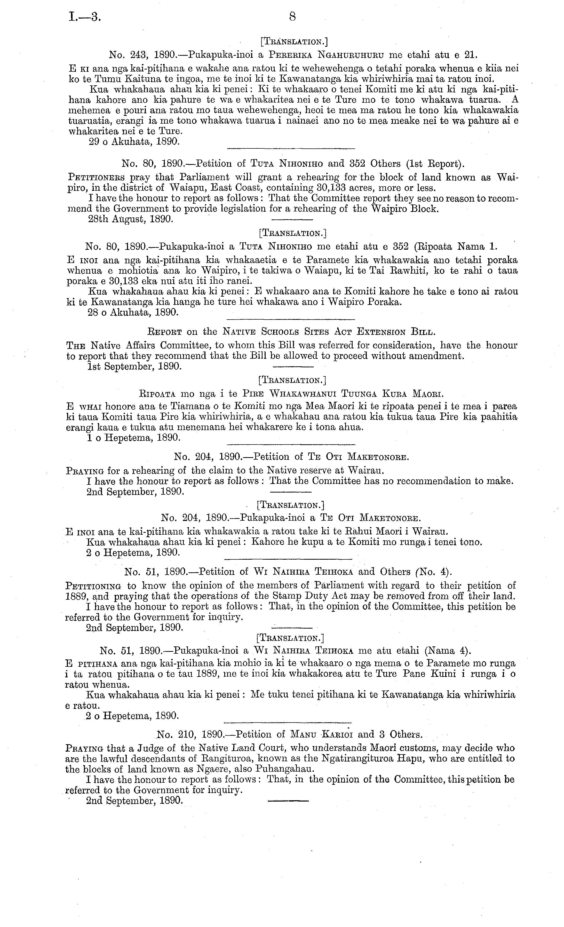 [Teanslation.] No. 80, 1890. —Pukapuka-inoi a Tuta Nihoniho me etahi atu c 352 (Eipoata Nama 1. E inoi ana nga kai-pitihana kia whakaaetia c te Paramete kia whakawakia ano tetahi poraka whenua c mohiotia ana ko Waipiro, i te takiwa o Waiapu, kite Tai Bawhiti, ko te rahi o taua poraka c 30,133 eka nui atu iti iho ranei. Kua whakahaua ahau kia ki penei: E whakaaro ana te Komiti kahore he take c tono ai ratou kite Kawanatanga kia hanga he ture hei whakawa ano i Waipiro Poraka. 28 o Akuhata, 1890.