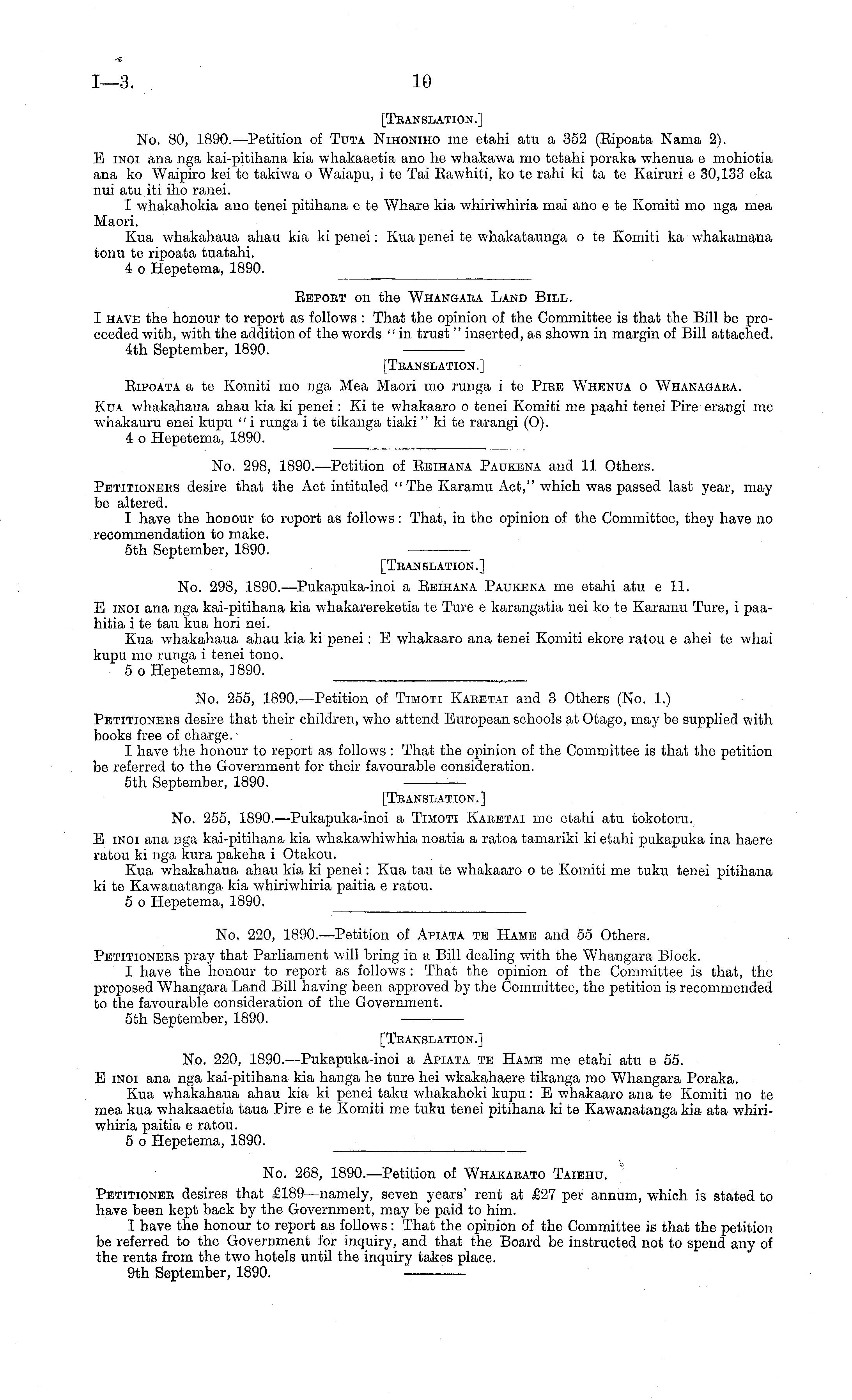 [Translation.] No. 298, 1890. —Pukapuka-inoi a Eeihana Paukena me etahi atu c 11. E iNOi ana nga kai-pitihana kia whakarereketia te Ture c karangatia nei ko te Karamu Ture, i paahitia i te tau kua hori nei. Kua whakahaua ahau kia ki penei: E whakaaro ana tenei Komiti ekore ratou c ahei te whai kupu mo runga i tenei tono. 5 o Hepetema, 3890.