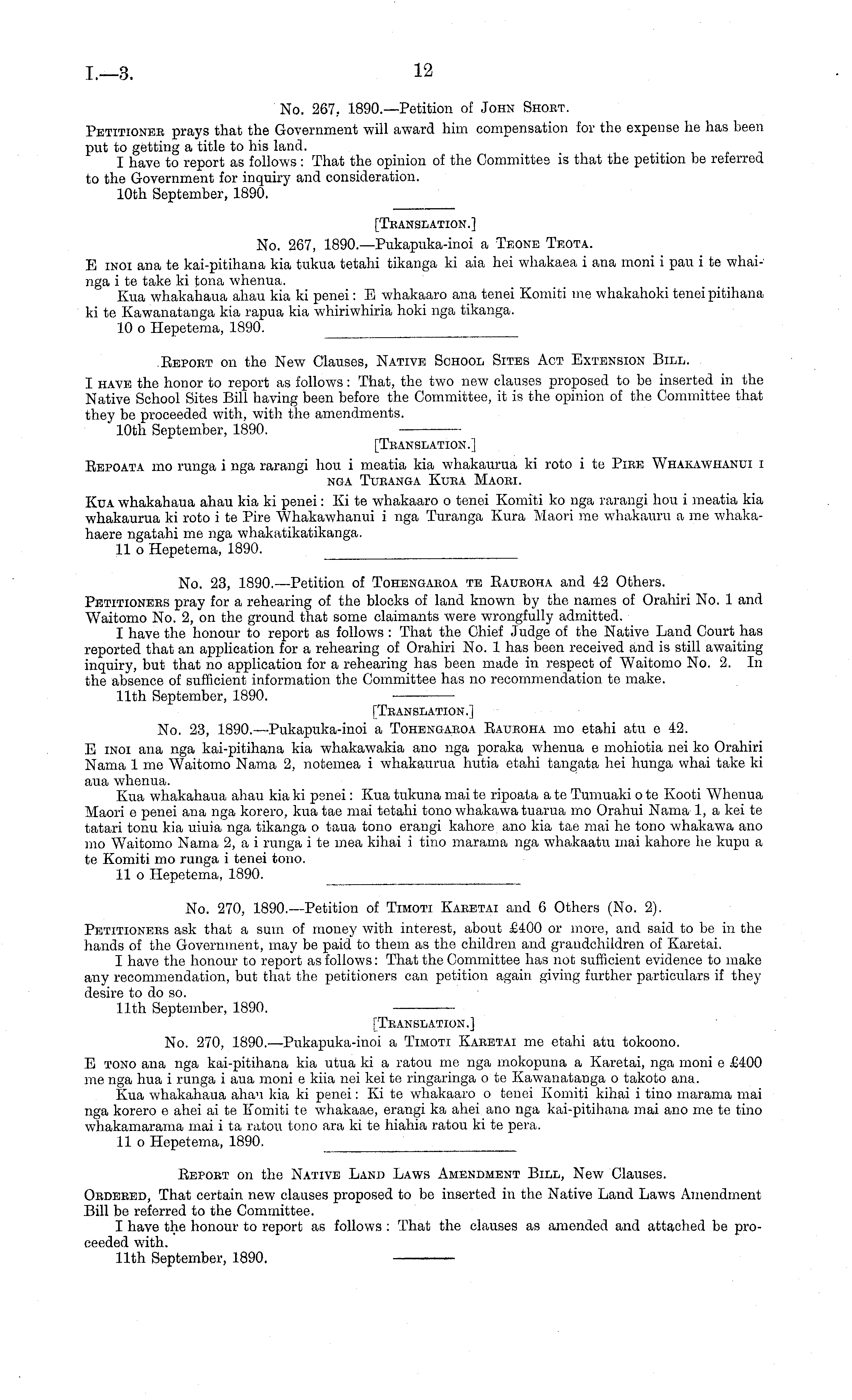 11th September, 1890. [Translation.] No. 270, 1890.—Pukapuka-inoi a Timoti Kaeetai me etahi atu tokoono. E tono ana nga kai-pitihana kia utua ki a ratou me nga mokopuna a Karetai, nga moni c £400 me nga hua i runga i aua moni c kiia nei kei te ringaringa o te Kawanatanga o takoto ana. Kua whakahaua ahau kia ki penei: Xi te whakaaro o tenei Komiti kihai i tino marama mai nga korero c ahei ai te Komiti te whakaae, erangi ka ahei ano nga kai-pitihana mai ano me te tino whakamarama mai i ta ratou tono ara kite hiahia ratou kite pera. 11 o Hepetema, 1890.