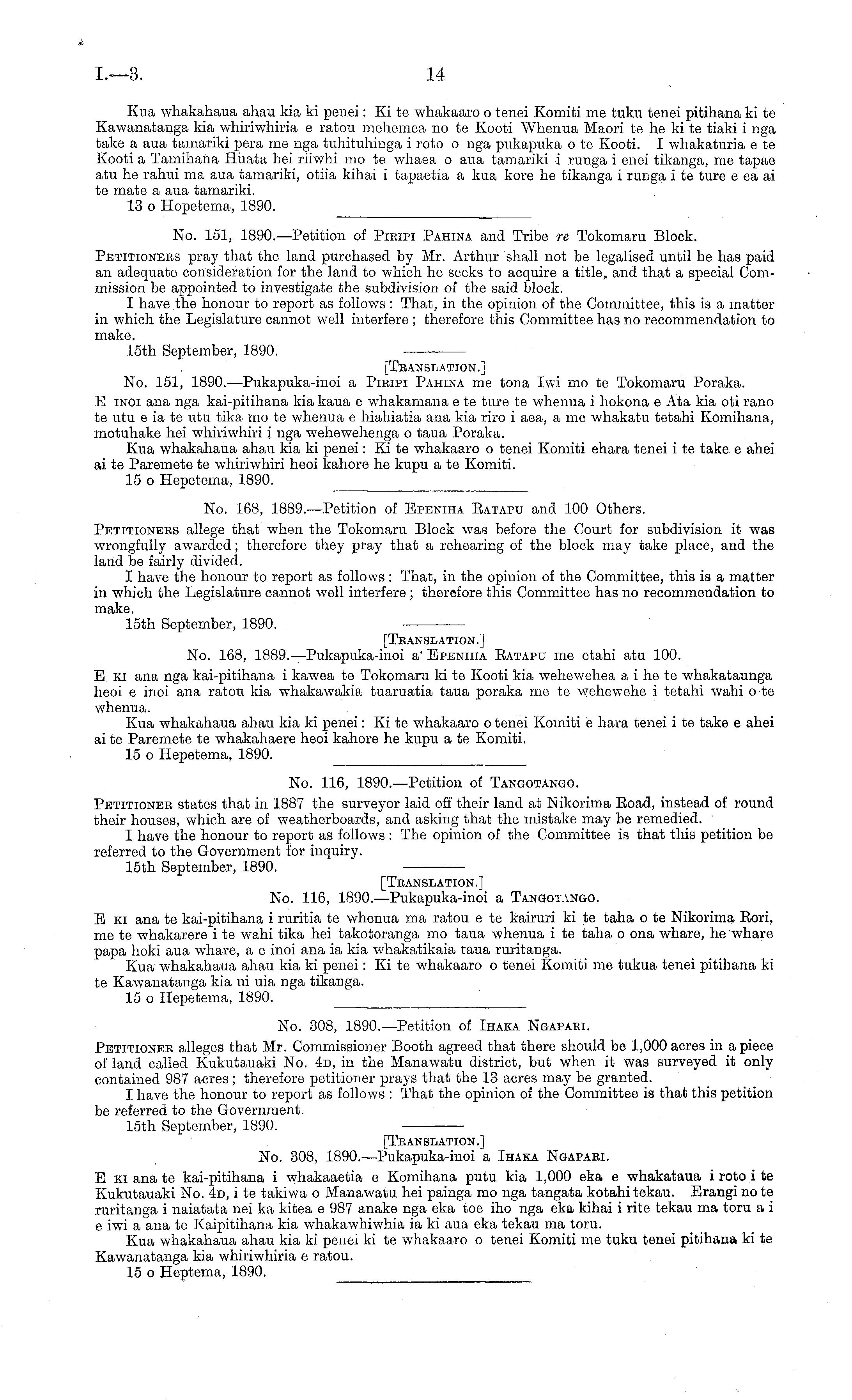 15th September, 1890. [Translation.] No. 116, 1890.-—Pukapuka-inoi a Tangotango. E ki ana te kai-pitihana i ruritia te whenua ma ratou c te kairuri kite taha o te Nikorima Eori, me te whakarere i te wahi tika hei takotorauga mo taua whenua i te taha o ona whare, he whare papa hoki aua whare, a c inoi ana ia kia whakatikaia taua ruritanga. Kua whakahaua ahau kia ki penei: Xi te whakaaro o tenei Komiti me tukua tenei pitihana ki te Kawanatanga kia vi via nga tikanga. 15 o Hepetema, 1890.
