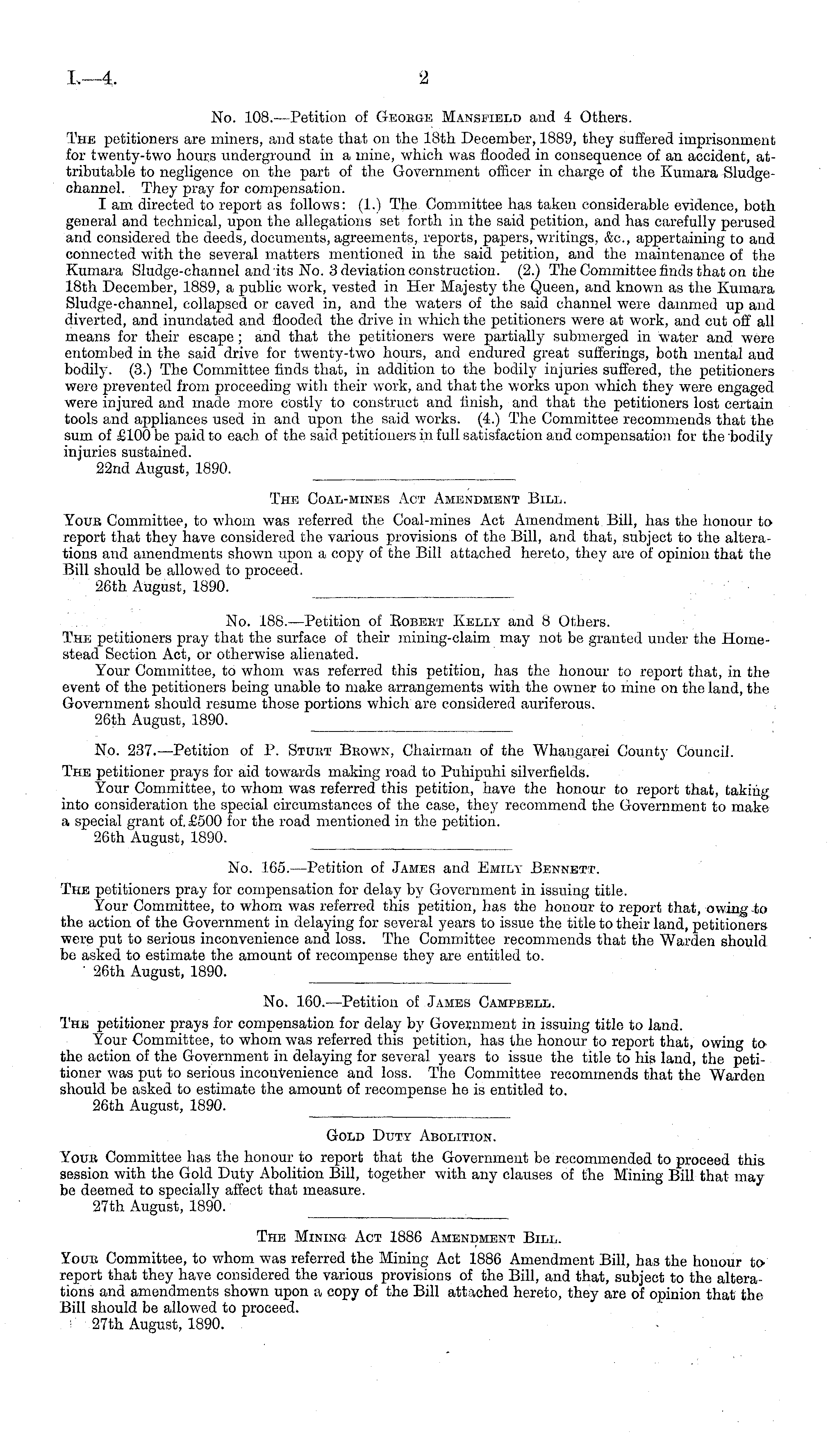 No. 108.—Petition of Geobge Mansfield and 4 Others. The petitioners are miners, and state that on the 18th December, 1889, they suffered imprisonment for twenty-two hours underground in a mine, which was flooded in consequence of an accident, attributable to negligence on the part of the Government officer in charge of the Kumara Sludgechannel. They pray for compensation. lam directed to report as follows: (1.) The Committee has taken considerable evidence, both general and technical, upon the allegations set forth in the said petition, and has carefully perused and considered the deeds, documents, agreements, reports, papers, writings, &c, appertaining to and connected with the several matters mentioned in the said petition, and the maintenance of the Kumara Sludge-channel and its No. 3 deviation construction. (2.) The Committee finds that on the 18th December, 1889, a public work, vested in Her Majesty the Queen, and known as the Kumara Sludge-channel, collapsed or caved in, and the waters of the said channel were dammed up and diverted, and inundated and flooded the drive in which the petitioners were at work, and cut off all means for their escape; and that the petitioners were partially submerged in water and were entombed in the said drive for twenty-two hours, and endured great sufferings, both mental and bodily. (3.) The Committee finds that, in addition to the bodily injuries suffered, the petitioners were prevented from proceeding with their work, and that the works upon which they were engaged were injured and made more costly to construct and finish, and that the petitioners lost certain tools and appliances used in and upon the said works. (4.) The Committee recommends that the sum of £100 be paid to each of the said petitioners in full satisfaction and compensation for the bodily injuries sustained. 22nd August, 1890.