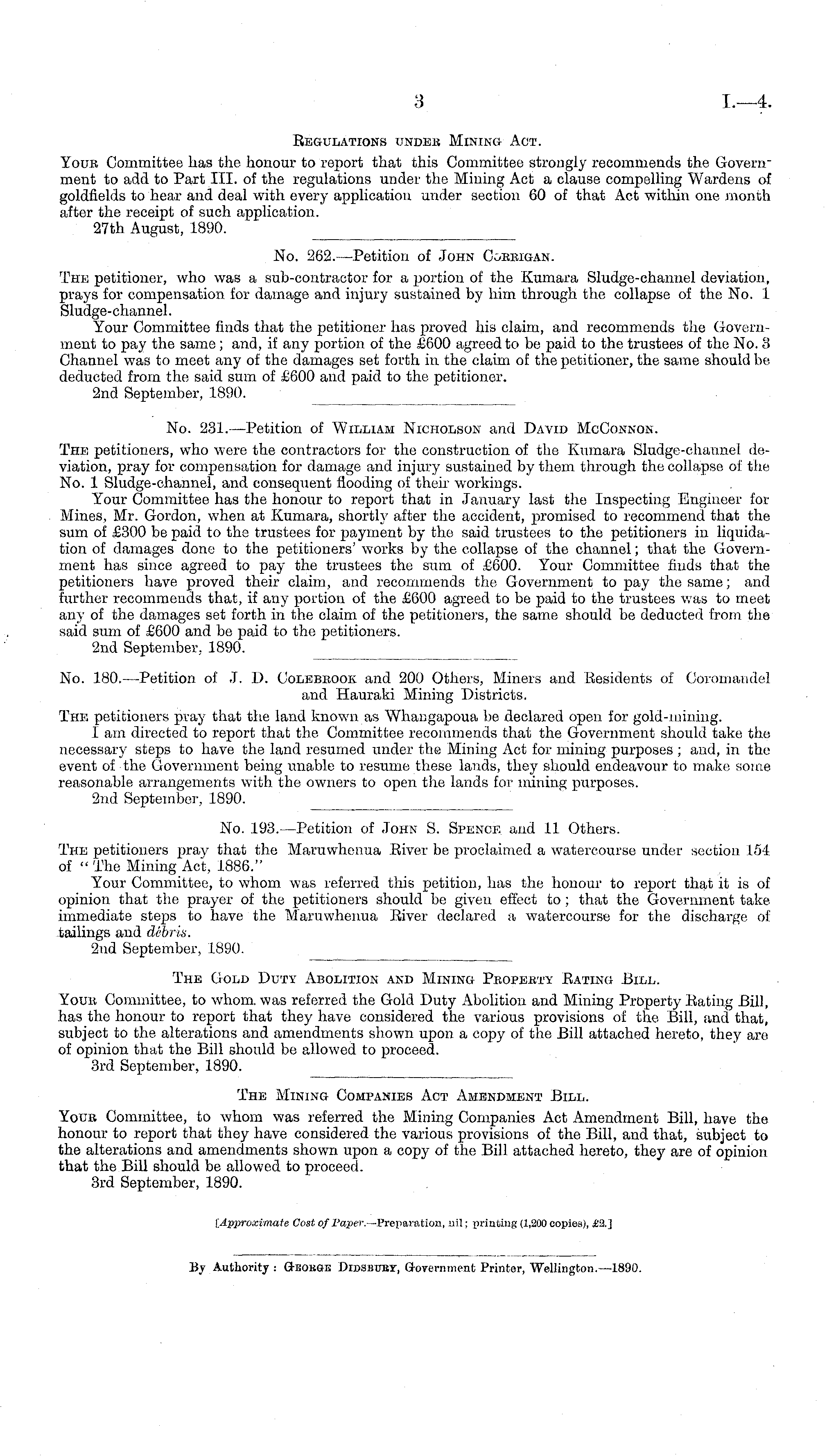 No. 231.—Petition of William Nicholson and David McGoxnon. The petitioners, who were the contractors for the construction of the Kumara Sludge-channel deviation, pray for compensation for damage and injury sustained by them through the collapse of the No. 1 Sludge-channel, and consequent flooding of their workings. Your Committee has the honour to report that in January last the Inspecting Engineer for Mines, Mr. Gordon, when at Kumara, shortly after the accident, promised to recommend that the sum of £300 be paid to the trustees for payment by the said trustees to the petitioners in liquidation of damages done to the petitioners' works by the collapse of the channel; that the Government has since agreed to pay the trustees the sum of £600. Your Committee finds that the petitioners have proved their claim, and recommends the Government to pay the same; and further recommends that, if any portion of the £600 agreed to be paid to the trustees was to meet any of the damages set forth in the claim of the petitioners, the same should be deducted from the said sum of £600 and be paid to the petitioners. 2nd September, 1890.