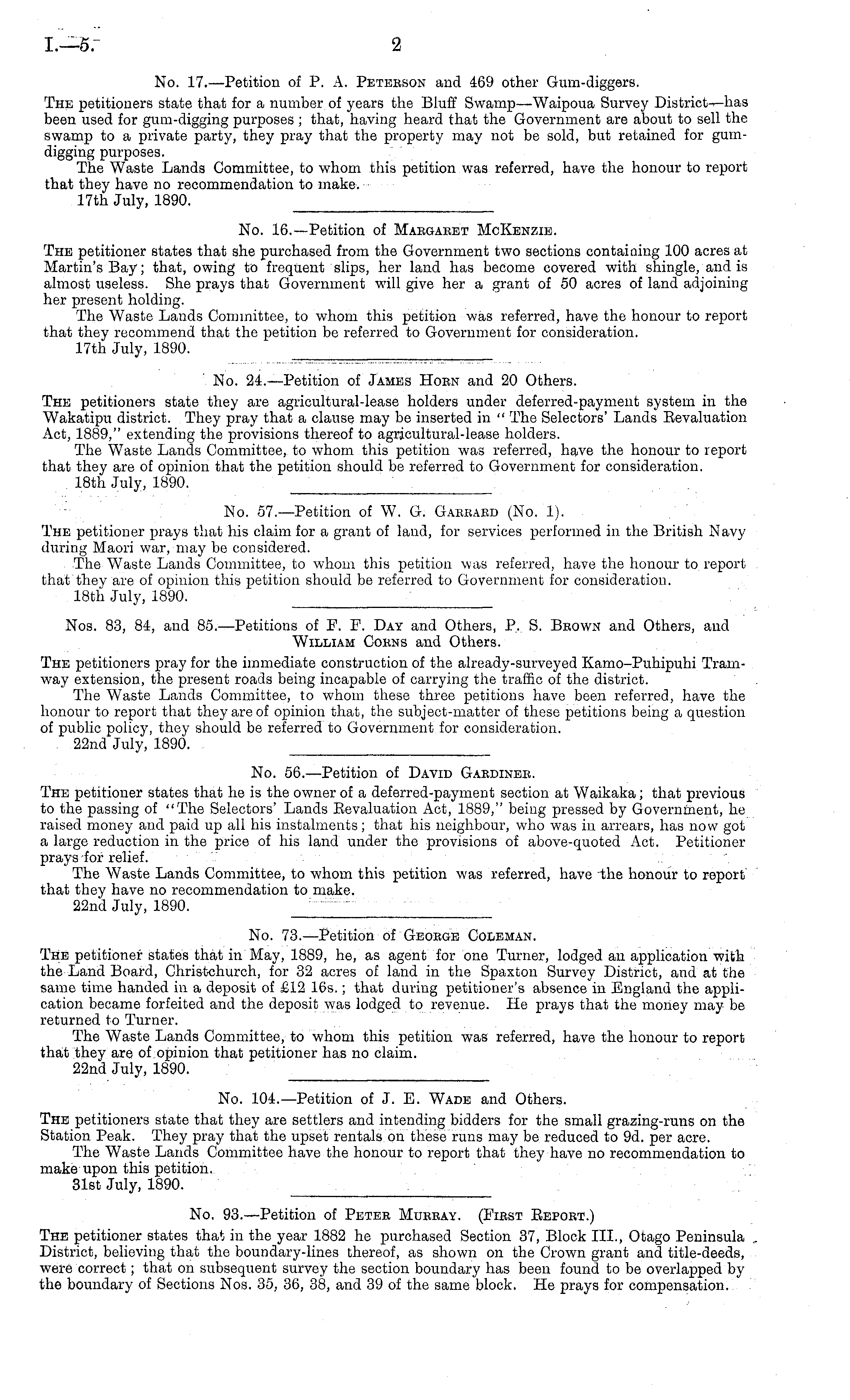 No. 16.—Petition of Maegabet McKenzie. The petitioner states that she purchased from the Government two sections containing 100 acres at Martin's Bay; that, owing to frequent slips, her land has become covered with shingle, and is almost useless. She prays that Government will give her a grant of 50 acres of land adjoining her present holding. The Waste Lands Committee, to whom this petition was referred, have the honour to report that they recommend that the petition be referred to Government for consideration. 17th July, 1890. _______________