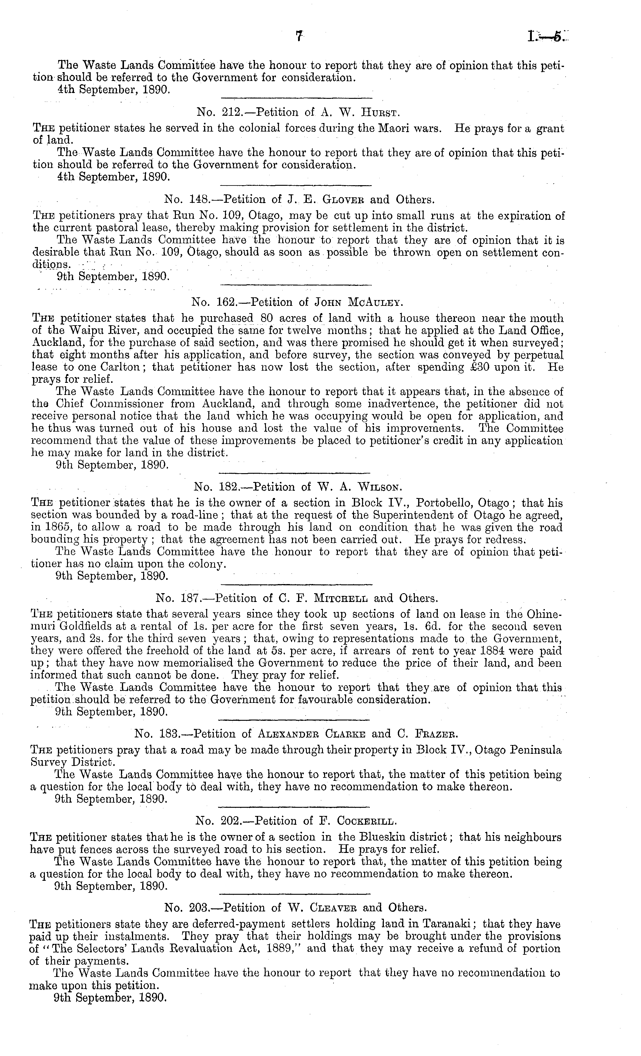 No. 203. —Petition of W. Cleaveb and Others. The petitioners state they are deferred-payment settlers holding land in Taranaki; that they have paid up their instalments. They pray that their holdings may be brought under the provisions of "The Selectors' Lands Eevaluation Act, 1889," and that they may receive a refund of portion of their payments. The Waste Lands Committee have the honour to report that they have no recommendation to make upon this petition. 9th September, 1890.