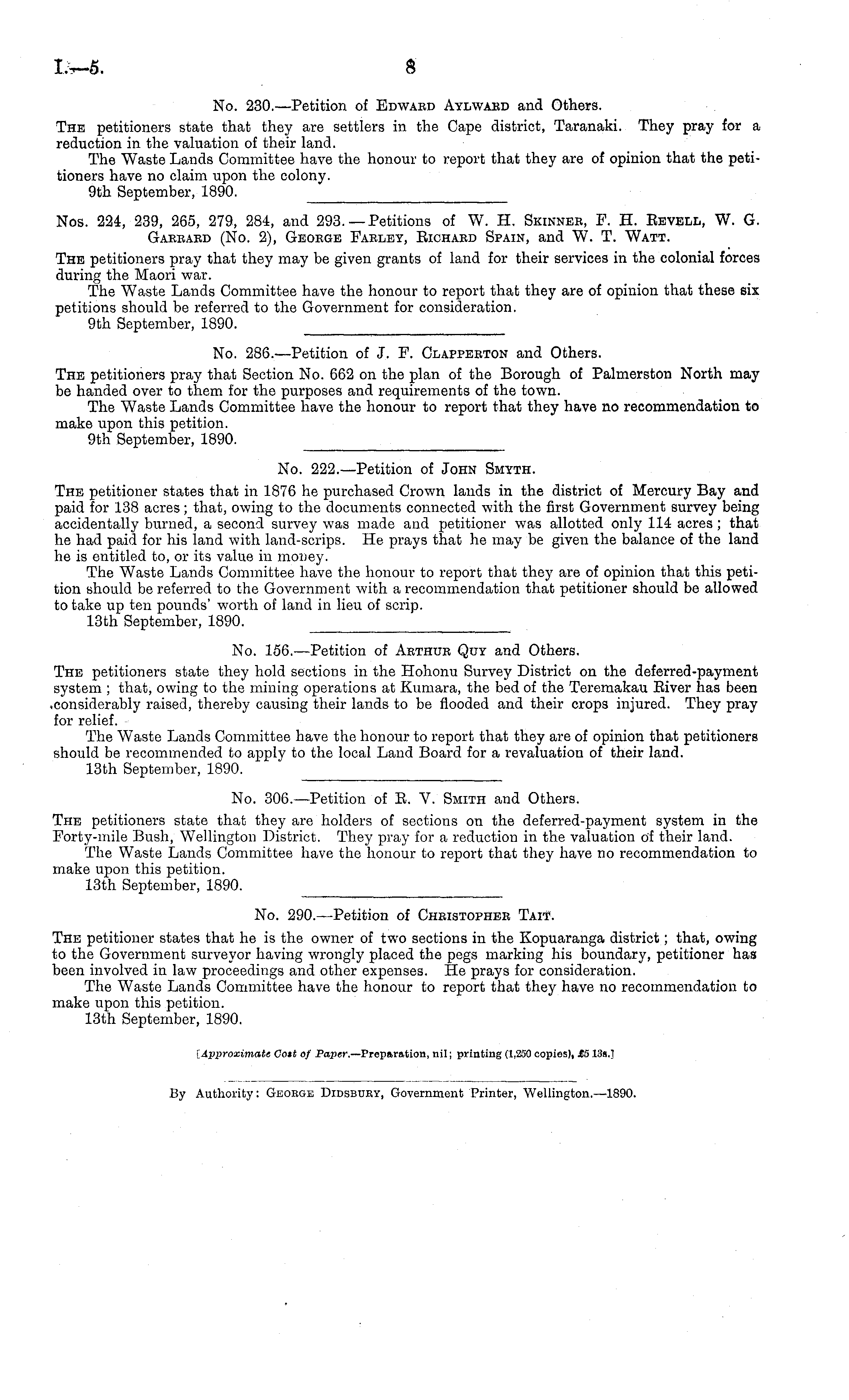 Nos. 224, 239, 265, 279, 284, and 293.—Petitions of W. H. Skinnbe, F. H. Bevell, W. G. Gaeeaed (No. 2), Geoege Faeley, Eichaed Spain, and W. T. Watt. The petitioners pray that they may be given grants of land for their services in the colonial forces during the Maori war. The Waste Lands Committee have the honour to report that they are of opinion that these six petitions should be referred to the Government for consideration. 9th September, 1890.