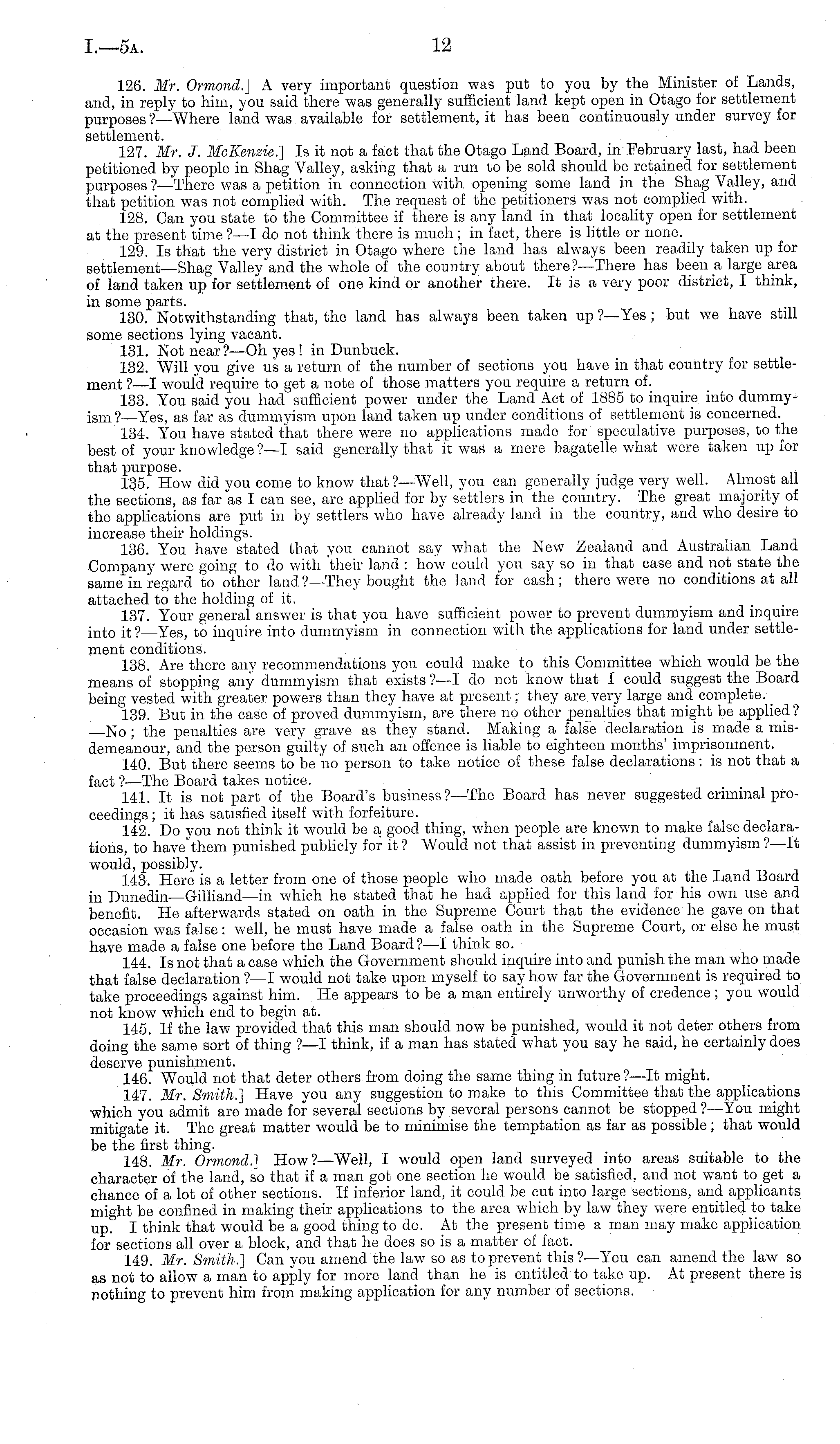 126. Mr. Ormoncl.] A very important question was put to you by the Minister of Lands, and, in reply to him, you said there was generally sufficient land kept open in Otago for settlement purposes ?—Where land was available for settlement, it has been continuously under survey for settlement. 127. Mr. J. McKenzie.] Is it not a fact that the Otago Land Board, in February last, had been petitioned by people in Shag Valley, asking that a run to be sold should be retained for settlement purposes ?—There was a petition in connection with opening some land in the Shag Valley, and that petition was not complied with. The request of the petitioners was not complied with. 128. Can you state to the Committee if there is any land in that locality open for settlement at the present time ?—I do not think there is much; in fact, there is little or none. 129. Is that the very district in Otago where the land has always been readily taken up for settlement—Shag Valley and the whole of the country about there?— There has been a large area of land taken up for settlement of one kind or another there. It is a very poor district, I think, in some parts. 130. Notwithstanding that, the land has always been taken up ?—Yes; but we have still some sections lying vacant. 131. Not near? —Oh yes ! in Dunbuck. 132. Will you give us a return of the number of sections you have in that country for settlement ?—I would require to get a note of those matters you require a return of. 133. You said you had sufficient power under the Land Act of 1885 to inquire into dummyism? —Yes, as far as dummyism upon land taken up under conditions of settlement is concerned. 134. Y"ou have stated that there were no applications made for speculative purposes, to the best of your knowledge ?—I said generally that it was a mere bagatelie what were taken up for that purpose. 135. How did you come to know that?— Well, you can generally judge very well. Almost all the sections, as far as 1 can see, are applied for by settlers in the country. The great majority of the applications are put in by settlers who have already land in the country, and who desire to increase their holdings. 136. You have stated that you cannot say what the New Zealand and Australian Land Company were going to do with their land : how could you say so in that case and not state the same in regard to other land? —They bought the land for cash; there were no conditions at all attached to the holding of it. 137. Your general answer is that you have sufficient power to prevent dummyism and inquire into it ? —Yes, to inquire into dummyism in connection with the applications for land under settlement conditions. 138. Are there any recommendations you could make to this Committee which would be the means of stopping any dummyism that exists ? —I do not know that I could suggest the Board being vested with/greater powers than they have at present; they are very large and complete. _ 139. But in the case of proved dummyism, are there no other penalties that might be applied? No ; the penalties are very grave as they stand. Making a false declaration is made a misdemeanour, and the person guilty of such an offence is liable to eighteen months' imprisonment. 140. But there seems to be no person to take notice of these false declarations: is not that a fact ? —The Board takes notice. 141. It is not part of the Board's business? —The Board has never suggested criminal proceedings ; it has satisfied itself with forfeiture. 142. Do you not think it would be a good thing, when people are known to make false declarations, to have them punished publicly for it ? Would not that assist in preventing dummyism ?—lt would, possibly. 143. Here is a letter from one of those people who made oath before you at the Land Board in Dunedin Gilliand —in which he stated that he had applied for this land for his own use and benefit. He afterwards stated on oath in the Supreme Court that the evidence he gave on that occasion was false: well, he must have made a false oath in the Supreme Court, or else he must have made a false one before the Land Board?—l think so. 144. Is not that a case which the Government should inquire into and punish the man who made that false declaration ?—I would not take upon myself to say how far the Government is required to take proceedings against him. He appears to be a man entirely unworthy of credence ; you would not know which end to begin at. 145. If the law provided that this man should now be punished, would it not deter others from doing the same sort of thing ? —I think, if a man has stated what you say he said, he certainly does deserve punishment. 146. Would not that deter others from doing the same thing in future ?—lt might. 147. Mr. Smith.] Have you any suggestion to make to this Committee that the applications which you admit are made for several sections by several persons cannot be stopped ?—You might mitigate it. The great matter would be to minimise the temptation as far as possible; that would be the first thing. 148. Mr. Ormond.] How? —Well, I would open land surveyed into areas suitable to the character of the land, so that if a man got one section he would be satisfied, and not want to get a chance of a lot of other sections. If inferior land, it could be cut into large sections, and applicants might be confined in making their applications to the area which by law they were entitled to take up. I think that would be a good thing to do. At the present time a man may make application for sections all over a block, and that he does so is a matter of fact. 149. Mr. Smith.] Can you amend the law so as to prevent this?— You can amend the law so as not to allow a man to apply for more land than he is entitled to take up. At present there is nothing to prevent him from making application for any number of sections.