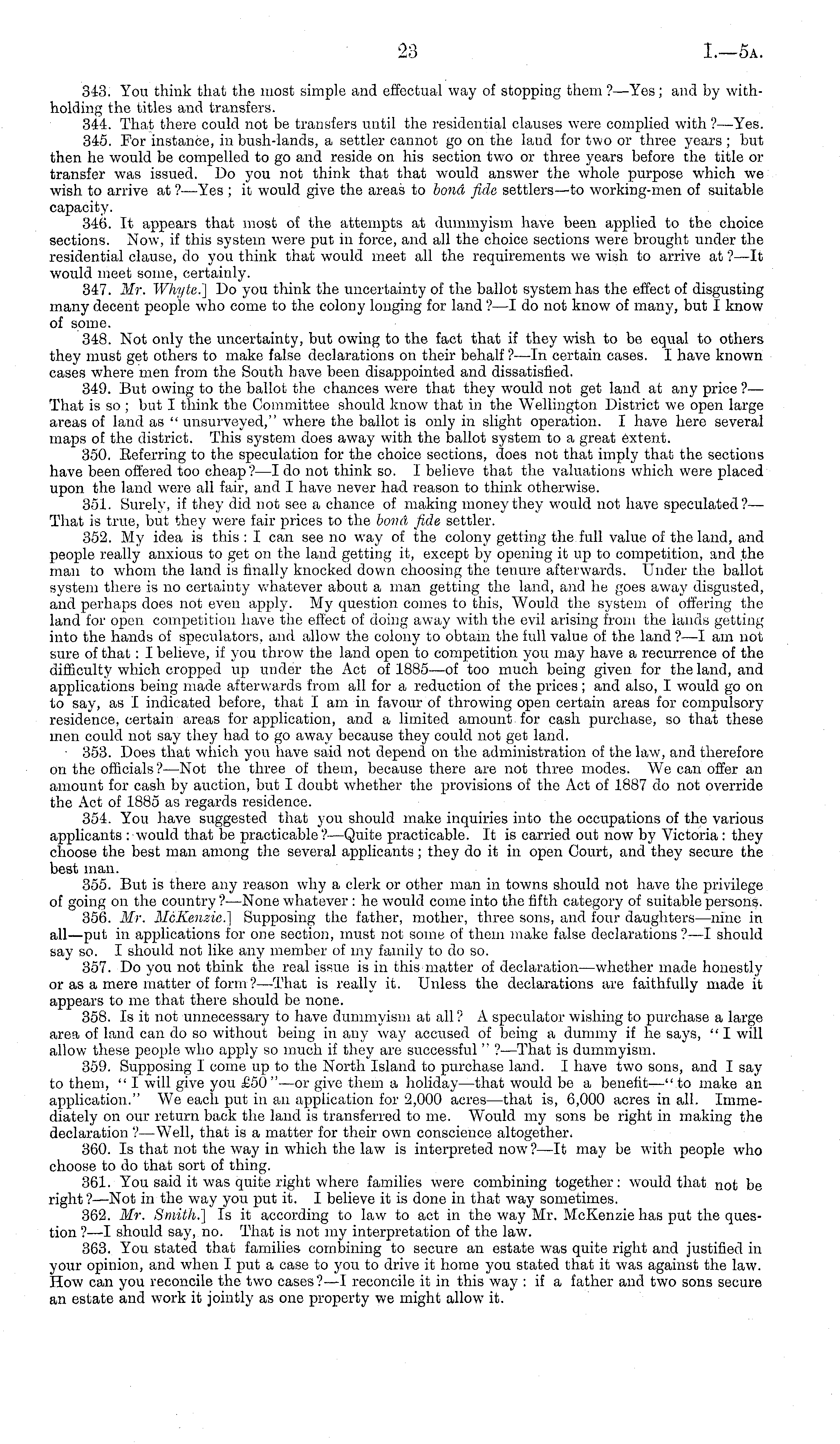343. You think that the most simple and effectual way of stopping them ? —Yes; and by withholding the titles and transfers. 344. That there could not be transfers until the residential clauses were complied with ?—Yes. 345. For instance, in bush-lands, a settler cannot go on the land for two or three years ; but then he would be compelled to go and reside on his section two or three years before the title or transfer was issued. Do you not think that that would answer the whole purpose which we wish to arrive at ?—Yes ; it would give the areas to bond fide settlers—to working-men of suitable capacity. 346. It appears that most of the attempts at dummyism have been applied to the choice sections. Now, if this system were put in force, and all the choice sections were brought under the residential clause, do you think that would meet all the requirements we wish to arrive at'? —It would meet some, certainly. 347. Mr. Whytc] Do you think the uncertainty of the ballot system has the effect of disgusting many decent people who come to the colony longing for land ?—I do not know of many, but I know of some. 348. Not only the uncertainty, but owing to the fact that if they wish to be equal to others they must get others to make false declarations on their behalf ? —ln certain cases. I have known cases where men from the South have been disappointed and dissatisfied. 349. But owing to the ballot the chances were that they would not get land at any price ?— That is so ; but I think the Committee should know that in the Wellington District we open large areas of land as " unsurveyed," where the ballot is only in slight operation. I have here several maps of the district. This system does away with the ballot system to a great extent. 350. Referring to the speculation for the choice sections, does not that imply that the sections have been offered too cheap?—l do not think so. I believe that the valuations which were placed upon the land were all fair, and I have never had reason to think otherwise. 351. Surely, if they did not see a chance of making money they would not have speculated?— That is true, but they were fair prices to the bond fide settler. 352. My idea is this : I can see no way of the colony getting the full value of the land, and people really anxious to get on the land getting it, except by opening it up to competition, and the man to whom the land is finally knocked down choosing the tenure afterwards. Under the ballot system there is no certainty whatever about a man getting the land, and he goes away disgusted, and perhaps does not even apply. My question comes to this, Would the system of offering the land for open competition have the effect of doing away with the evil arising from the lauds getting into the hands of speculators, and allow the colony to obtain the full value of the land s , —I am not sure of that: I believe, if you throw the land open to competition you may have a recurrence of the difficulty which cropped up under the Act of 1885—of too much being given for the land, and applications being made afterwards from all for a reduction of the prices; and also, I would go on to say, as I indicated before, that I am in favour of throwing open certain areas for compulsory residence, certain areas for application, and a limited amount for cash purchase, so that these men could not say they had to go away because they could not get land. ■ 353. Does that which you have said not depend on the administration of the law, and therefore on the officials ? —Not the three of them, because there are not three modes. We can offer an amount for cash by auction, but I doubt whether the provisions of the Act of 1887 do not override the Act of 1885 as regards residence. 354. You have suggested that you should make inquiries into the occupations of the various applicants : would that be practicable?— Quite practicable. It is carried out now by Victoria : they choose the best man among the several applicants; they do it in open Court, and they secure the best man. 355. But is there any reason why a clerk or other man in towns should not have the privilege of going on the country ?—None whatever : he would come into the fifth category of suitable persons. 356. Mr-. McKeuzie.} Supposing the father, mother, three sons, and four daughters —nine in all—put in applications for one section, must not some of them make false declarations ?—I should say so. I should not like any member of my family to do so. 357. Do you not think the real issue is in this matter of declaration—whether made honestly or as a mere matter of form ?—That is really it. Unless the declarations are faithfully made it appears to me that there should be none. 358. Is it not unnecessary to have dummyism at all ? A speculator wishing to purchase a large area of land can do so without being in any way accused of being a dummy if he says, " I will allow these people who apply so much if they are successful " ?—That is dummyism. 359. Supposing 1 come up to the North Island to purchase land. I have two sons, and I say to them, " I will give you £50" —or give them a holiday—that would be a benefit—" to make an application." We each put in an application for 2,000 acres —that is, 6,000 acres in all. Immediately on our return back the land is transferred to me. Would my sons be right in making the declaration ?—Well, that is a matter for their own conscience altogether. 360. Is that not the way in which the law is interpreted now ? —lt may be with people who choose to do that sort of thing. 361. You said it was quite right where families were combining together: would that not be right ?—Not in the way you put it. I believe it is done in that way sometimes. 362. Mr. Smith.] Is it according to law to act in the way Mr. McKenzie has put the question ?—I should say, no. That is not my interpretation of the law. 363. You stated that families combining to secure an estate wa