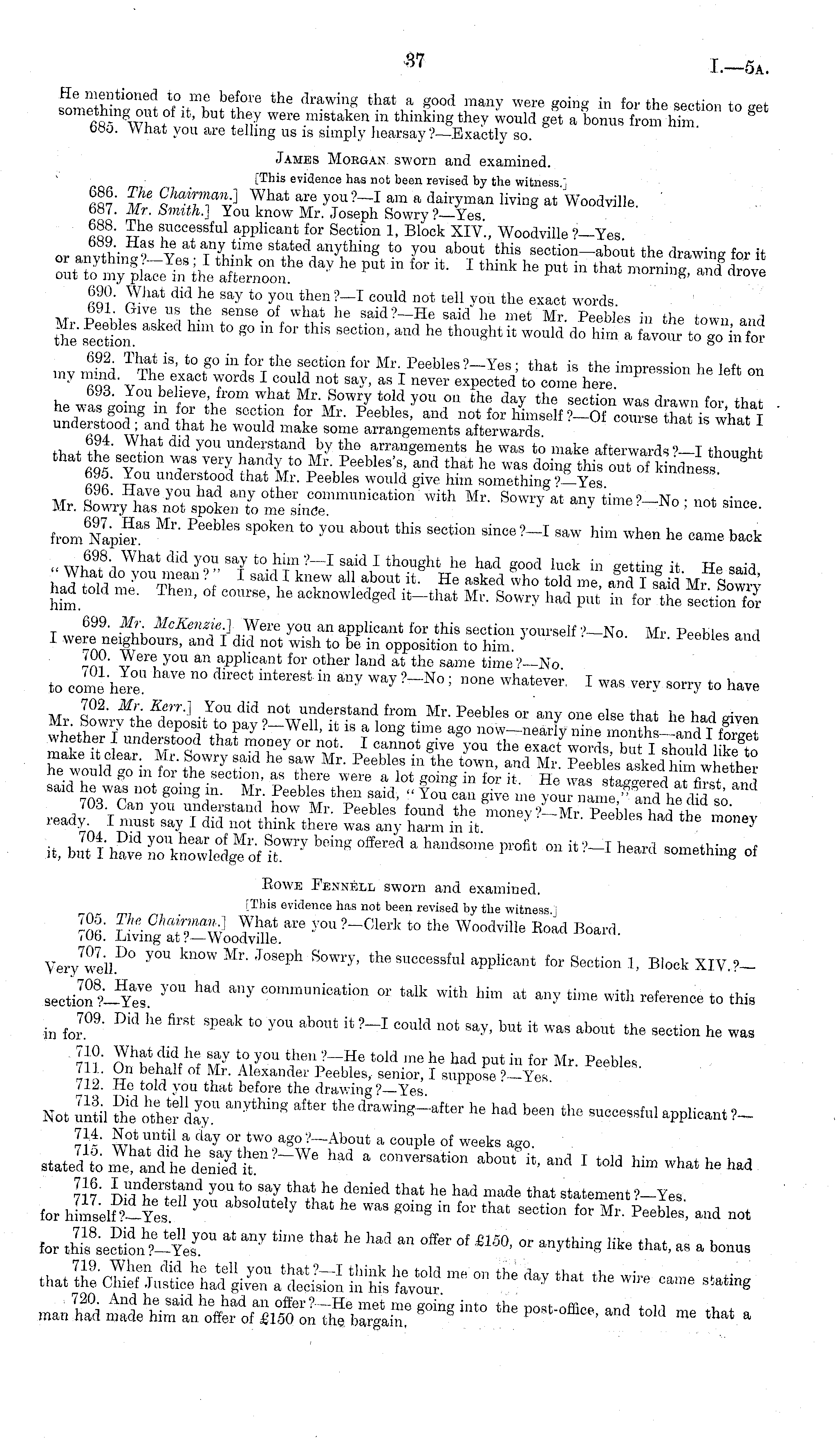 He mentioned to me before the drawing that a good many were going fo f or the section to ~t something out of it, but they were mistaken in thinking they would get a bonus from him S Wo. What you are telling us is simply hearsay ?—Exactly so. Jambs Moegan sworn and examined. [This evidence has not been revised by the witness j *W M le ? a^T v ] What are y ° U ? ~ I am a dair living at'Woodville. ' 687. Mr. Smith.] You know Mr. Joseph Sowry ?—Yes coo' v ie f TCcessful applicant for Section 1, Block XIV., Woodville ?—Yes or anvthirS 8 Y»t?Z *T st f* ed /"y thin g to / ou this section-about the drawing for It day he put ,r, tor '*• J think he in that mo - K °- -690. What did he say to you then ?-I could not tell you the exact words \r p w (xlVe , lls l , the sense of what he said?—He said he met Mr. Peebles in the town and the section" "'°g° " *" 89Ction ' and he thought it would do him a favour to infor 692 That is, to go in for the section for Mr. Peebles ?-Yes; that is the impression he left on my mind. The exact words I could not say, as I never expected to come here P bJ3. You beheve, from what Mr. Sowry told you on the day the section was drawn for rtmt 695. You understood that Mr. Peebles would give him something 7—Ym Kinrtness - M, n^spin^^r 1 ™ 1 "^ 0, " 1 S^at ; not since, from Nip!?" M, "' PeeWeS t0 7 ° U ab ° Ut SeCti ° n sincft? -I »™ him when lie came back T,v 6 "' J/cA " e .Were you an applicant for this section yourself ?_No Mr Peebles and I were neighbours, and I did not wish to be in opposition to him DleS and ,00. Were you an applicant for other land at the same time?—No to come hire" °° **"* iUtereBt ™My Wy ? - N ° ; "° ne whate ™ I was very sorry to have 702. Jfr. Zew.] You did not understand from Mr. Peebles or any one else that he hari oiver. said he was not going in Mr. Peebles then said, » You cau give me you Tame/ ? S"he dM so 703 Can you understand how Mr. Peebles found the money ?L Mr Peebles had the money ready. I must say I did not think there was any harm in it m ° ney it, but I have SSCof ?r y bping ° Semd a handBOme Pl ' Ofit °" it? ~ X hearf of Eowe Fennell sworn and examined. [This evidence has not been revised by the witness 705. The Ohamnav,] What are you ?-Clerk to the Woodville Eoad Board ivb. JUivmg at ?—Woodville. Yerv 7 well J)o know Mr - Jose P h the successful applicant for Section 1, Block XIV.?y ° U had a ' iy COmmunication or talk him at any time with reference to this in JO9. Did he first speak to you about it ?-I could not say, but it was about the section he was ™" T yOU le " ? ~ He told me he had P ut in for Mr. Peebles 7 • Ou behalf of Mr. Alexander Peebles, senior, I suppose ?-Yes 1 1-2, He told you that before the drawing?— Yes Not SSI Sler'r anythiDg aftCr he had been the successful applicant ?- l)*t- Not until a day or two ago?— About a couple of weeks ago stated to Z^dtlSt 11 ? ~ We had a COnVerSatiOn h ' aM J told hi - he had 717" Did n w ta i nd y0U I t ° »/ that he denied that he had made that statement ?-Yes for hliselK-Yes *" "" g ° ing " f ° r that section fOT Mr. Peebfe, and not for thi'seSon^-ts 70 " "* " , tU ' le aU ° ffer ° f £150 ' Or that, as a bonus 'he wire came seating K anS2eSS£^:^ ingintO the post-office, and told me that a