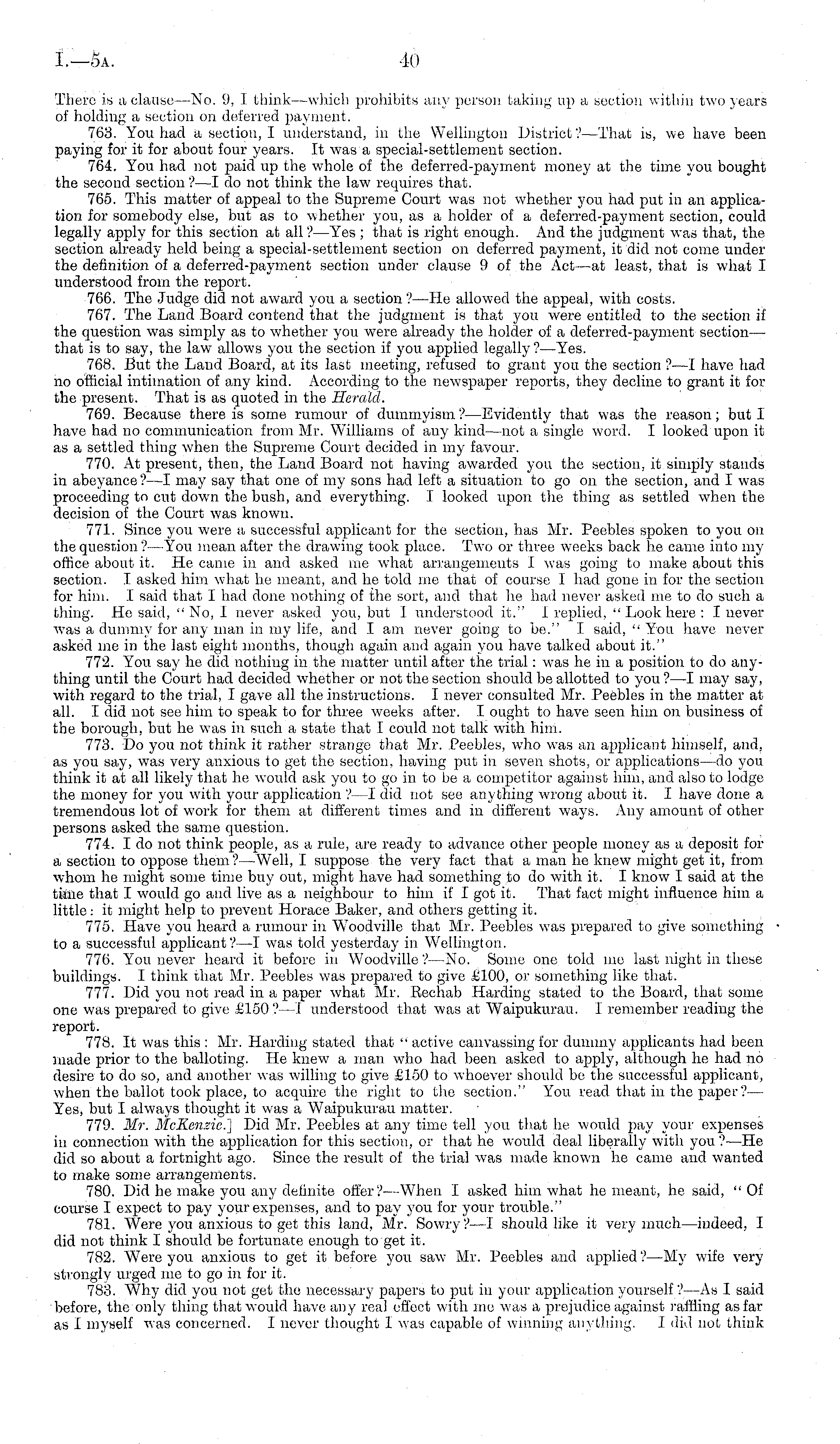 There is a clause —No. 9, 1 think—which prohibits any person taking up a section within two years of holding a section on deferred payment. 763. You had a section, I understand, in the Wellington District ?—That is, we have been paying for it for about four years. It was a special-settlement section. 764. You had not paid up the whole of the deferred-payment money at the time you bought the second section ?—I do not think the law requires that. 765. This matter of appeal to the Supreme Court was not whether you had put in an application for somebody else, but as to whether you, as a holder of a deferred-payment section, could legally apply for this section at all ? —Yes ; that is right enough. And the judgment was that, the section already held being a special-settlement section on deferred payment, it did not come under the definition of a deferred-payment section under clause 9 of the Act—at least, that is what I understood from the report. 766. The Judge did not award you a section?—He allowed the appeal, with costs. 767. The Land Board contend that the judgment is that you were entitled to the section if the question was simply as to whether you were already the holder of a deferred-payment section— that is to say, the law allows you the section if you applied legally ? —Yes. 768. But the Land Board, at its last meeting, refused to grant you the section ? —I have had no official intimation of any kind. According to the newspaper reports, they decline to grant it for the present. That is as quoted in the Herald. 769. Because there is some rumour of dummyism ?—Evidently that was the reason; but I have had no communication from Mr. Williams of any kind —not a single word. I looked upon it as a settled thing when the Supreme Court decided in my favour. 770. At present, then, the Land Board not having awarded you the section, it simply stands in abeyance?—l may say that one of my sons had left a situation to go on the section, and I was proceeding to cut down the bush, and everything. I looked upon the thing as settled when the decision of the Court was known. 771. Since you were a successful applicant for the section, has Mr. Peebles spoken to you on the question ?—You mean after the drawing took place. Two or three weeks back he came into my office about it. He came in and asked me what arrangements I was going to make about this section. I asked him what he meant, and he told me that of course I had gone in for the section for him. I said that I had done nothing of the sort, and that he had never asked me to do such a thing. He said, " No, I never asked you, but I understood it." I replied, " Look here : I never was a dummy for any man in my life, and I am never going to bo." I said, " You have never asked me in the last eight months, though again and again you have talked about it." 772. You say he did nothing in the matter until after the trial: was he in a position to do anything until the Court had decided whether or not the section should be allotted to you ?—I may say, with regard to the trial, I gave all the instructions. I never consulted Mr. Peebles in the matter at all. I did not see him to speak to for three weeks after. I ought to have seen him on business of the borough, but he was in such a state that I could not talk with him. 773. Do you not think it rather strange that Mr. Peebles, who was an applicant himself, and, as you say, was very anxious to get the section, having put in seven shots, or applications —do you think it at all likely that he would ask you to go in to be a competitor against him, and also to lodge the money for you with your application ? —I did not see anything wrong about it. I have done a tremendous lot of work for them at different times and in different ways. Any amount of other persons asked the same question. 774. I do not think people, as a rule, are ready to advance other people money as a deposit for a section to oppose them? —Well, I suppose the very fact that a man he knew might get it, from whom lie might some time buy out, might have had something to do with it. I know I said at the time that I would go and live as a neighbour to him if I got it. That fact might influence him a little: it might help to prevent Horace Baker, and others getting it. 775. Have you heard a rumour in Woodville that Mr. Peebles was prepared to give something to a successful applicant? —1 was told yesterday in Wellington. 776. You never heard it before in Woodville ? No. Some one told me last night in these buildings. I think that Mr. Peebles was prepared to give £100, or something like that. 777. Did you not read in a paper what Mr. Bechab Harding stated to the Board, that some one was prepared to give £150 ?—I understood that was at Waipukurau. I remember reading the report. 778. It was this : Mr. Harding stated that " active canvassing for dummy applicants had been made prior to the balloting. He knew a man who had been asked to apply, although he had no desire to do so, and another was willing to give £150 to whoever should be the successful applicant, when the ballot took place, to acquire the right to the section." You read that in the paper ?— Yes, but I always thought it was a Waipukurau matter. 779. Mr. McKenzie.] Did Mr. Peebles at any time tell you that he would pay your expenses in connection with the application for this section, or that lie would deal liberally with you? —He did so about a fortnight ago. Since the result of the trial was made known he came and wanted to make some arrangements. 780. Did he make you any definite offer?— When I asked him what he meant, he said, "Of course I expect to pay your expenses, and to pay you for your trouble." 781. Were you anxious to get this land, Mr. Sowry?—l should like it very much—indeed, I did not think I should be fortunate enough to get it. 782. Were you anxious to get it before you saw Mr. Peebles and applied ?—My wife very strongly urged me to