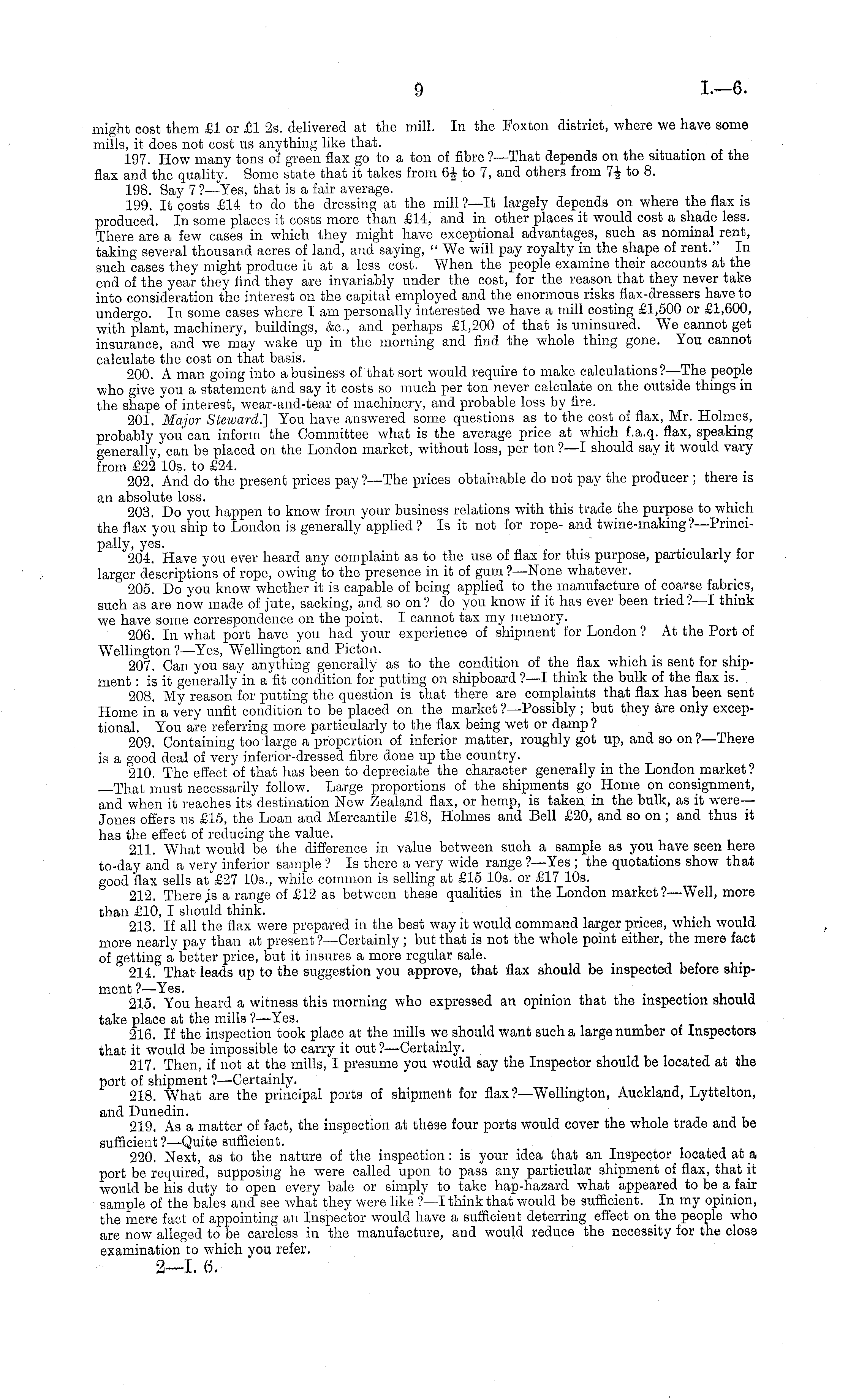 might cost them £1 or £1 2s. delivered at the mill. In the Foxton district, where we have some mills, it does not cost us anything like that. 197. How many tons of green flax go to a ton of fibre ?—That depends on the situation of the flax and the quality. Some state that it takes from 6£ to 7, and others from 7i to 8. 198. Say 7 ?—Yes, that is a fair average. 199. It costs £14 to do the dressing at the mill ?—lt largely depends on where the flax is produced. In some places it costs more than £14, and in other places it would cost a shade less. There are a few cases in which they might have exceptional advantages, such as nominal rent, taking several thousand acres of land, and saying, "We will pay royalty in the shape of rent." In such cases they might produce it at a less cost. When the people examine their accounts at the end of the year they find they are invariably under the cost, for the reason that they never take into consideration the interest on the capital employed and the enormous risks flax-dressers have to undergo. In some cases where lam personally interested we have a mill costing £1,500 or £1,600, with plant, machinery, buildings, &c, and periiaps £1,200 of that is uninsured. We cannot get insurance, and we may wake up in the morning and find the whole thing gone. You cannot calculate the cost on that basis. 200. A man going into a business of that sort would require to make calculations ?—The people who give you a statement and say it costs so much per ton never calculate on the outside things in the shape of interest, wear-and-tear of machinery, and probable loss by fire. 201. Major Steward.] You have answered some questions as to the cost of flax, Mr. Holmes, probably you can inform the Committee what is the average price at which f.a.q. flax, speaking generally, can be placed on the London market, without loss, per ton ?—I should say it would vary from £22 10s. to £24. 202. And do the present prices pay?— The prices obtainable do not pay the producer ; there is an absolute loss. 203. Do you happen to know from your business relations with this trade the purpose to which the flax you ship to London is generally applied ? Is it not for rope- and twine-making ?—Principally, yes. ~i. 204. Have you ever heard any complaint as to the use of flax for this purpose, particularly for larger descriptions of rope, owing to the presence in it of gum ?—None whatever. 205. Do you know whether it is capable of being applied to the manufacture of coarse fabrics, such as are now made of jute, sacking, and so on? do you know if it has ever been tried?—l think we have some correspondence on the point. I cannot tax my memory. 206. In what port have you had your experience of shipment for London ? At the Port of Wellington? —Yes, Wellington and Picton. 207. Can you say anything generally as to the condition of the flax which is sent for shipment :is it generally in a fit condition for putting on shipboard ?—I think the bulk of the flax is. 208. My reason for putting the question is that there are complaints that flax has been sent Home in a very unfit condition to be placed on the market ?—Possibly ; but they are only exceptional. You are referring more particularly to the flax being wet or damp ? 209. Containing too large a proportion of inferior matter, roughly got up, and so on ?—There is a good deal of very inferior-dressed fibre done up the country. 210. The effect of that has been to depreciate the character generally in the London market ? That must necessarily follow. Large proportions of the shipments go Home on consignment, and when it reaches its destination New Zealand flax, or hemp, is taken in the bulk, as it were— Jones offers us £15, the Loan and Mercantile £18, Holmes and Bell £20, and so on ; and thus it has the effect of reducing the value. 211. What would be the difference in value between such a sample as you have seen here to-day and a very inferior sample ? Is there a very wide range ?—Yes ; the quotations show that good flax sells at £27 10s., while common is selling at £15 10s. or £17 10s. 212. There;s a range of £12 as between these qualities in the London market?— Well, more than £10, I should think. _ 213. If all the flax were prepared in the best way it would command larger prices, which would more nearly pay than at present ?—Certainly ; but that is not the whole point either, the mere fact of getting a better price, but it insures a more regular sale. 214. That leads up to the suggestion you approve, that flax should be inspected before shipment? —Yes. . , 215. You heard a witness this morning who expressed an opinion that the inspection should take place at the mills ?—Yes. 216. If the inspection took place at the mills we should want such a large number of Inspectors that it would be impossible to carry it out ?—Certainly. 217. Then, if not at the mills, I presume you would say the Inspector should be located at the port of shipment ?—Certainly. 218. What are the principal ports of shipment for flax ?—Wellington, Auckland, Lyttelton, and Dunedin. 219. As a matter of fact, the inspection at these four ports would cover the whole trade and be sufficient ?—Quite sufficient. 220. Next, as to the nature of the inspection: is your idea that an Inspector located at a, port be required, supposing he were called upon to pass any particular shipment of flax, that it would be his duty to open every bale or simply to take hap-hazard what appeared to be a fair sample of the bales and see what they were like ?—I think that would be sufficient. In my opinion, the mere fact of appointing an Inspector would have a sufficient deterring effect on the people who are now alleged to be careless in the manufacture, and would reduce the necessity for the close examination to which you refer.