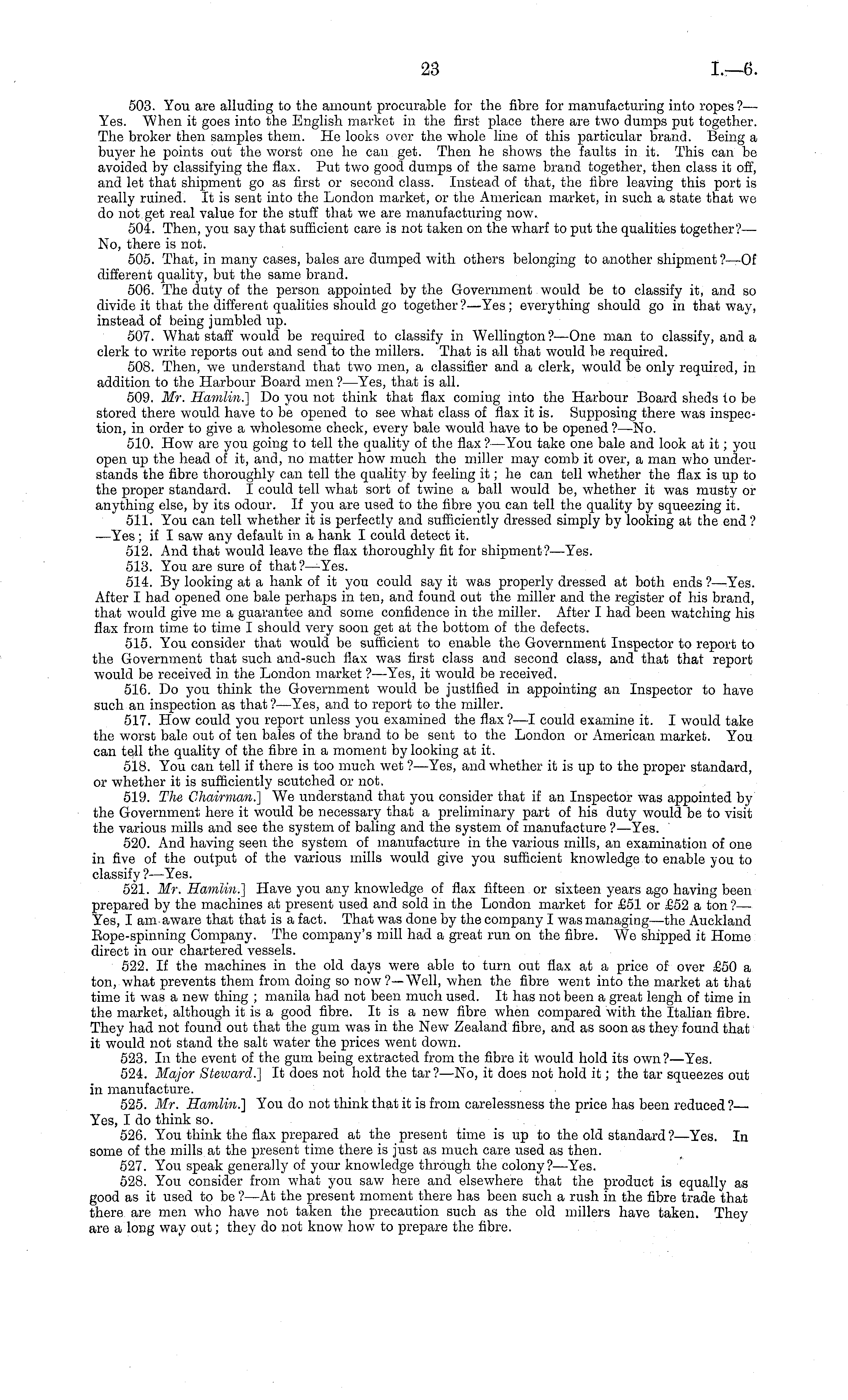 503. You are alluding to the amount procurable for the fibre for manufacturing into ropes?— Yes. When it goes into the English market in the first place there are two dumps put together. The broker then samples them. He looks over the whole line of this particular brand. Being a buyer he points out the worst one he can get. Then he shows the faults in it. This can be avoided by classifying the flax. Put two good dumps of the same brand together, then class it off, and let that shipment go as first or second class. Instead of that, the fibre leaving this port is really ruined. It is sent into the London market, or the American market, in such a state that we do not get real value for the stuff that we are manufacturing now. 504. Then, you say that sufficient care is not taken on the wharf to put the qualities together?— No, there is not. 505. That, in many cases, bales are dumped with others belonging to another shipment ?—Of different quality, but the same brand. 506. The duty of the person appointed by the Government would be to classify it, and so divide it that the different qualities should go together?— Yes; everything should go in that way, instead of being jumbled up. 507. What staff would be required to classify in Wellington? —One man to classify, and a clerk to write reports out and send to the millers. That is all that would be required. 508. Then, we understand that two men, a classifier and a clerk, would be only required, in addition to the Harbour Board men ? —Yes, that is all. 509. Mr. Hamlin.] Do you not think that flax coining into the Harbour Board sheds to be stored there would have to be opened to see what class of flax it is. Supposing there was inspect tion, in order to give a wholesome check, every bale would have to be opened ?—No. 510. How are you going to tell the quality of the flax ? —You take one bale and look at it; you open up the head of it, and, no matter how much the miller may comb it over, a man who understands the fibre thoroughly can tell the quality by feeling it; he can tell whether the flax is up to the proper standard. I could tell what sort of twine a ball would be, whether it was musty or anything else, by its odour. If you are used to the fibre you can tell the quality by squeezing it. 511. You can tell whether it is perfectly and sufficiently dressed simply by looking at the end ? —Yes; if I saw any default in a hank I could detect it. 512. And that would leave the flax thoroughly fit for shipment?— Yes. 513. You are sure of that?— Yes. 514. By looking at a hank of it you could say it was properly dressed at both ends ?—Yes. After I had opened one bale perhaps in ten, and found out the miller and the register of his brand, that would give me a guarantee and some confidence in the miller. After I had been watching his flax from time to time I should very soon get at the bottom of the defects. 515. You consider that would be sufficient to enable the Government Inspector to report to the Government that such and-such flax was first class and second class, and that that report would be received in the London market ? —Yes, it would be received. 516. Do you think the Government would be justified in appointing an Inspector to have such an inspection as that ?—Yes, and to report to the miller. 517. How could you report unless you examined the flax ?—I could examine it. I would take the worst bale out of ten bales of the brand to be sent to the London or American market. You can tell the quality of the fibre in a moment by looking at it. 518. You can tell if there is too much wet ? —Yes, and whether it is up to the proper standard, or whether it is sufficiently scutched or not. 519. The Chairman.] We understand that you consider that if an Inspector was appointed by the Government here it would be necessary that a preliminary part of his duty would be to visit the various mills and see the system of baling and the system of manufacture ? —Yes. 520. And having seen the system of manufacture in the various mills, an examination of one in five of the output of the various mills would give you sufficient knowledge to enable you to classify? —Yes. 521. Mr. Hamlin.] Have you any knowledge of flax fifteen or sixteen years ago having been prepared by the machines at present used and sold in the London market for £51 or £52 a ton ?— Yes, lam aware that that is a fact. That was done by the company I was managing—the Auckland Eope-spinning Company. The company's mill had a great run on the fibre. We shipped it Home direct in our chartered vessels. 522. If the machines in the old days were able to turn out flax at a price of over £50 a ton, what prevents them from doing so now?— Well, when the fibre went into the market at that time it was a new thing ; manila had not been much used. It has not been a great lengh of time in the market, although it is a good fibre. It is a new fibre when compared with the Italian fibre. They had not found out that the gum was in the New Zealand fibre, and as soon as they found that it would not stand the salt water the prices went down. 523. In the event of the gum being extracted from the fibre it would hold its own?— Yes. 524. Major Steward.] It does not hold the tar? —No, it does not hold it; the tar squeezes out in manufacture. 525. Mr. Hamlin.] You do not think that it is from carelessness the price has been reduced ?— Yes, I do think so. 526. You think the flax prepared at the present time is up to the old standard ?—Yes. In some of the mills at the present time there is just as much care used as then. 527. You speak generally of your knowledge through the colony?— Yes. 528. You consider from what you saw here and elsewhere that the product is equally as good as it used to be ?—At the present moment there has been such a rush in the fibre trade that there are men who have not taken the precaution such as the old millers have taken. They are a long way out; they do n