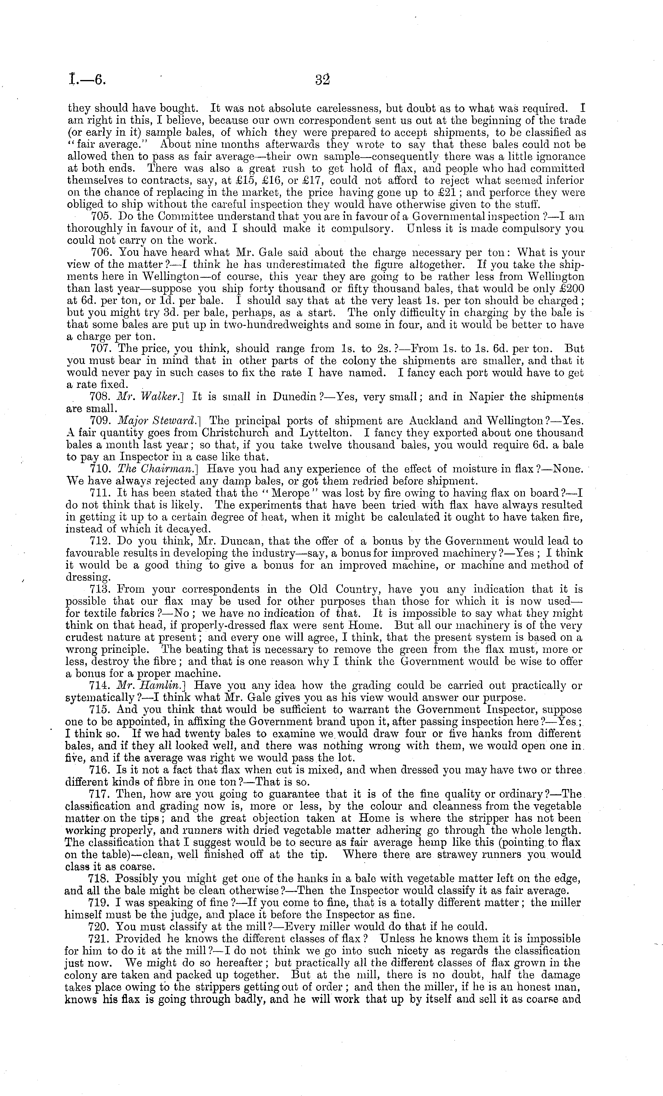 they should have bought. It was not absolute carelessness, but doubt as to what was required. I am right in this, I believe, because our own correspondent sent us out at the beginning of the trade (or early in it) sample bales, of which they were prepared to accept shipments, to be classified as " fair average." About nine months afterwards they wrote to say that these bales could not be allowed then to pass as fair average —their own sample—consequently there was a little ignorance at both ends. There was also a great rush to get hold of flax, and people who had committed themselves to contracts, say, at £15, £16, or £17, could not afford to reject what seemed inferior on the chance of replacing in the market, the price having gone up to £21; and perforce they were obliged to ship without the careful inspection they would have otherwise given to the stuff. 705. Do the Committee understand that you are in favour of a Governmental inspection ?—I am thoroughly in favour of it, and I should make it compulsory. Unless it is made compulsory you could not carry on the work. 706. You have heard what Mr. Gale said about the charge necessary per ton: What is your view of the matter ?—I think he has underestimated the figure altogether. If you take the shipments here in Wellington—of course, this year they are going to be rather less from Wellington than last year —suppose you ship forty thousand or fifty thousand bales, that would be only £200 at 6d. per ton, or Id. per bale. I should say that at the very least Is. per ton should be charged ; but you might try 3d. per bale, perhaps, as a start. The only difficulty in charging by the bale is that some bales are put up in two-hundredweights and some in four, and it would be better to have a charge per ton. 707. The price, you think, should range from Is. to 2s. ?—From Is. to Is. 6d. per ton. But you must bear in mind that in other parts of the colony the shipments are smaller, and that it would never pay in such cases to fix the rate I have named. I fancy each port would have to get a rate fixed. 708. Mr. Walker.] It is small in Dunedin ?—Yes, very small; and in Napier the shipments are small. 709. Major Steward.] The principal ports of shipment are Auckland and Wellington ? —Yes. A fair quantity goes from Christchurch and Lyttelton. I fancy they exported about one thousand bales a month last year; so that, if you take twelve thousand bales, you would require 6d. a bale to pay an Inspector in a case like that. 710. The Chairman.] Have you had any experience of the effect of moisture in flax ? —None. W T e have always rejected any damp bales, or got them redried before shipment. 711. It has been stated that the " Merope " was lost by fire owing to having flax on board?—l do not think that is likely. The experiments that have been tried with flax have always resulted in getting it up to a certain degree of heat, when it might be calculated it ought to have taken fire, instead of which it decayed. 712. Do you think, Mr. Duncan, that the offer of a bonus by the Government would lead to favourable results in developing the industry—say, a bonus for improved machinery?— Yes ; I think it would be a good thing to give a bonus for an improved machine, or machine and method of dressing. 713. From your correspondents in the Old Country, have you any indication that it is possible that our flax may be used for other purposes than those for which it is now used— for textile fabrics ? —No ; we have no indication of that. It is impossible to say what they might think on that head, if properly-dressed flax were sent Home. But all our machinery is of the very crudest nature at present; and every one will agree, I think, that the present system is based on a wrong principle. The beating that is necessary to remove the green from the flax must, more or less, destroy the fibre; and that is one reason why I think the Government would be wise to offer a bonus for a proper machine. 714. Mr. Hamlin.] Have you any idea how the grading could be carried out practically or sytematically ? —I think what Mr. Gale gives you as his view would answer our purpose. 715. And you think that would be sufficient to warrant the Government Inspector, suppose one to be appointed, in affixing the Government brand upon it, after passing inspection here?— Yes ; I think so. If we had twenty bales to examine we. would draw four or five hanks from different bales, and if they all looked well, and there was nothing wrong with them, we would open one in. five, and if the average was right we would pass the lot. 716. Is it not a fact that flax when cut is mixed, and when dressed you may have two or three different kinds of fibre in one ton? —That is so. 717. Then, how are you going to guarantee that it is of the fine quality or ordinary ?—The classification and grading now is, more or less, by the colour and cleanness from the vegetable matter on the tips; and the great objection taken at Home is where the stripper has not been working properly, and runners with dried vegetable matter adhering go through the whole length. The classification that I suggest would be to secure as fair average hemp like this (pointing to flax on the table) —Clean, well finished off at the tip. Where there are strawey runners you would class it as coarse. 718. Possibly you might get one of the hanks in a bale with vegetable matter left on the edge, and all the bale might be clean otherwise ? —-Then the Inspector would classify it as fair average. 719. I was speaking of fine ?—lf you come to fine, that is a totally different matter; the miller himself must be the judge, and place it before the Inspector as fine. 720. You must classify at the mill?— Every miller would do that if he could. 721. Provided he knows the different classes of flax ? Unless he knows them it is impossible for him to do it at the mill ?—I do not think we go into such nicety as regards the classif