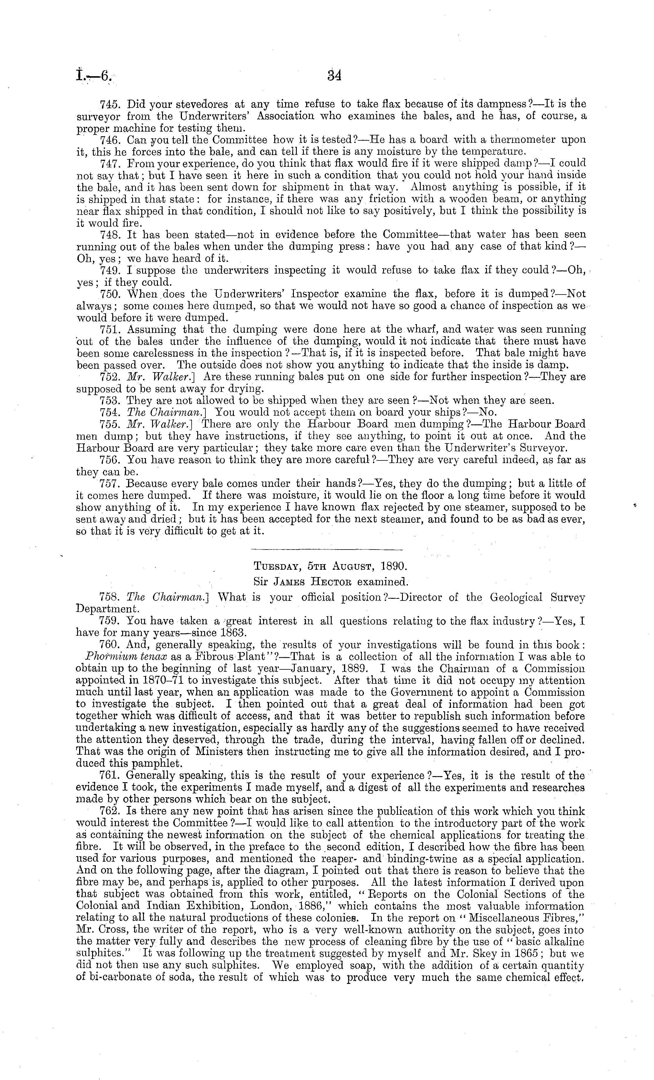 Tuesday, sth August, 1890. Sir James Heotoe examined. 758. The Chairman.] What is your official position?— Director of the Geological Survey Department. 759. You have taken a great interest in all questions relating to the flax industry ?—Yes, I have for many years —since 1863. 760. And, generally speaking, the results of your investigations will be found in this book: Phormium Una® as a Fibrous Plant"?— That is a collection of all the information I was able to obtain up to the beginning of last year—January, 1889. I was the Chairman of a Commission appointed in 1870-71 to investigate this subject. After that time it did not occupy my attention much until last year, when an application was made to the Government to appoint a Commission to investigate the subject. I then pointed out that a great deal of information had been got together which was difficult of access, and that it was better to republish such information before undertaking a, new investigation, especially as hardly any of the suggestions seemed to have received the attention they deserved, through the trade, during the interval, having fallen off or declined. That was the origin of Ministers then instructing me to give all the information desired, and I produced this pamphlet. 761. Generally speaking, this is the result of your experience ?—Yes, it is the result of the evidence I took, the experiments I made myself, and a digest of all the experiments and researches made by other persons which bear on the subject. 762. Is there any new point that has arisen since the publication of this work which you think would interest the Committee ?—I would like to call attention to the introductory part of the work as containing the newest information on the subject of the chemical applications for treating the fibre. It will be observed, in the preface to the second edition, I described how the fibre has been used for various purposes, and mentioned the reaper- and binding-twine as a special application. And on the following page, after the diagram, I pointed out that there is reason to believe that the fibre may be, and perhaps is, applied to other purposes. All the latest information I derived upon that subject was obtained from this work, entitled, " Beports on the Colonial Sections of the Colonial and Indian Exhibition, London, 1886," which contains the most valuable information relating to all the natural productions of these colonies. In the report on " Miscellaneous Fibres," Mr. Cross, the writer of the report, who is a very well-known authority on the subject, goes into the matter very fully and describes the new process of cleaning fibre by the use of " basic alkaline sulphites." It was following up the treatment suggested by myself and Mr. Skey in 1865 ; but we did not then use any such sulphites. We employed soap, with the addition of a certain quantity of bi-carbonate of soda, the result of which was to produce very much the same chemical effect.