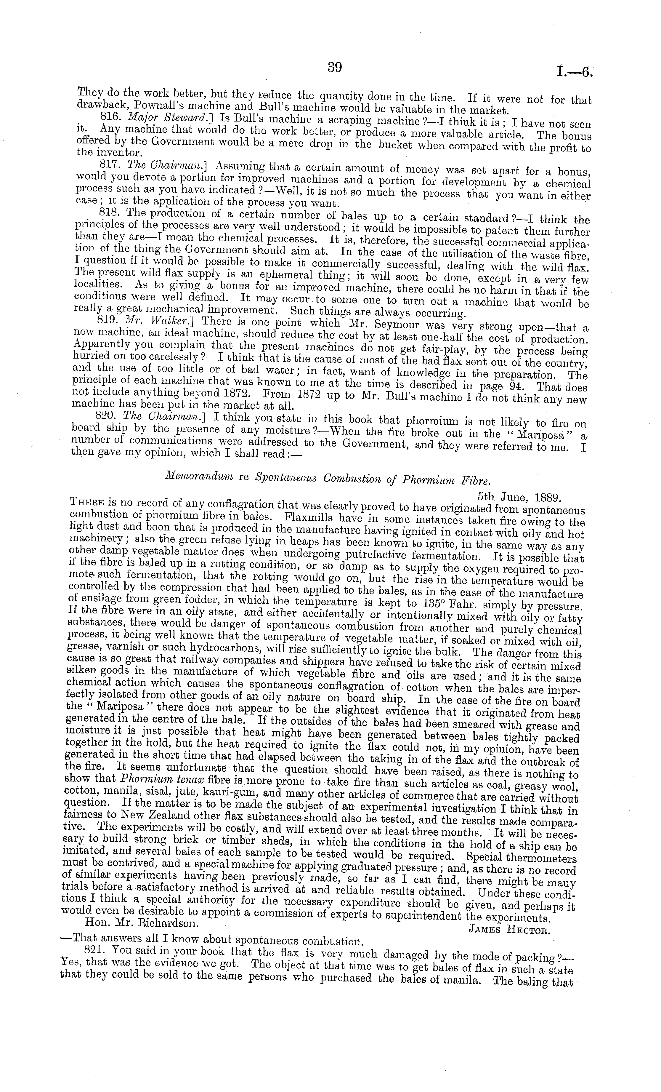 They do the work better but they reduce the quantity done in the time. If it were not for that drawback Pownall's machine and Bull's machine would be valuable in the market 81b. Major Steward.] Is Bull's machine a scraping machine ?—I think it is • I have not seen * *Z mach ' ne that would do the work better ' or Produce a more valuable article. The bonus thehrventor 6 QmmmeDt WOuld be a lnere dro P in the buck et when compared with the profit to wn , ,5 17 ' T i e C l Mirman -) Assuming that a certain amount of money was set apart for a bonus would you devote a portion for improved machines and a portion for development by a chemical process such as you have indicated ?-Well, it is not so much the process that you want in eTther case; it is the application of the process you want. • 81 ?" Production of a certain number of bales up to a certain standard ?—I think the principles of the processes are very well understood; it would be impossible to patent them further S S T, 6 - 1 th 6 Chen \ lCa u 1 P" 6B ' B i8 ' therefore ' the successful commercial application of the thing the Government should aim at. In the case of the utilisation of the waste fibre I question if it would be possible to make it commercially successful, dealing with the wild flax The present wild flax supply _is an ephemeral thing; it will soon be done, except in a very few localities. As to giving a bonus for an improved machine, there could be no harm in that if the conditions were well defined. It may occur to some one to turn out a machine that would be really a great mechanical improvement. Such things are always occurring 819 Mr. Walker] There is one point which Mr. Seymour was very strong upon-that a new machine, an idea machine, should reduce the cost by at least one-half the cost of production Apparently you complain that the present machines do not get fair-play, by the process behig hurried on too carelessly ?-I think that is the cause of most of the bad flax Lent out oFthe countiw and the use of too little or of bad water; in fact, want of knowledge in the preparation The prmcip eof each machine that was known to me at the time is described in page 94. That does not include anything beyond 1872. From 1872 up to Mr. Bull's machine Ido not think any new machine has been put in the market at all. y f\Thc Chairman.] I think you state in this book that phormium is not likely to fire on board ship by the presence ot any moisture ?-When the fire broke out in the " Mariposa" a number ot communications were addressed to the Government, and they were referred to me I then gave my opinion, which I shall read :— Memorandum re Spontaneous Combustion of Phormium Fibre. Theee is no record of any conflagration that was clearly proved to have GriginatSromroontaneous Zt h 2 T 1 E hon T? fibr ° f ba I 6 8" laxmmB have in some instances taken fire owing to Z light dust and boon that is produced m the manufacture having ignited in contact with oily and hot machinery; also the green refuse lying in heaps has been known to ignite, in the same way as any other damp vegetable matter does when undergoing putrefactive fermentation. It is possible"that if the fibre is baled up m a rotting condition, or so damp as to supply the oxygen required to pro n ontrolSl,T entatl ° n ' that w^ 8 W ° Uldgo ° n ' but the "Be In the temperatoe would be contio led by the compression that had been applied to the bales, as in the case of the manufacture 0 ensilage from green fodder, m which the temperature is kept to 135° Fahr. simply by pressure 1 the fibre were m an oily state, and either accidentally or intentionally mixed with fatty substances there would be danger of spontaneous combustion from another and purely chenS process, it being well known that the temperature of vegetable matter, if soaked or m xed with oil grease, varnish or such hydrocarbons, will rise sufficiently to ignite the bulk. The aSi this cause is so great that railway companies and shippers have refused to take the risk of cfrtanT mixed silken goods m the manufacture of which vegetable fibre and oils are used; and it is thesame chemicalactionwhich causes the spontaneous conflagration of cotton when he bales are imp^ ectly isolated from other goods of an oily nature on board ship. In the case of the fire on Ed the Mariposa there does not appear to be the slightest evidence that it originated from heat generated in the centre of the bale If the outsides of the bales had been smeared withWe and moisture it is jus possible that heat might have been generated between bales tiglitiy packed together m the hold, but the heat required to ignite the flax could not, in my opinio! ThJe been fhTZ T? shOr VT tba \ had l a P sed bet ™ the taking in of the flax and the outbreak Tot I unfortunate that the question should have been raised, as there is nothine to show that Phormium tenax fibre ismore prone to take fire than such articles as coal, greasy wool at^ &n ll% \l nte ' ka T" gUm ,' & 3 d many ° ther articles of commerce that are carried without question If the matter is to be made the sub ect of an experimental investigation I think that ha airness to New Zealand other flax substances should also be tested, and the results made Sara" tive. The experiments will be costly, and will extend over at least three months. It will oe necessary to build strong brick or timber sheds, in which the conditions in the hold of a ship can be imitated, and several bales of each sample to be tested would be required. Special tLimometers must be contrived, and a special machine for applying graduated pressure ; and, as there is no record of similar experiments having been previously made, so far as I can find, there might be many trials before a satisfactory method ,s arrived at and reliable results obtained. Under these c 3 tions I think a special authority for the necessary expenditure should be given, and perhaps t would evenbe desnableto appoint a commission of experts to superintend
