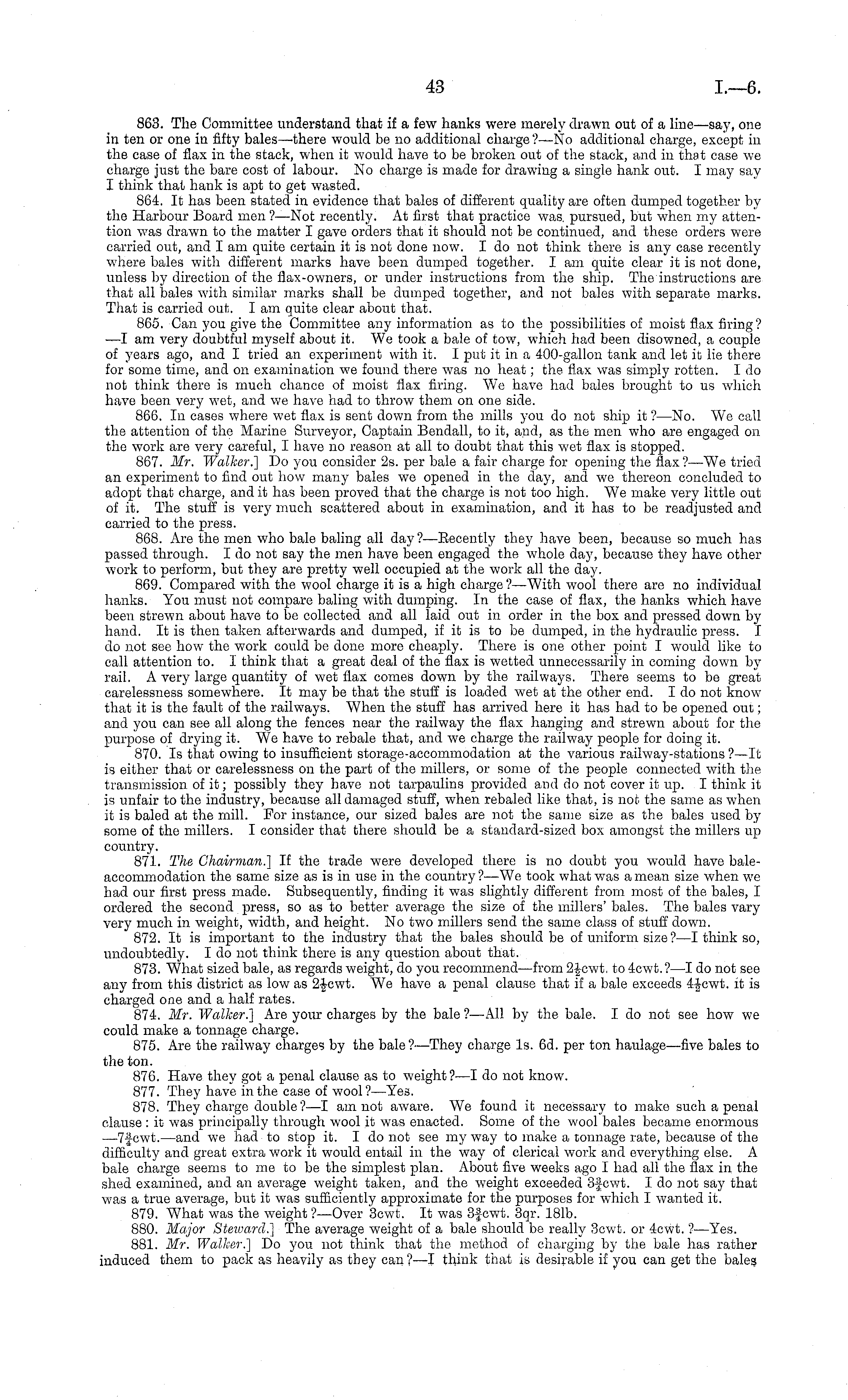 863. The Committee understand that if a few hanks were merely drawn out of a line—say, one in ten or one in fifty bales—there would be no additional charge?—No additional charge, except in the case of flax in the stack, when it would have to be broken out of the stack, and in that case we charge just the bare cost of labour. No charge is made for drawing a single hank out. I may say I think that hank is apt to get wasted. 864. It has been stated in evidence that bales of different quality are often dumped together by the Harbour Board men ? —Not recently. At first that practice was. pursued, but when my attention was drawn to the matter I gave orders that it should not be continued, and these orders were carried out, and lam quite certain it is not done now. I do not think there is any case recently where bales with different marks have been dumped together. I am quite clear it is not done, unless by direction of the flax-owners, or under instructions from the ship. The instructions are that all bales with similar marks shall be dumped together, and not bales with separate marks. That is carried out. lam quite clear about that. 865. Can you give the Committee any information as to the possibilities of moist flax firing ? —I am very doubtful myself about it. We took a bale of tow, which had been disowned, a couple of years ago, and I tried an experiment with it. I put it in a 400-gallon tank and let it lie there for some time, and on examination w r e found there was no heat; the flax was simply rotten. Ido not think there is much chance of moist flax firing. We have had bales brought to us which have been very wet, and we have had to throw them on one side. 866. In cases where wet flax is sent down from the mills you do not ship it ? —No. We call the attention of the Marine Surveyor, Captain Bendall, to it, and, as the men who are engaged on the work are very careful, I have no reason at all to doubt that this wet flax is stopped. 867. Mr. Walker.} Do you consider 2s. per bale a, fair charge for opening the flax ?—We tried an experiment to find out how many bales we opened in the day, and we thereon concluded to adopt that charge, and it has been proved that the charge is not too high. We make very little out of it. The stuff is very much scattered about in examination, and it has to be readjusted and carried to the press. 868. Are the men who bale baling all day?—Becently they have been, because so much has passed through. Ido not say the men have been engaged the whole day, because they have other work to perform, but they are pretty well occupied at the work all the day. 869. Compared with the wool charge it is a high charge ? —With wool there are no individual hanks. You must not compare baling with dumping. In the ease of flax, the hanks which have been strewn about have to be collected and all laid out in order in the box and pressed down by hand. It is then taken afterwards and dumped, if it is to be dumped, in the hydraulic press. I do not see how the work could be done more cheaply. There is one other point I would like to call attention to. I think that a great deal of the flax is wetted unnecessarily in coming down by rail. A very large quantity of wet flax comes down by the railways. There seems to be great carelessness somewhere. It may be that the stuff is loaded wet at the other end. Ido not know that it is the fault of the railways. When the stuff has arrived here it has had to be opened out; and you can see all along the fences near the railway the flax hanging and strewn about for the purpose of drying it. We have to rebale that, and we charge the railway people for doing it. 870. Is that owing to insufficient storage-accommodation at the various railway-stations ? —lt is either that or carelessness on the part of the millers, or some of the people connected with the transmission of it; possibly they have not tarpaulins provided and do not cover it up. I think it is unfair to the industry, because all damaged stuff, when rebaled like that, is not the same as when it is baled at the mill. For instance, our sized bales are not the same size as the bales used by some of the millers. I consider that there should be a standard-sized box amongst the millers up country. 871. The Chairman.] If the trade were developed there is no doubt you would have baleaccommodation the same size as is in use in the country ?—We took what was a mean size when we had our first press made. Subsequently, finding it was slightly different from most of the bales, I ordered the second press, so as to better average the size of the millers' bales. The bales vary very much in weight, width, and height. No two millers send the same class of stuff down. 872. It is important to the industry that the bales should be of uniform size ? —I think so, undoubtedly. Ido not think there is any question about that. 873. What sized bale, as regards weight, do you recommend—from I\ cwt, to 4cwt. ?—I do not see any from this district as low as 2-J-cwt. We have a penal clause that if a bale exceeds 4-|cwt. it is charged one and a half rates. 874. Mr. Walker.] Are your charges by the bale ?—All by the bale. I do not see how we could make a tonnage charge. 875. Are the railway charges by the bale ?—They charge Is. 6d. per ton haulage—five bales to the ton. 876. Have they got a penal clause as to weight?—l do not know. 877. They have in the case of wool? —Yes. 878. They charge double ?—I am not aware. We found it necessary to make such a penal clause :it was principally through wool it was enacted. Some of the wool bales became enormous —7fcwt. —and we had to stop it. I do not see my way to make a tonnage rate, because of the difficulty and great extra work it would entail in the way of clerical work and everything else. A bale charge seems to me to be the simplest plan. About five weeks ago I had all the flax in the shed examined, and an average weight taken, and the weight e