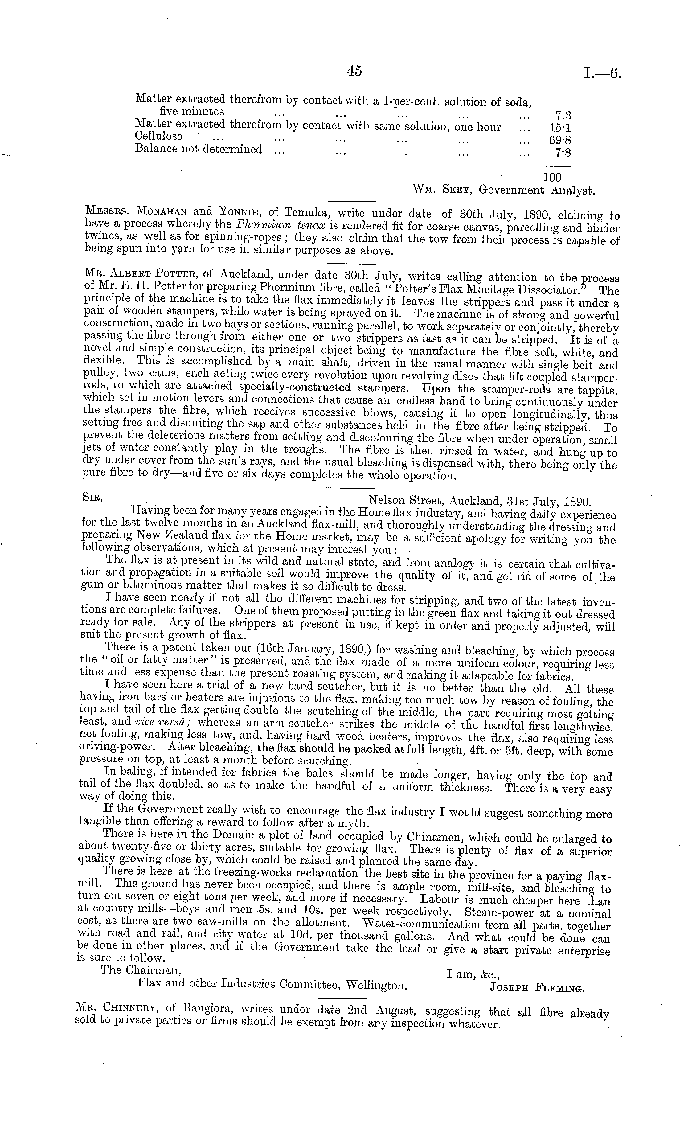 Matter extracted therefrom by contact with a 1-per-cent. solution of soda, five minutes ... ... ... . . 7 g Matter extracted therefrom by contact with same solution, one hour ... 15*1 Cellulose ... ... ... ... gq.o Balance not determined ... ... ... ... 7.3 100 Wm. Skey, Government Analyst.