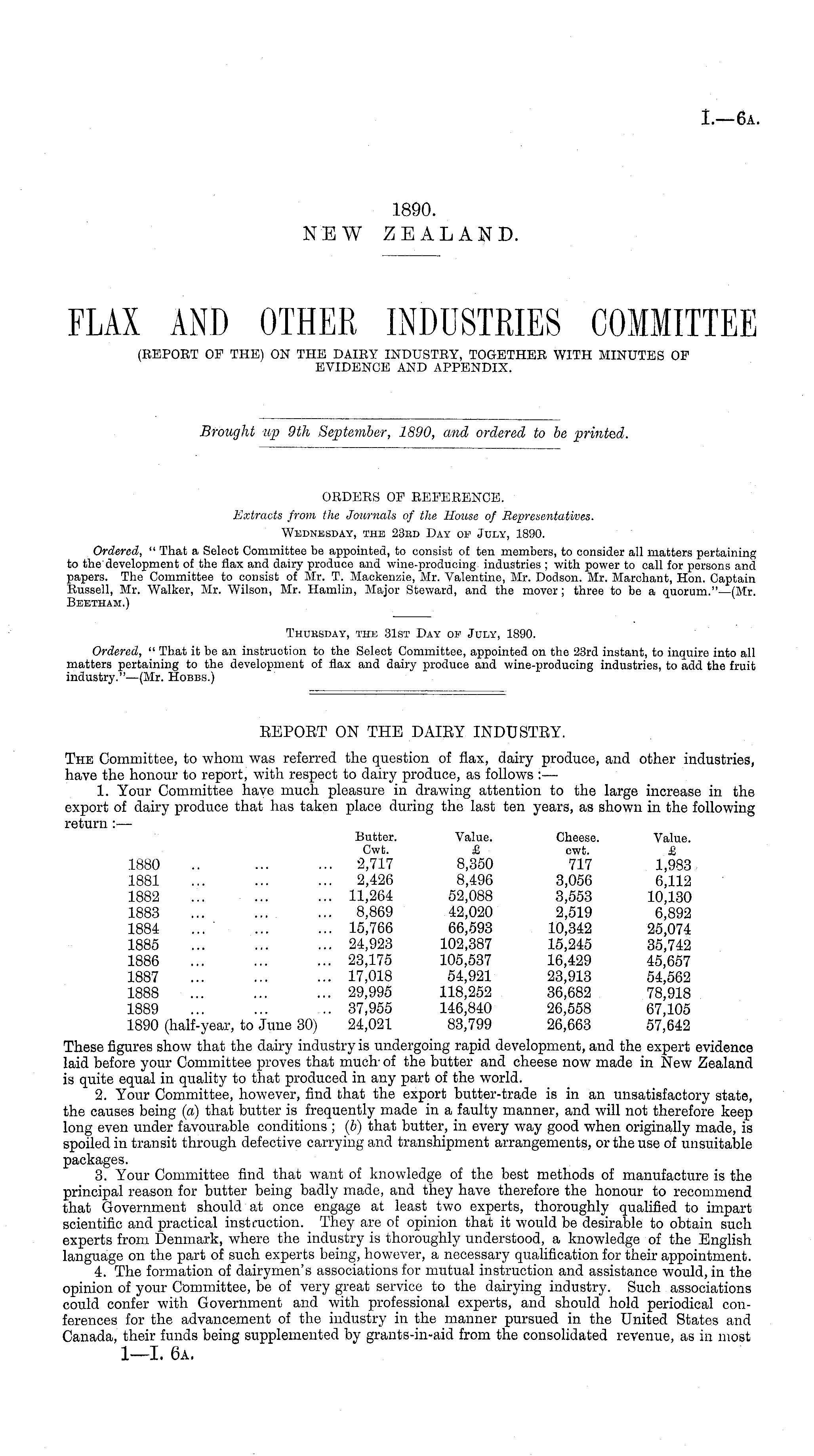ORDERS OP REFERENCE. Extracts from the Journals of the House of Representatives. Wednesday, the 23i.d Day of July, 1890. Ordered, " That a Select Committee be appointed, to consist of ten members, to consider all matters pertaining to the development of the flax and dairy produce and wine-producing industries ; with power to call for persons and papers. The Committee to consist of Mr. T. Mackenzie, Mr. Valentine, Mr. Dodson. Mr. Marchant, Hon. Captain Russell, Mr. Walker, Mr. Wilson, Mr. Hamlin, Major Steward, and the mover; three to be a quorum."—(Mr. Beetham.)
