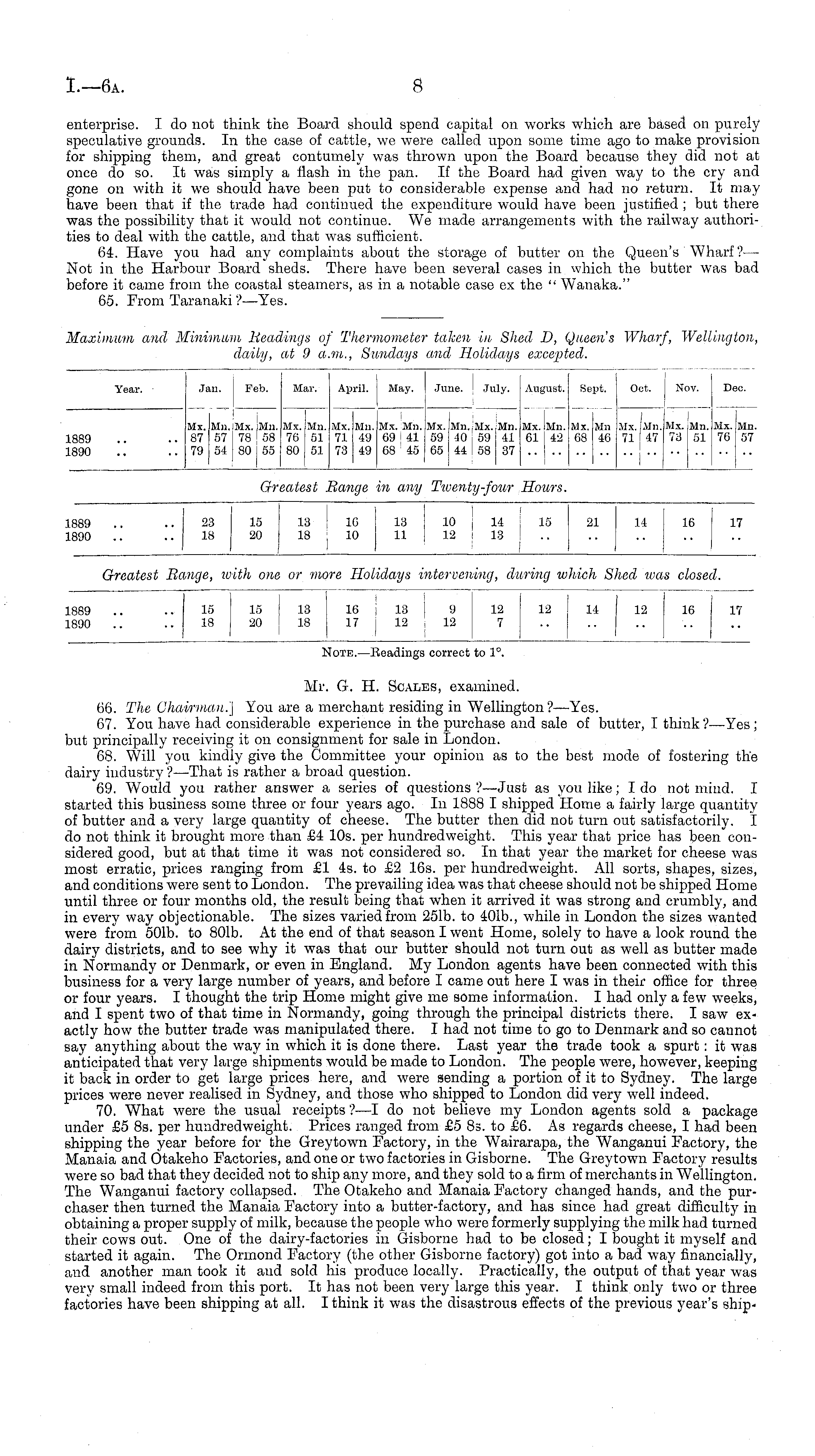 Note. —Headings correct to I°. Mr. G. H. Scales, examined. 66. The Chairman.] You are a merchant residing in Wellington ?—Yes. 67. You have had considerable experience in the purchase and sale of butter, I think?— Yes; but principally receiving it on consignment for sale in London. 68. Will you kindly give the Committee your opinion as to the best mode of fostering the dairy industry ? —That is rather a broad question. 69. Would you rather answer a series of questions ?—Just as you like; Ido not mind. I started this business some three or four years ago. In 1888 I shipped Home a fairly large quantity of butter and a very large quantity of cheese. The butter then did not turn out satisfactorily. I do not think it brought more than £4 10s. per hundredweight. This year that price has been considered good, but at that time it was not considered so. In that year the market for cheese was most erratic, prices ranging from £1 4s. to £2 16s. per hundredweight. All sorts, shapes, sizes, and conditions were sent to London. The prevailing idea was that cheese should not be shipped Home until three or four months old, the result being that when it arrived it was strong and crumbly, and in every way objectionable. The sizes varied from 251b. to 401b., while in London the sizes wanted were from 501b. to 801b. At the end of that season I went Home, solely to have a look round the dairy districts, and to see why it was that our butter should not turn out as well as butter made in Normandy or Denmark, or even in England. My London agents have been connected with this business for a very large number of years, and before I came out here I was in their office for three or four years. I thought the trip Home might give me some information. I had only a few weeks, and I spent two of that time in Normandy, going through the principal districts there. I saw exactly how the butter trade was manipulated there. I had not time to go to Denmark and so cannot say anything about the way in which it is done there. Last year the trade took a spurt: it was anticipated that very large shipments would be made to London. The people were, however, keeping it back in order to get large prices here, and were sending a portion of it to Sydney. The large prices were never realised in Sydney, and those who shipped to London did very well indeed. 70. What were the usual receipts ?—I do not believe my London agents sold a package under £5 Bs. per hundredweight. Prices ranged from £5 Bs. to £6. As regards cheese, I had been shipping the year before for the Greytown Factory, in the Wairarapa, the Wanganui Factory, the Manaia and Otakeho Factories, and one or two factories in Gisborne. The Greytown Factory results were so bad that they decided not to ship any more, and they sold to a firm of merchants in Wellington. The Wanganui factory collapsed. The Otakeho and Manaia Factory changed hands, and the purchaser then turned the Manaia Factory into a butter-factory, and has since had great difficulty in obtaining a proper supply of milk, because the people who were formerly supplying the milk had turned their cows out. One of the dairy-factories in Gisborne had to be closed; I bought it myself and started it again. The Ormond Factory (the other Gisborne factory) got into a bad way financially, and another man took it and sold his produce locally. Practically, the output of that year was very small indeed from this port. It has not been very large this year. I think only two or three factories have been shipping at all. I think it was the disastrous effects of the previous year's ship-