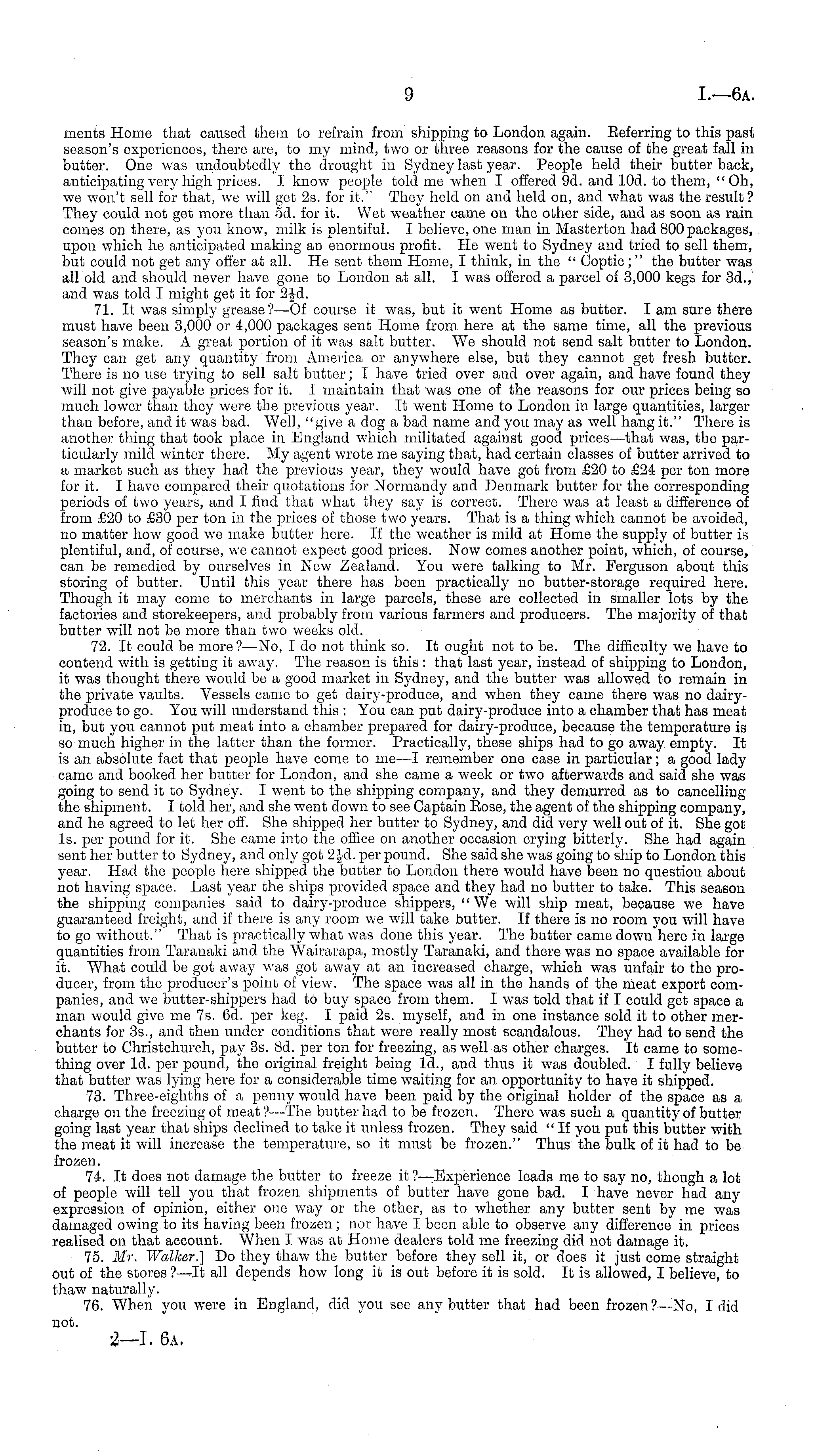 ments Home that caused them to refrain from shipping to London again. Eeferring to this past season's experiences, there are, to my mind, two or three reasons for the cause of the great fall in butter. One was undoubtedly the drought in Sydney last year. People held their butter back, anticipating very high prices. I know people told me when I offered 9d. and lOd. to them, "Oh, we won't sell for that, we will get 2s. for it." They held on and held on, and what was the result ? They could not get more than sd. for it. Wet weather came on the other side, and as soon as rain comes on there, as you know, milk is plentiful. I believe, one man in Masterton had 800 packages, upon which he anticipated making an enormous profit. He went to Sydney and tried to sell them, but could not get any offer at all. He sent them Home, I think, in the " Coptic;" the butter was alb old and should never have gone to London at all. I was offered a parcel of 3,000 kegs for 3d., and was told I might get it for 2fd. 71. It was simply grease?—Of course it was, but it went Home as butter. lam sure there must have been 3,000 or 4,000 packages sent Home from here at the same time, all the previous season's make. A great portion of it was salt butter. We should not send salt butter to London. They can get any quantity from America or anywhere else, but they cannot get fresh butter. There is no use trying to sell salt butter; I have tried over and over again, and have found they will not give payable prices for it. I maintain that was one of the reasons for our prices being so much lower than they were the previous year. It went Home to London in large quantities, larger than before, and it was bad. Well, "give a dog a bad name and you may as well hang it." There is another thing that took place in England which militated against good prices—that was, the particularly mild winter there. My agent wrote me saying that, had certain classes of butter arrived to a market such as they had the previous year, they would have got from £20 to £24 per ton more for it. I have compared their quotations for Normandy and Denmark butter for the corresponding periods of two years, and I find that what they say is correct. There was at least a difference of from £20 to £30 per ton in the prices of those two years. That is a thing which cannot be avoided, no matter how good we make butter here. If the weather is mild at Home the supply of butter is plentiful, and, of course, we cannot expect good prices. Now comes another point, which, of course, can be remedied by ourselves in New Zealand. You were talking to Mr. Ferguson about this storing of butter. Until this year there has been practically no butter-storage required here. Though it may come to merchants in large parcels, these are collected in smaller lots by the factories and storekeepers, and probably from various farmers and producers. The majority of that butter will not be more than two weeks old. 72. It could be more?—No, Ido not think so. It ought not to be. The difficulty we have to contend with is getting it away. The reason is this : that last year, instead of shipping to London, it was thought there would be a good market in Sydney, and the butter was allowed to remain in the private vaults. Vessels came to get dairy-produce, and when they came there was no dairyproduce to go. You will understand this : You can put dairy-produce into a chamber that has meat in, but you cannot put meat into a chamber prepared for dairy-produce, because the temperature is so much higher in the latter than the former. Practically, these ships had to go away empty. It is an absolute fact that people have come to me —I remember one case in particular; a good lady came and booked her butter for London, and she came a week or two afterwards and said, she was going to send it to Sydney. I went to the shipping company, and they demurred as to cancelling the shipment. I told her, and she went down to see Captain Eose, the agent of the shipping company, and he agreed to let her off. She shipped her butter to Sydney, and did very well out of it. She got Is. per pound for it. She came into the office on another occasion crying bitterly. She had again sent her butter to Sydney, and only got 2£d. per pound. She said she was going to ship to London this year. Had the people here shipped the butter to London there would have been no question about not having space. Last year the ships provided space and they had no butter to take. This season the shipping companies said to dairy-produce shippers, "We will ship meat, because we have guaranteed freight, and if there is any room we will take butter. If there is no room you will have to go without." That is practically what was done this year. The butter came down here in large quantities from Taranaki and the Wairarapa, mostly Taranaki, and there was no space available for it. What could be got away was got away at an increased charge, which was unfair to the producer, from the producer's point of view. The space was all in the hands of the meat export companies, and we butter-shippers had to buy space from them. I was told that if I could get space a man would give me 7s. 6d. per keg. I paid 2s. myself, and in one instance sold it to other merchants for 35., and then under conditions that were really most scandalous. They had to send the butter to Christchurch, pay 3s. Bd. per ton for freezing, as well as other charges. It came to something over Id. per pound, the original freight being Id., and thus it was doubled. I fully believe that butter was lying here for a considerable time waiting for an opportunity to have it shipped. 73. Three-eighths of a penny would have been paid by the original holder of the space as a charge on the freezing of meat ?—The butter had to be frozen. There was such a quantity of butter going last year that ships declined to take it unless frozen. They said "If you put this butter with the meat it will increase the t