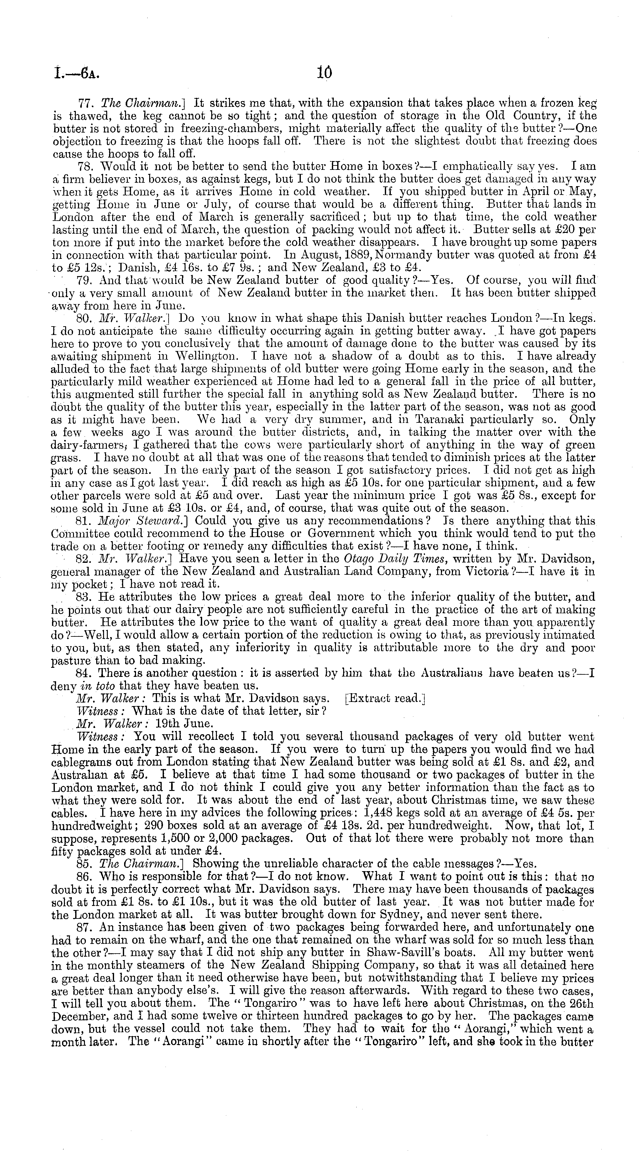 77. The Chairman.] It strikes me that, with the expansion that takes place when a frozen keg is thawed, the keg cannot be so tight; and the question of storage in the Old Country, if the butter is not stored in freezing-chambers, might materially affect the quality of the butter ?—One objection to freezing is that the hoops fall off. There is not the slightest doubt that freezing does cause the hoops to fall off. 78. Would it not be better to send the butter Home in boxes?—l emphatically say yes. lam a firm believer in boxes, as against kegs, but I do not think the butter does get damaged in any way when it gets Home, as it arrives Home in cold weather. If you shipped butter in April or May, getting Home in June or July, of course that would be a different thing. Butter that lands in London after the end of March is generally sacrificed; but up to that time, the cold weather lasting until the end of March, the question of packing would not affect it. Butter sells at £20 per ton more if put into the market before the cold weather disappears. I have brought up some papers in connection with that particular point. In August, 1889, Normandy butter was quoted at from £4 to £5 125.; Danish, £4 16s. to £7 9s. ; and New Zealand, £3 to £4. 79. And that would be New Zealand butter of good quality ? —Yes. Of course, you will find only a very small amount of New Zealand butter in the market then. It has been butter shipped away from here in June. 80. Mr. Walker.] Do you know in what shape this Danish butter reaches Loudon ?—ln kegs. Ido not anticipate the same difficulty occurring again in getting butter away. I have got papers here to prove to you conclusively that the amount of damage done to the butter was caused by its awaiting shipment in Wellington. I have not a shadow of a doubt as to this. I have already alluded to the fact that large shipments of old butter were going Home early in the season, and the particularly mild weather experienced at Home had led to a general fall in the price of all butter, this augmented still further the special fall in anything sold as New Zealand butter. There is no doubt the quality of the butter this year, especially in the latter part of the season, was not as good as it might have been. We had a very dry summer, and in Taranaki particularly so. Only a few weeks ago I was around the butter districts, and, in talking the matter over with the dairy-farmers; I gathered that the cows were particularly short of anything in the way of green grass. I have no doubt at all that was one of the reasons that tended to diminish prices at the latter part of the season. In the early part of the season I got satisfactory prices. I did not get as high in any case as I got last year. I did reach as high as £5 10s. for one particular shipment, and a few other parcels were sold at £5 and over. Last year the minimum price I got was £5 Bs., except for some sold in June at £3 10s. or £4, and, of course, that was quite out of the season. 81. Major Steward.] Could you give us any recommendations ? Is there anything that this Committee could recommend to the House or Government which you think would tend to put the trade on a better footing or remedy any difficulties that exist ?—I have none, I think. 82. Mr. Walker.'] Have you seen a letter in the Otago Daily Times, written by Mr. Davidson, general manager of the New Zealand and Australian Land Company, from Victoria ?■ —I have it in my pocket; 1 have not read it. 83. He attributes the low prices a great deal more to the inferior quality of the butter, and he points out that our dairy people are not sufficiently careful in the practice of the art of making butter. He attributes the low price to the want of quality a great deal more than you apparently do?— Well, I would allow a certain portion of the reduction is owing to that, as previously intimated to you, but, as then stated, any inferiority in quality is attributable more to the dry and poor pasture than to bad making. 84. There is another question : it is asserted by him that the Australians have beaten us?—l deny in toto that they have beaten us. Mr. Walker: This is what Mr. Davidson says. [Extract read.] Witness : What is the date of that letter, sir ? Mr. Walker: 19th June. Witness: You will recollect I told you several thousand packages of very old butter went Home in the early part of the season. If you were to turn up the papers you would find we had cablegrams out from London stating that New Zealand butter was being sold at £1 Bs. and £2, and Australian at £5. I believe at that time I had some thousand or two packages of butter in the London market, and I do not think I could give you any better information than the fact as to what they were sold for. It Was about the end of last year, about Christinas time, we saw these cables. I have here in my advices the following prices : 1,448 kegs sold at an average of £4 ss. per hundredweight; 290 boxes sold at an average of £4 13s. 2d. per hundredweight. Now, that lot, I suppose, represents 1,500 or 2,000 packages. Out of that lot there w 7 ere probably not more than fifty packages sold at under £4. 85. The Chairman.] Showing the unreliable character of the cable messages ?—Yes. 86. Who is responsible for that ?—I do not know. What I want to point out is this : that no doubt it is perfectly correct what Mr. Davidson says. There may have been thousands of packages sold at from £1 Bs. to £1 10s., but it was the old butter of last year. It was not butter made for the London market at all. It was butter brought down for Sydney, and never sent there. 87. An instance has been given of two packages being forwarded here, and unfortunately one had to remain on the wharf, and the one that remained on the wharf was sold for so much less than the other?—l may say that I did not ship any butter in Shaw-Savill's boats. All my butter went in the monthly steamers of the New Zealand Shipping Company,