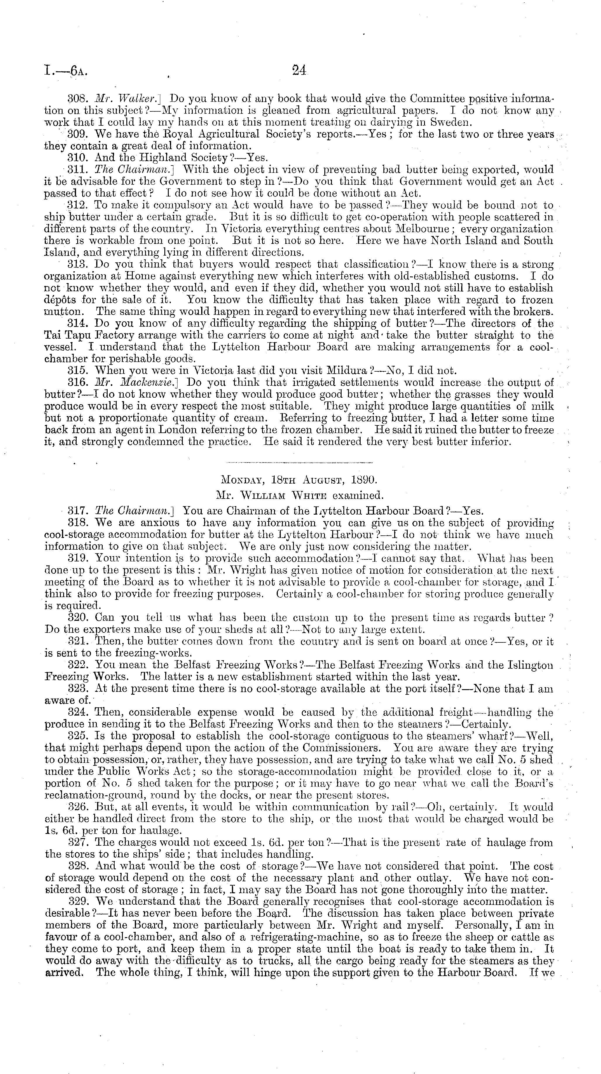 Monday, 18th August, 1890. Mr. William W t hite examined. 317. Tike Chairman.] You are Chairman of the Lyttelton Harbour Board ? —Yes. 318. We are anxious to have any information you can. give us on the subject of providing cool-storage accommodation for butter at the Lyttelton Harbour ?—I do not think we have much information to give on that subject. We are only just now considering the matter. 319. Your intention is to provide such accommodation?—l cannot say that. What has been done up to the present is this : Mr. Wright has given notice of motion for consideration at the next meeting of the Board as to whether it is not advisable to provide a cool-chamber for storage, and I think also to provide for freezing purposes. Certainly a cool-chamber for storing produce generally is required. 320. Can you tell us what has been the custom up to the present time as regards butter '? Do the exporters make use of y 7 our sheds at all? -Not to any large extent. 321. Then, the butter comes down from the country and is sent on board at once?— Yes, or it is sent to the freezing-w 7 orks. 322. You mean the Belfast Freezing Works?— The Belfast Freezing Works and the Islington Freezing Works. The latter is a new establishment started within the last year. 323. At the present time there is no cool-storage available at the port itself?— None that I am aware of. 324. Then, considerable expense would be caused by the additional freight—handling the produce in sending it to the Belfast Freezing W T orks and then to the steamers ? —Certainly. 325. Is the proposal to establish the cool-storage contiguous to the steamers'wharf ? —Well, that might perhaps depend upon the action of the Commissioners. You are aware they are trying to obtain possession, or, rather, they have possession, and are tryang to take what we call No. 5 shed under the Public Works Act; so the storage-accommodation might be provided close to it, or a portion of No. 5 shed taken for the purpose; or it ma) 7 have to go near what we call the Board's reclamation-ground, round by the docks, or near the present stores. 326. But, at all events, it would be within communication by rail? Oh, certainly. It would either be handled direct from the store to the ship, or the most that would be charged would be Is, 6d. per ton for haulage. 327. The charges would not exceed Is. 6d. per ton? —That is the present rate of haulage from the stores to the ships' side; that includes handling. 328. And what would be the cost of storage?—W T e have not considered that point. The cost of storage would depend on the cost of the necessary plant and, other outlay. We have not considered the cost of storage ; in fact, I may say the Board has not gone thoroughly into the matter. 329. We understand that the Board generally recognises that cool-storage accommodation is desirable ?—lt has never been before the Board. The discussion has taken place between private members of the Board, more particularly between Mr. Wright and myself. Personally, lam in favour of a cool-chamber, and also of a refrigerating-machine, so as to freeze the sheep or cattle as they come to port, and keep them in a proper state until the boat is ready to take them in. It would do away with the difficulty as to trucks, all the cargo being ready for the steamers as they arrived. The whole thing, I think, will hinge upon the support given to the Harbour Board. If we