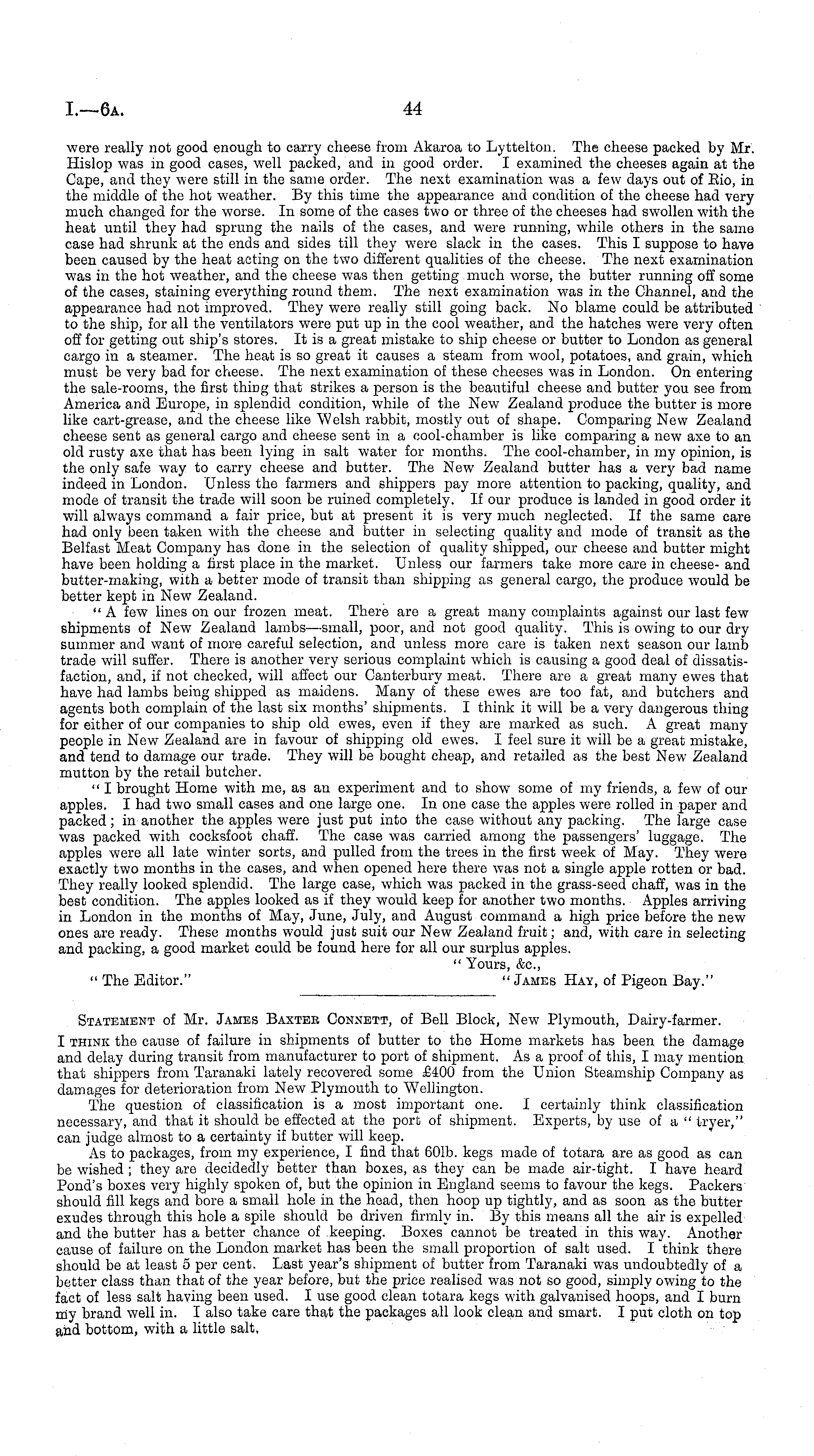 were really not good enough to carry cheese from Akaroa to Lyttelton. The cheese packed by Mr. Hislop w 7 as in good cases, well packed, and in good order. I examined the cheeses again at the Cape, and they were still in the same order. The next examination was a few days out of Eio, in the middle of the hot weather. By this time the appearance and condition of the cheese had very much changed for the worse. In some of the cases two or three of the cheeses had sw 7 ollen with the heat until they had sprung the nails of the cases, and were running, while others in the same case had shrunk at the ends and sides till they were slack in the cases. This I suppose to have been caused by the heat acting on the two different qualities of the cheese. The next examination was in the hot weather, and the cheese was then getting much worse, the butter running off some of the cases, staining everything round them. The next examination was in the Channel, and the appearance had not improved. They were really still going back. No blame could be attributed to the ship, for all the ventilators were put up in the cool weather, and the hatches were very often off for getting out ship's stores. It is a great mistake to ship cheese or butter to London as general cargo in a steamer. The heat is so great it causes a steam from wool, potatoes, and grain, which must be very bad for cheese. The next examination of these cheeses was in London. On entering the sale-rooms, the first thing that strikes a person is the beautiful cheese and butter you see from America and Europe, in splendid condition, while of the New Zealand produce the butter is more like cart-grease, and the cheese like Welsh rabbit, mostly out of shape. Comparing New Zealand cheese sent as general cargo and cheese sent in a cool-chamber is like comparing a new axe to an old rusty axe that has been lying in salt water for months. The cool-chamber, in my opinion, is the only safe way to carry cheese and butter. The New Zealand butter has a very bad name indeed in London. Unless the farmers and shippers pay more attention to packing, quality, and mode of transit the trade will soon be ruined completely. If our produce is landed in good order it will always command a fair price, but at present it is very much neglected. If the same care had only been taken with the cheese and butter in selecting quality and mode of transit as the Belfast Meat Company has done in the selection of quality shipped, our cheese and butter might have been holding a first place in the market. Unless our farmers take more care in cheese- and butter-making, with a better mode of transit than shipping as general cargo, the produce would be better kept in New Zealand. " A few lines on our frozen meat. There are a great many complaints against our last few shipments of New Zealand lambs—small, poor, and not good quality. This is owing to our dry summer and want of more careful selection, and unless more care is taken next season our lamb trade will suffer. There is another very serious complaint which is causing a good deal of dissatisfaction, and, if not checked, will affect our Canterbury meat. There are a great many ewes that have had lambs being shipped as maidens. Many of these ew 7 es are too fat, and butchers and agents both complain of the last six months' shipments. I think it will be a very dangerous thing for either of our companies to ship old ewes, even if they are marked as such. A great many people in New Zealand are in favour of shipping old ewes. I feel sure it will be a great mistake, and tend to damage our trade. They will be bought cheap, and retailed as the best New Zealand mutton by the retail butcher. " I brought Home with me, as an experiment and to show some of my friends, a few of our apples. I had two small cases and one large one. In one case the apples were rolled in paper and packed; in another the apples were just put into the case without any packing. The large case was packed with cocksfoot chaff. The case was carried among the passengers' luggage. The apples were all late winter sorts, and pulled from the trees in the first week of May. They were exactly two months in the cases, and when opened here there w 7 as not a single apple rotten or bad. They really looked splendid. The large case, which was packed in the grass-seed chaff, was in the best condition. The apples looked as if they would keep for another two months. Apples arriving in London in the months of May, June, July, and August command a high price before the new ones are ready. These months would just suit our New Zealand fruit; and, with care in selecting and packing, a good market could be found here for all our surplus apples. " Yours, &c, " The Editor." " James Hay, of Pigeon Bay."