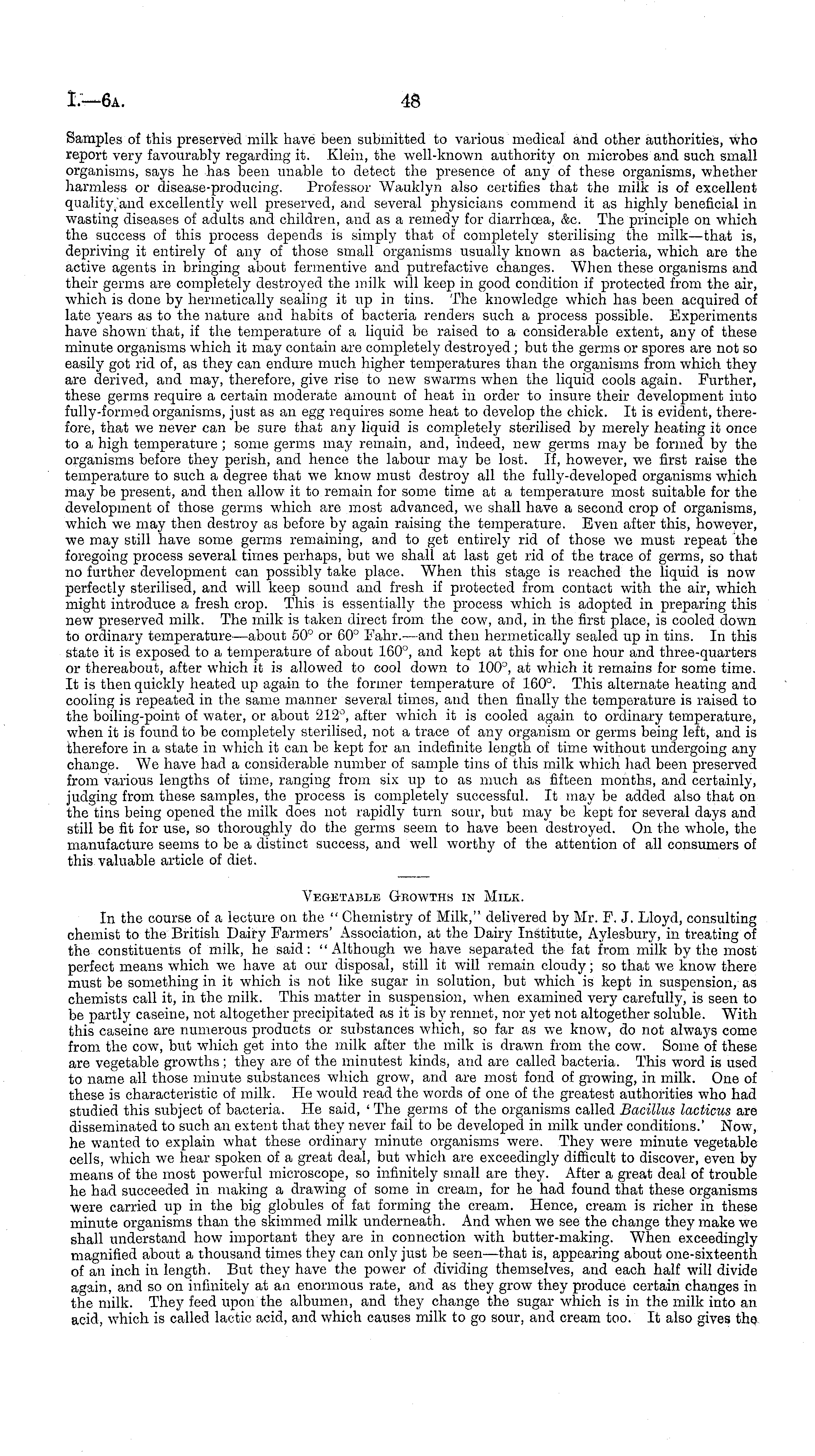 Vegetable Geowths in Milk. In the course of a lecture on the " Chemistry of Milk," delivered by Mr. F. J. Lloyd, consulting chemist to the British Dairy Farmers' Association, at the Dairy Institute, Aylesbury, in treating of the constituents of milk, he said: "Although we have separated the fat from milk by the most perfect means which we have at our disposal, still it will remain cloudy; so that we know there must be something in it which is not like sugar in solution, but which is kept in suspension, as chemists call it, in the milk. This matter in suspension, when examined very carefully, is seen to be partly caseine, not altogether precipitated as it is by rennet, nor yet not altogether soluble. With this caseine are numerous products or substances which, so far as we know, do not always come from the cow 7 , but which get into the milk after the milk is drawn from the cow. Some of these are vegetable growths; they are of the minutest kinds, and are called bacteria. This word is used to name all those minute substances which grow, and are most fond of growing, in milk. One of these is characteristic of milk. He would read the words of one of the greatest authorities who had studied this subject of bacteria. He said, ' The germs of the organisms called Bacillus lacticus are disseminated to such an extent that they never fail to be developed in milk under conditions.' Now, he w 7 anted to explain what these ordinary minute organisms were. They were minute vegetable cells, which we hear spoken of a great deal, but w 7 hich are exceedingly difficult to discover, even by means of the most powerful microscope, so infinitely small are they. After a great deal of trouble he had succeeded in making a drawing of some in cream, for he had found that these organisms were carried up in the big globules of fat forming the cream. Hence, cream is richer in these minute organisms than the skimmed milk underneath. And when we see the change they make we shall understand how important they are in connection with butter-making. When exceedingly magnified about a thousand times they can only just be seen—that is, appearing about one-sixteenth of an inch in length. But they have the power of dividing themselves, and each half will divide again, and so on infinitely at an enormous rate, and as they grow they produce certain changes in the milk. They feed upon the albumen, and they change the sugar which is in the milk into an acid, which is called lactic acid, and which causes milk to go sour, and cream too. It also gives the