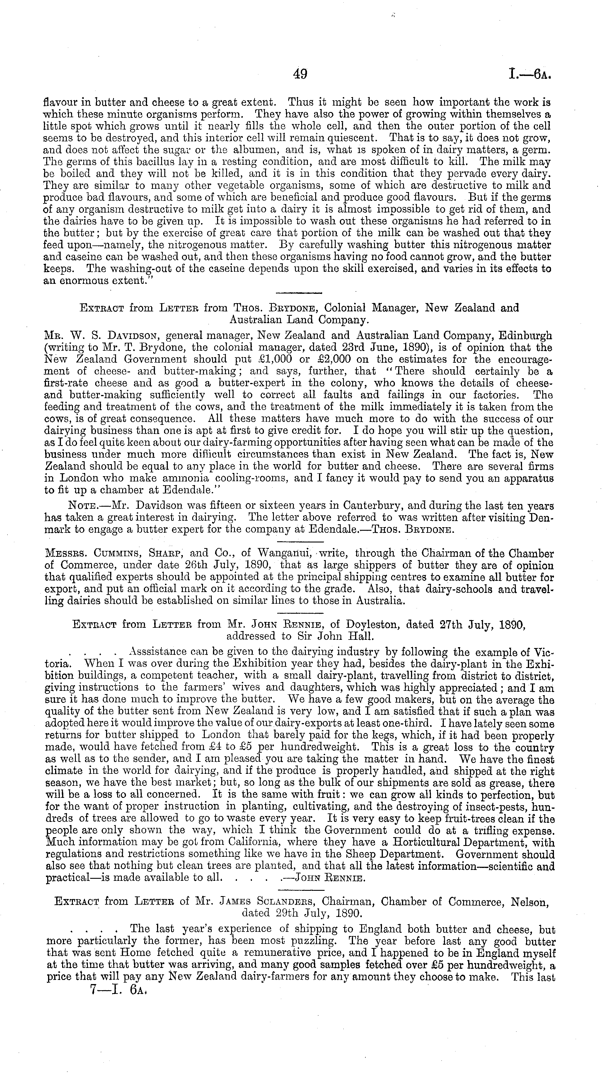 Extbact from Lettee from Thos. Beydone, Colonial Manager, New Zealand and Australian Land Company. Me. W. S. Davidson, general manager, New Zealand and Australian Land Company, Edinburgh (writing to Mr. T. Brydone, the colonial manager, dated 23rd June, 1890), is of opinion that the New Zealand Government should put £1,000 or £2,000 on the estimates for the encouragement of cheese- and butter-making; and says, further, that "There should certainly be a first-rate cheese and as good a butter-expert in the colony, who knows the details of cheeseand butter-making sufficiently well to correct all faults and failings in our factories. The feeding and treatment of the cows, and the treatment of the milk immediately it is taken from the cows, is of great consequence. All these matters have much more to do with the success of our dairying business than one is apt at first to give credit for. Ido hope you will stir up the question, as I do feel quite keen about our dairy-farming opportunities after having seen what can be made of the business under much more difficult circumstances than exist in New Zealand. The fact is, New Zealand should be equal to any place in the world for butter and cheese. There are several firms in London who make ammonia cooling-rooms, and I fancy it would pay to send you an apparatus to fit up a chamber at Edendale." Note.—Mr. Davidson was fifteen or sixteen years in Canterbury, and during the last ten years has taken a great interest in dairying. The letter above referred to was written after visiting Denmark to engage a butter expert for the company at Edendale.—Thos. Beydone.