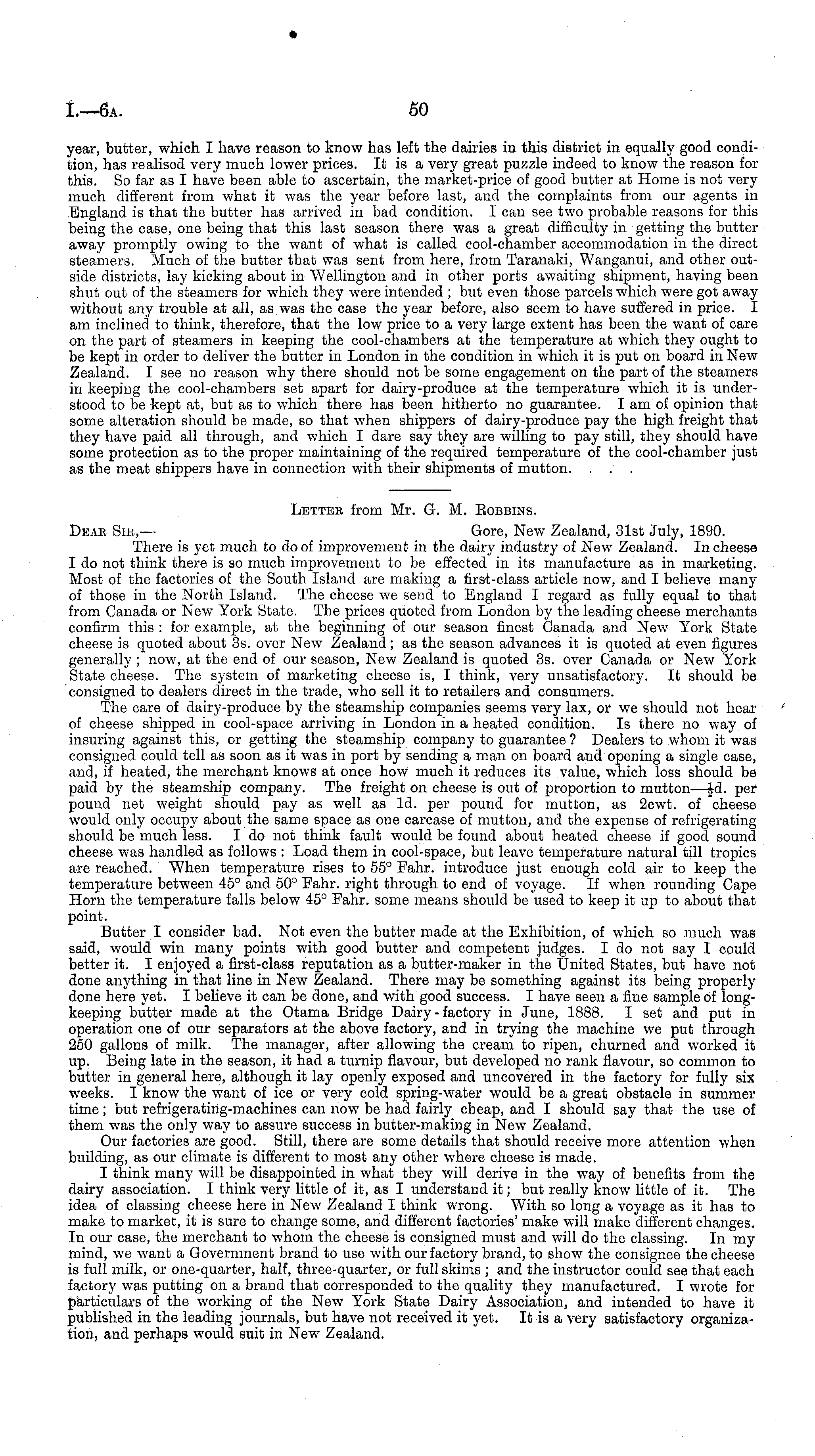 Lettee from Mr. G. M. Bobbins. Deae Sib, — Gore, New Zealand, 31st July, 1890. There is yet much to do of improvement in the dairy industry of New Zealand. In cheese I do not think there is so much improvement to be effected in its manufacture as in marketing. Most of the factories of the South Island are making a first-class article now, and I believe many of those in the North Island. The cheese we send to England I regard as fully equal to that from Canada or New York State. The prices quoted from London by the leading cheese merchants confirm this : for example, at the beginning of our season finest Canada and New York State cheese is quoted about 3s. over New Zealand; as the season advances it is quoted at even figures generally; now, at the end of our season, New Zealand is quoted 3s. over Canada or New York State cheese. The system of marketing cheese is, I think, very unsatisfactory. It should be consigned to dealers direct in the trade, who sell it to retailers and consumers. The care of dairy-produce by the steamship companies seems very lax, or we should not hear of cheese shipped in cool-space arriving in London in a heated condition. Is there no way of insuring against this, or getting the steamship company to guarantee ? Dealers to whom it was consigned could tell as soon as it was in port by sending a man on board and opening a single case, and, if heated, the merchant knows at once how much it reduces its value, which loss should be paid by the steamship company. The freight on cheese is out of proportion to mutton—|d. per pound net weight should pay as well as Id. per pound for mutton, as 2cwt. of cheese w 7 ould only occupy about the same space as one carcase of mutton, and the expense of refrigerating should be much less. Ido not think fault would be found about heated cheese if good sound cheese was handled as follows : Load them in cool-space, but leave temperature natural till tropics are reached. When temperature rises to 55° Fahr. introduce just enough cold air to keep the temperature between 45° and 50° Fahr. right through to end of voyage. If when rounding Cape Horn the temperature falls below 45° Fahr. some means should be used to keep it up to about that point. Butter I consider bad. Not even the butter made at the Exhibition, of which so much was said, would win many points with good butter and competent judges. I do not say I could better it. I enjoyed a first-class reputation as a butter-maker in the United States, but have not done anything in that line in New Zealand. There may be something against its being properly done here yet. I believe it can be done, and with good success. I have seen a fine sample of longkeeping butter made at the Otama Bridge Dairy - factory in June, 1888. I set and put in operation one of our separators at the above factory, and in trying the machine w 7 e put through 250 gallons of milk. The manager, after allowing the cream to ripen, churned and worked it up. Being late in the season, it had a turnip flavour, but developed no rank flavour, so common to butter in general here, although it lay openly exposed and uncovered in the factory for fully six weeks. I know the want of ice or very cold spring-water would be a great obstacle in summer time; but refrigerating-machines can now be had fairly cheap, and I should say that the use of them was the only way to assure success in butter-making in New Zealand. Our factories are good. Still, there are some details that should receive more attention when building, as our climate is different to most any other where cheese is made. I think many will be disappointed in what they will derive in the way of benefits from the dairy association. I think very little of it, as I understand it; but really know little of it. The idea of classing cheese here in New Zealand I think wrong. With so long a voyage as it has to make to market, it is sure to change some, and different factories' make will make different changes. In our case, the merchant to whom the cheese is consigned must and will do the classing. In my mind, we want a Government brand to use with our factory brand, to show the consignee the cheese is full milk, or one-quarter, half, three-quarter, or full skims ; and the instructor could see that each factory was putting on a brand that corresponded to the quality they manufactured. I wrote for particulars of the working of the New York State Dairy Association, and intended to have it published in the leading journals, but have not received it yet. It is a very satisfactory organization, and perhaps would suit in New 7 Zealand.