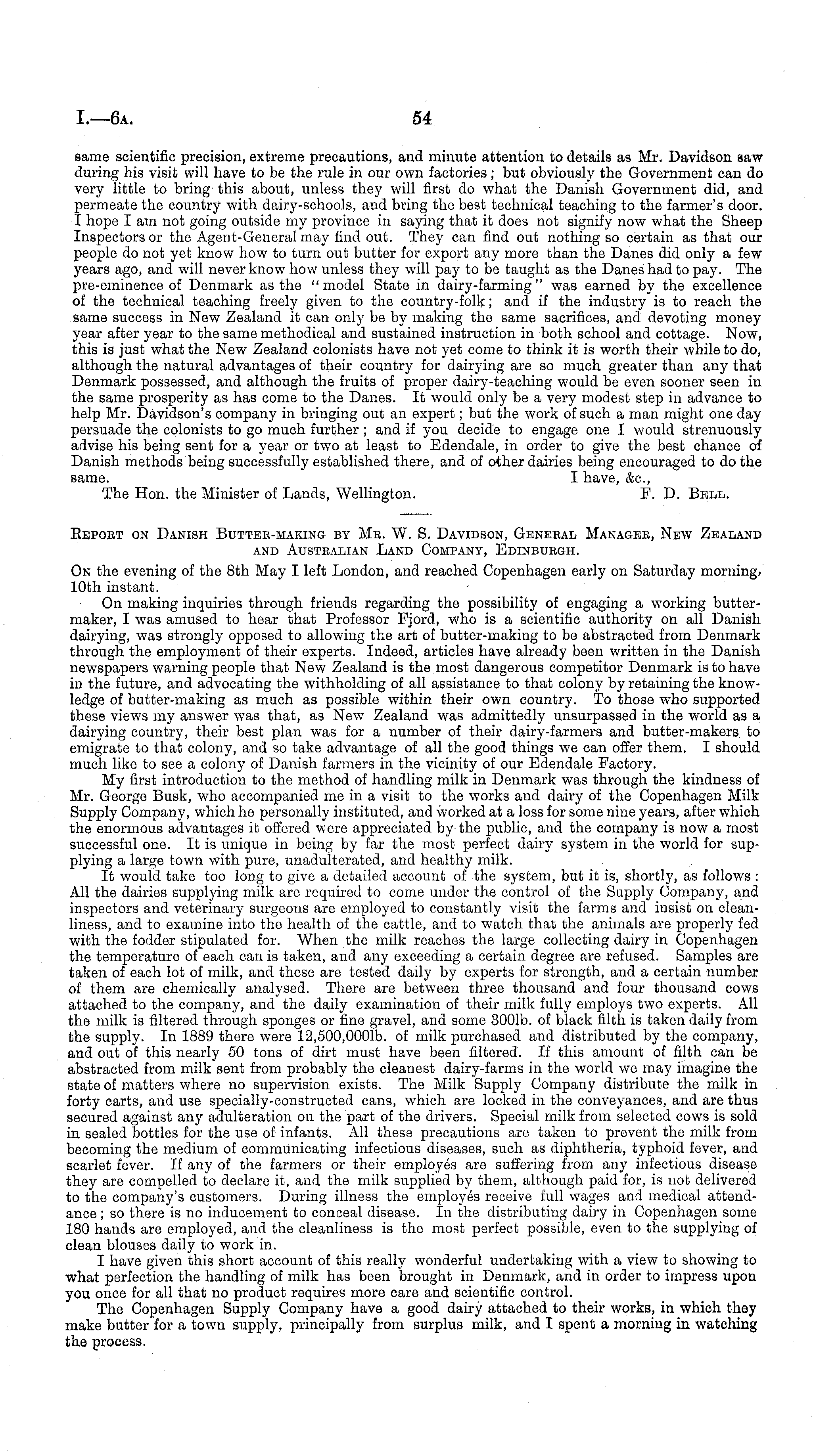 same scientific precision, extreme precautions, and minute attention to details as Mr. Davidson saw during his visit will have to be the rule in our own factories; but obviously the Government can do very little to bring this about, unless they will first do what the Danish Government did, and permeate the country with dairy-schools, and bring the best technical teaching to the farmer's door. I hope I am not going outside my province in saying that it does not signify now what the Sheep Inspectors or the Agent-General may find out. They can find out nothing so certain as that our people do not yet know how to turn out butter for export any more than the Danes did only a few years ago, and will never know how unless they will pay to be taught as the Danes had to pay. The pre-eminence of Denmark as the "model State in dairy-farming" was earned by the excellence of the technical teaching freely given to the country-folk; and if the industry is to reach the same success in New Zealand it can only be by making the same sacrifices, and devoting money year after year to the same methodical and sustained instruction in both school and cottage. Now, this is just what the New Zealand colonists have not yet come to think it is worth their while to do, although the natural advantages of their country for dairying are so much greater than any that Denmark possessed, and although the fruits of proper dairy-teaching would be even sooner seen in the same prosperity as has come to the Danes. It would only be a very modest step in advance to help Mr. Davidson's company in bringing out an expert; but the work of such a man might one day persuade the colonists to go much further; and if you decide to engage one I would strenuously advise his being sent for a year or two at least to Edendale, in order to give the best chance of Danish methods being successfully established there, and of other dairies being encouraged to do the same. I have, &c, The Hon. the Minister of Lands, Wellington. F. D. Bell.