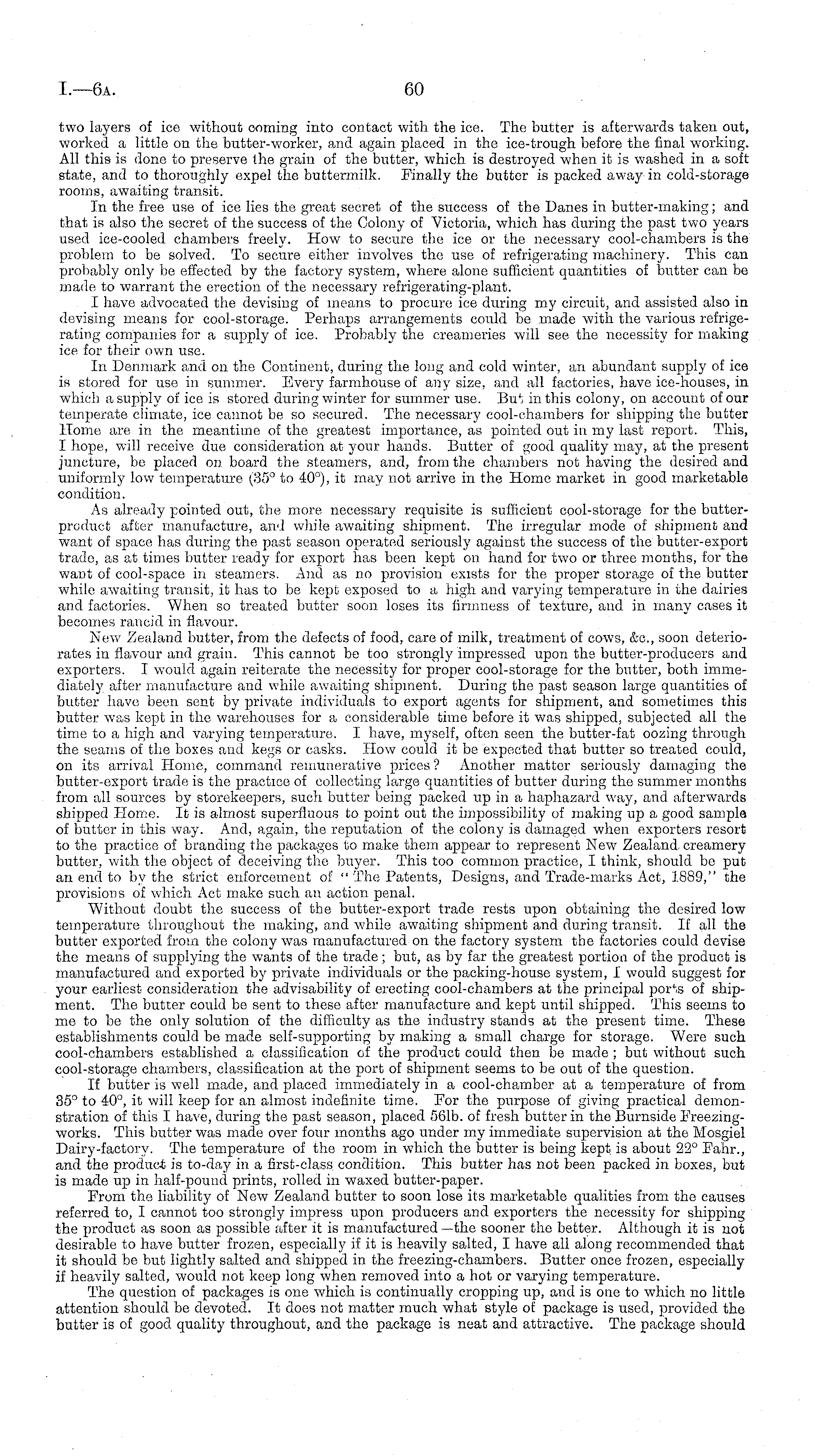 two layers of ice without coming into contact with the ice. The butter is afterwards taken out, worked a little on the butter-worker, and again placed in the ice-trough before the final w 7 orking. All this is done to preserve the grain of the butter, which is destroyed when it is washed in a soft state, and to thoroughly expel the buttermilk. Finally the butter is packed away in cold-storage rooms, awaiting transit. In the free use of ice lies the great secret of the success of the Danes in butter-making; and that is also the secret of the success of the Colony of Victoria, which has during the past two years used ice-cooled chambers freely 7 . How to secure the ice or the necessary cool-chambers is the problem to be solved. To secure either involves the use of refrigerating machinery. This can probably only be effected by the factory system, where alone sufficient quantities of butter can be made to warrant the erection of the necessary refrigerating-plant. I have advocated the devising of means to procure ice during my circuit, and assisted also in devising means for cool-storage. Perhaps arrangements could be made with the various refrigerating companies for a supply of ice. Probably the creameries will see the necessity for making ice for their own use. In Denmark and on the Continent, during the long and cold winter, an abundant supply of ice is stored for use in summer. Every farmhouse of any size, and all factories, have ice-houses, in which a supply of ice is stored during winter for summer use. But in this colony, on account of our temperate climate, ice cannot be so secured. The necessary cool-chambers for shipping the butter Homo are in the meantime of the greatest importance, as pointed out in my last report. This, I hope, will receive due consideration at your hands. Butter of good quality may, at the present juncture, be placed on board the steamers, and, from the chambers not having the desired and uniformly low temperature (35° to 40°), it may not arrive in the Home market in good marketable condition. As already pointed out, the more necessary requisite is sufficient cool-storage for the butterproduct after manufacture, and while awaiting shipment. The irregular mode of shipment and want of space has during the past season operated seriously against the success of the butter-export trade, as at times butter ready for export has been kept on hand for two or three months, for the want of cool-space in steamers. And as no provision exists for the proper storage of the butter while awaiting transit, it has to be kept exposed to a, high and varying temperature in the dairies and factories. When so treated, butter soon loses its firmness of texture, and in many cases it becomes rancid in flavour. New Zealand butter, from the defects of food, care of milk, treatment of cows, &c, soon deteriorates in flavour and grain. This cannot be too strongly 7 impressed upon the butter-producers and exporters. I would again reiterate the necessity for proper cool-storage for the butter, both immediately after manufacture and while awaiting shipment. During the past season large quantities of butter have been sent by private individuals to export agents for shipment, and sometimes this butter was kept in the warehouses for a considerable time before it was shipped, subjected all the time to a high and Varying temperature. I have, myself, often seen the butter-fat oozing through the seams of the boxes and kegs or casks. How could it be expected that butter so treated could, on its arrival Home, command remunerative prices ? Another matter seriously damaging the butter-export trade is the practice of collecting large quantities of butter during the summer months from all sources by storekeepers, such butter being packed up in a haphazard way, and afterwards shipped Home. It is almost superfluous to point out the impossibility of making up a good sample of butter in this way. And, again, the reputation of the colony is damaged when exporters resort to the practice of branding the packages to make them, appear to represent New Zealand creamery butter, with the object of deceiving the buyer. This too common practice, I think, should be put an end to by the strict enforcement of " The Patents, Designs, and Trade-marks Act, 1889," the provisions of which Act make such an action penal. Without doubt the success of the butter-export trade rests upon obtaining the desired low temperature throughout the making, and while awaiting shipment and during transit. If all the butter exported from the colony was manufactured on the factory system the factories could devise the means of supplying the wants of the trade; but, as by far the greatest portion of the product is manufactured and exported by private individuals or the packing-house system, I would suggest for your earliest consideration the advisability of erecting cool-chambers at the principal ports of shipment. The butter could be sent to these after manufacture and kept until shipped. This seems to me to be the only solution of the difficulty as the industry stands at the present time. These establishments could be made self-supporting by making a small charge for storage. Were such cool-chambers established a classification of the product could then be made ; but without such cool-storage chambers, classification at the port of shipment seems to be out of the question. If butter is well made, and placed immediately in a cool-chamber at a temperature of from 35° to 40°, it will keep for an almost indefinite time. For the purpose of giving practical demonstration of this I have, during the past season, placed 561b. of fresh butter in the Burnside Freezingworks. This butter was made over four months ago under my immediate supervision at the Mosgiel Dairy-factory. The temperature of the room in which the butter is being kept, is about 22° Fahr., and the product is to-day in a first-class condition. This butter has not been packed in boxes, but 