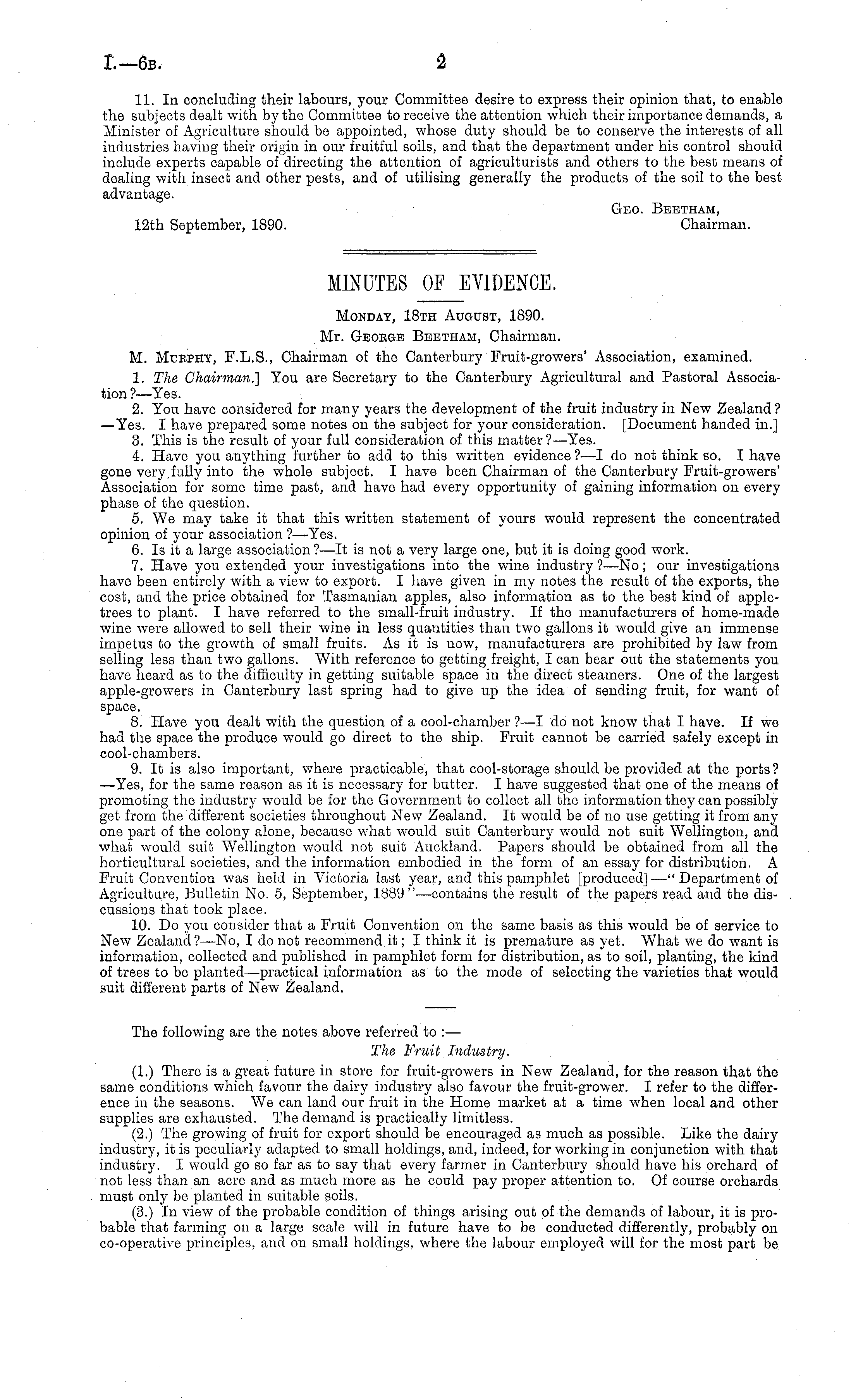 Monday, 18th August, 1890. Mr. Gbobge Beetham, Chairman. M. Merphy, F.L.S., Chairman of the Canterbury Fruit-growers' Association, examined. 1. The Chairman.'] You are Secretary to the Canterbury Agricultural and Pastoral Association?— Yes. 2. You have considered for many years the development of the fruit industry in New Zealand ? —Yes. I have prepared some notes on the subject for your consideration. [Document handed in.] 3. This is the result of your full consideration of this matter?— Yes. 4. Have you anything further to add to this written evidence ?—I do not think so. I have gone very fully into the whole subject. I have been Chairman of the Canterbury Fruit-growers' Association for some time past, and have had every opportunity of gaining information on every phase of the question. 5. We may take it that this written statement of yours would represent the concentrated opinion of your association ?—Yes. 6. Is it a large association?—lt is not a very large one, but it is doing good work. 7. Have you extended your investigations into the wine industry?—No; our investigations have been entirely with a view to export. I have given in my notes the result of the exports, the cost, and the price obtained for Tasmanian apples, also information as to the best kind of appletrees to plant. I have referred to the small-fruit industry. If the manufacturers of home-made wine were allowed to sell their wine in less quantities than two gallons it would give an immense impetus to the growth of small fruits. As it is now, manufacturers are prohibited by law from selling less than two gallons. With reference to getting freight, I can bear out the statements you have heard as to the difficulty in getting suitable space in the direct steamers. One of the largest apple-growers in Canterbury last spring had to give up the idea of sending fruit, for want of space. 8. Have you dealt with the question of a cool-chamber ? —I do not know that I have. If we had the space the produce would go direct to the ship. Fruit cannot be carried safely except in cool-chambers. 9. It is also important, where practicable, that cool-storage should be provided at the ports ? —Yes, for the same reason as it is necessary for butter. I have suggested that one of the means of promoting the industry would be for the Government to collect all the information they can possibly get from the different societies throughout New Zealand. It would be of no use getting it from any one part of the colony alone, because what would suit Canterbury would not suit Wellington, and what would suit Wellington would not suit Auckland. Papers should be obtained from all the horticultural societies, and the information embodied in the form of an essay for distribution. A Fruit Convention was held in Victoria last year, and this pamphlet [produced]—" Department of Agriculture, Bulletin No. 5, September, 1889"—contains the result of the papers read and the discussions that took place. 10. Do you consider that a Fruit Convention on the same basis as this would be of service to New Zealand ?—No, Ido not recommend it; I think it is premature as yet. What we do want is information, collected and published in pamphlet form for distribution, as to soil, planting, the kind of trees to be planted—practical information as to the mode of selecting the varieties that would suit different parts of New Zealand.