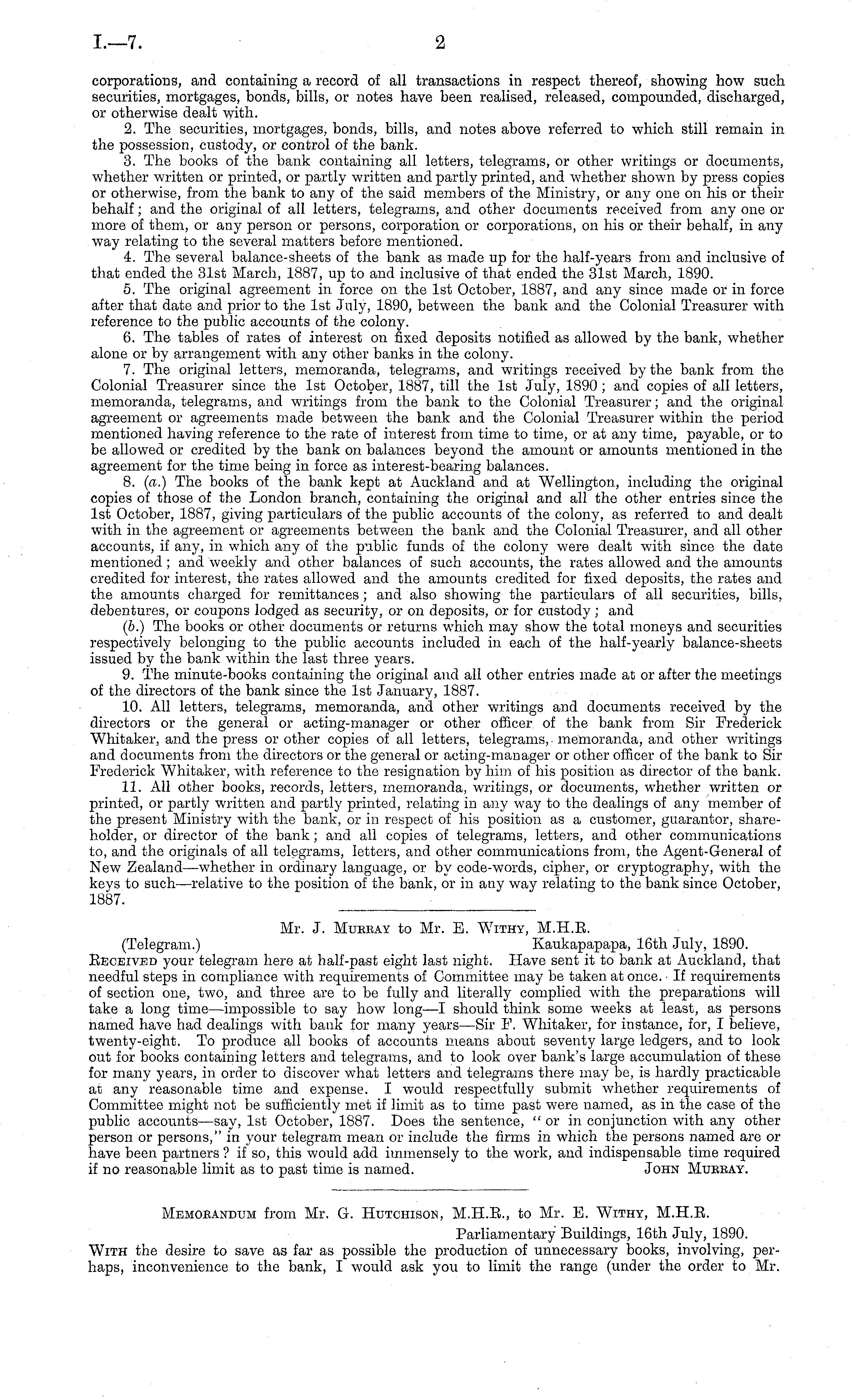 corporations, and containing a record of all transactions in respect thereof, showing how such securities, mortgages, bonds, bills, or notes have been realised, released, compounded, discharged, or otherwise dealt with. 2. The securities, mortgages, bonds, bills, and notes above referred to which still remain in the possession, custody, or control of the bank. 3. The books of the bank containing all letters, telegrams, or other writings or documents, whether written or printed, or partly written and partly printed, and whether shown by press copies or otherwise, from the bank to any of the said members of the Ministry, or any one on his or their behalf; and the original of all letters, telegrams, and other documents received from any one or more of them, or any person or persons, corporation or corporations, on his or their behalf, in any way relating to the several matters before mentioned. 4. The several balance-sheets of the bank as made up for the half-years from and inclusive of that ended the 31st March, 1887, up to and inclusive of that ended the 31st March, 1890. 5. The original agreement in force on the Ist October, 1887, and any since made or in force after that date and prior to the Ist July, 1890, between the bank and the Colonial Treasurer with reference to the public accounts of the colony. 6. The tables of rates of interest on fixed deposits notified as allowed by the bank, whether alone or by arrangement with any other banks in the colony. 7. The original letters, memoranda, telegrams, and writings received by the bank from the Colonial Treasurer since the Ist October, 1887, till the Ist July, 1890; and copies of all letters, memoranda, telegrams, and writings from the bank to the Colonial Treasurer; and the original agreement or agreements made between the bank and the Colonial Treasurer within the period mentioned having reference to the rate of interest from time to time, or at any time, payable, or to be allowed or credited by the bank on balances beyond the amount or amounts mentioned in the agreement for the time being in force as interest-bearing balances. 8. (a.) The books of the bank kept at Auckland and at Wellington, including the original copies of those of the London branch, containing the original and all the other entries since the Ist October, 1887, giving particulars of the public accounts of the colony, as referred to and dealt with in the agreement or agreements between the bank and the Colonial Treasurer, and all other accounts, if any, in which any of the public funds of the colony were dealt with since the date mentioned; and weekly and other balances of such accounts, the rates allowed and the amounts credited for interest, the rates allowed and the amounts credited for fixed deposits, the rates and the amounts charged for remittances ; and also showing the particulars of all securities, bills, debentures, or coupons lodged as security, or on deposits, or for custody ; and (b.) The books or other documents or returns which may show the total moneys and securities respectively belonging to the public accounts included in each of the half-yearly balance-sheets issued by the bank within the last three years. 9. The minute-books containing the original and all other entries made at or after the meetings of the directors of the bank since the Ist January, 1887. 10. All letters, telegrams, memoranda, and other writings and documents received by the directors or the general or acting-manager or other officer of the bank from Sir Frederick Whitaker, and the press or other copies of all letters, telegrams, memoranda, and other writings and documents from the directors or the general or acting-manager or other officer of the bank to Sir Frederick Whitaker, with reference to the resignation by him of his position as director of the bank. 11. All other books, records, letters, memoranda, writings, or documents, whether written or printed, or partly written and partly printed, relating in any way to the dealings of any member of the present Ministry with the bank, or in respect of his position as a customer, guarantor, shareholder, or director of the bank ; and all copies of telegrams, letters, and other communications to, and the originals of all telegrams, letters, and other communications from, the Agent-General of New Zealand—whether in ordinary language, or by code-words, cipher, or cryptography, with the keys to such—relative to the position of the bank, or in any way relating to the bank since October, 1887.