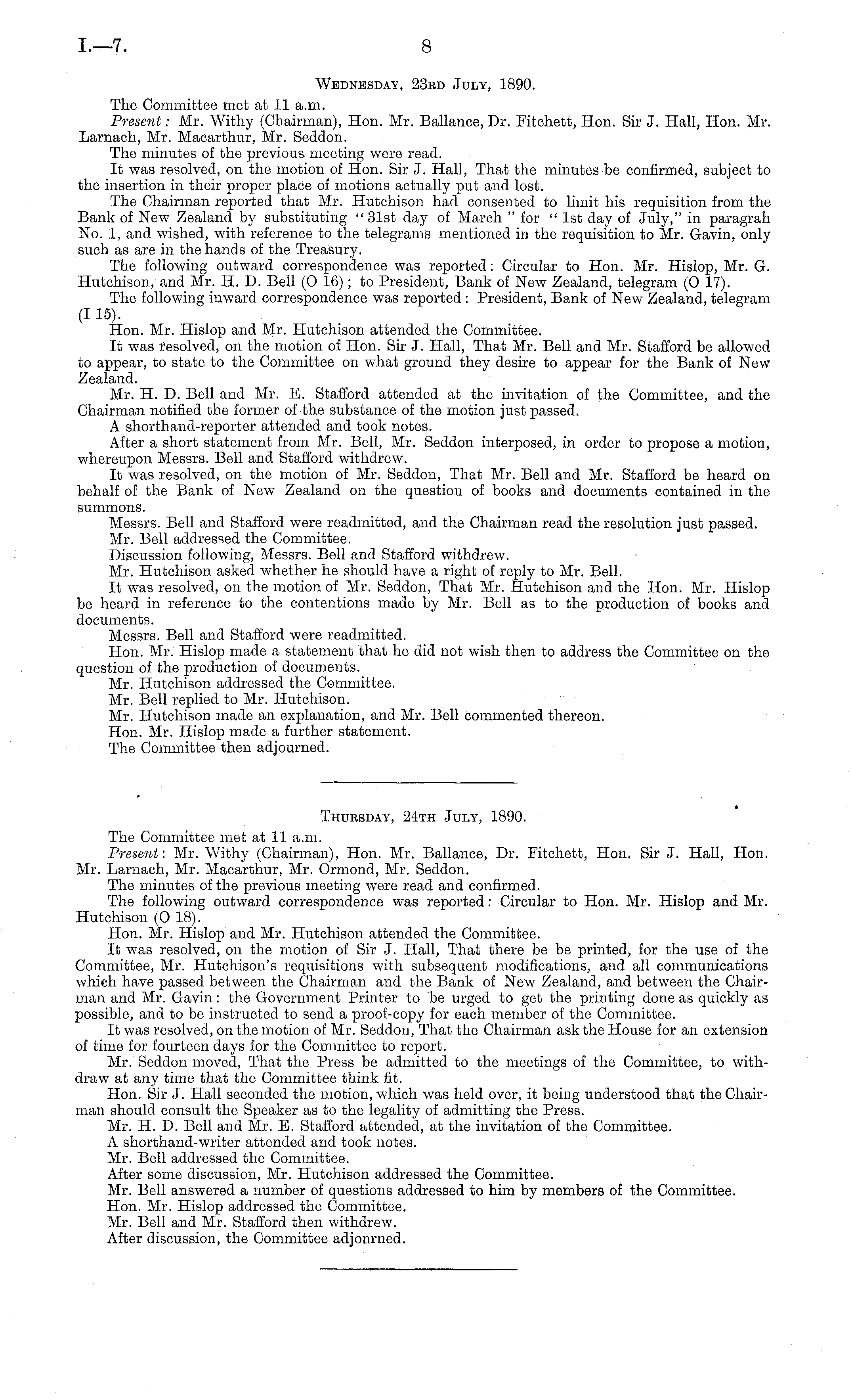 Thursday, 24th July, 1890. The Committee met at 11 a.m. Present : Mr. Withy (Chairman), Hon. Mr. Ballance, Dr. Fitchett, Hon. Sir J. Hall, Hon. Mr. Larnach, Mr. Macarthur, Mr. Ormond, Mr. Seddon. The minutes of the previous meeting were read and confirmed. The following outward correspondence was reported: Circular to Hon. Mr. Hislop and Mr. Hutchison (0 18). Hon. Mr. Hislop and Mr. Hutchison attended the Committee. It was resolved, on the motion of Sir J. Hall, That there be be printed, for the use of the Committee, Mr. Hutchison's requisitions with subsequent modifications, and all communications which have passed between the Chairman and the Bank of New Zealand, and between the Chairman and Mr. Gavin: the Government Printer to be urged to get the printing done as quickly as possible, and to be instructed to send a proof-copy for each member of the Committee. It was resolved, on the motion of Mr. Seddon, That the Chairman ask the House for an extension of time for fourteen days for the Committee to report. Mr. Seddon moved, That the Press be admitted to the meetings of the Committee, to withdraw at any time that the Committee think fit. Hon. Sir J. Hall seconded the motion, which was held over, it being understood that the Chairman should consult the Speaker as to the legality of admitting the Press. Mr. H. D. Bell and Mr. E. Stafford attended, at the invitation of the Committee. A shorthand-writer attended and took notes. Mr. Bell addressed the Committee. After some discussion, Mr. Hutchison addressed the Committee. Mr. Bell answered a number of questions addressed to him by members of the Committee. Hon. Mr. Hislop addressed the Committee. Mr. Bell and Mr. Stafford then withdrew. After discussion, the Committee adjonrned.
