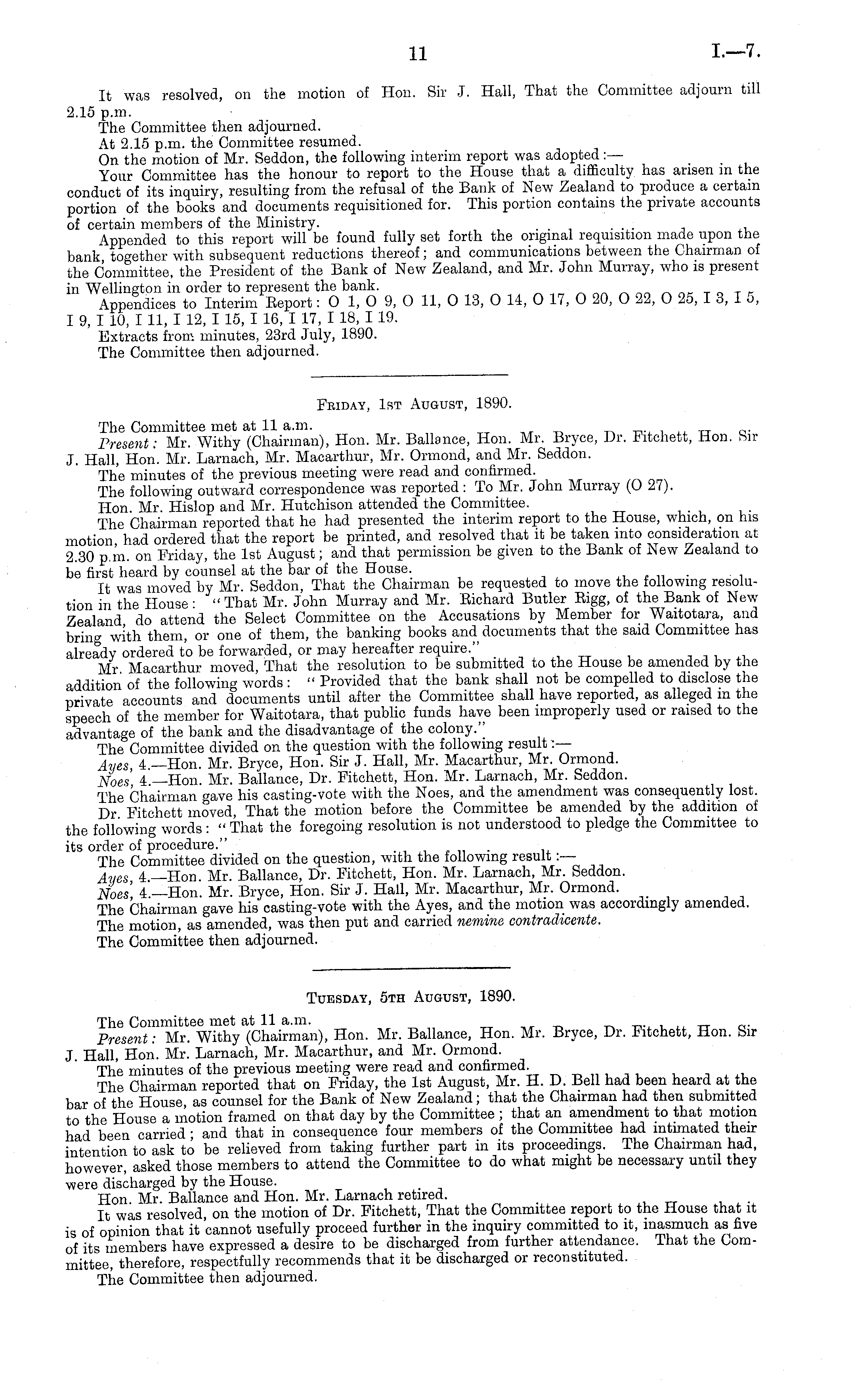 Tuesday, sth August, 1890. The Committee met at 11 a.m. • Present: Mr. Withy (Chairman), Hon. Mr. Ballance, Hon. Mr. Bryce, Dr. Fitchett, Hon. Sir J. Hall, Hon. Mr. Larnach, Mr. Macarthur, and Mr. Ormond. The minutes of the previous meeting were read and confirmed. The Chairman reported that on Friday, the Ist August, Mr. H. D. Bell had been heard at the bar of the House as counsel for the Bank of New Zealand; that the Chairman had then submitted to the House a motion framed on that day by the Committee ; that an amendment to that motion had been carried; and that in consequence four members of the Committee had intimated their intention to ask to be relieved from taking further part in its proceedings. The Chairman had, however, asked those members to attend the Committee to do what might be necessary until they were discharged by the House. . Hon. Mr. Ballance and Hon. Mr. Larnach retired. It was resolved, on the motion of Dr. Fitchett, That the Committee report to the House that it is of opinion that it cannot usefully proceed further in the inquiry committed to it, inasmuch as five of its members have expressed a desire to be discharged from further attendance. That the Committee, therefore, respectfully recommends that it be discharged or reconstituted. The Committee then adjourned.